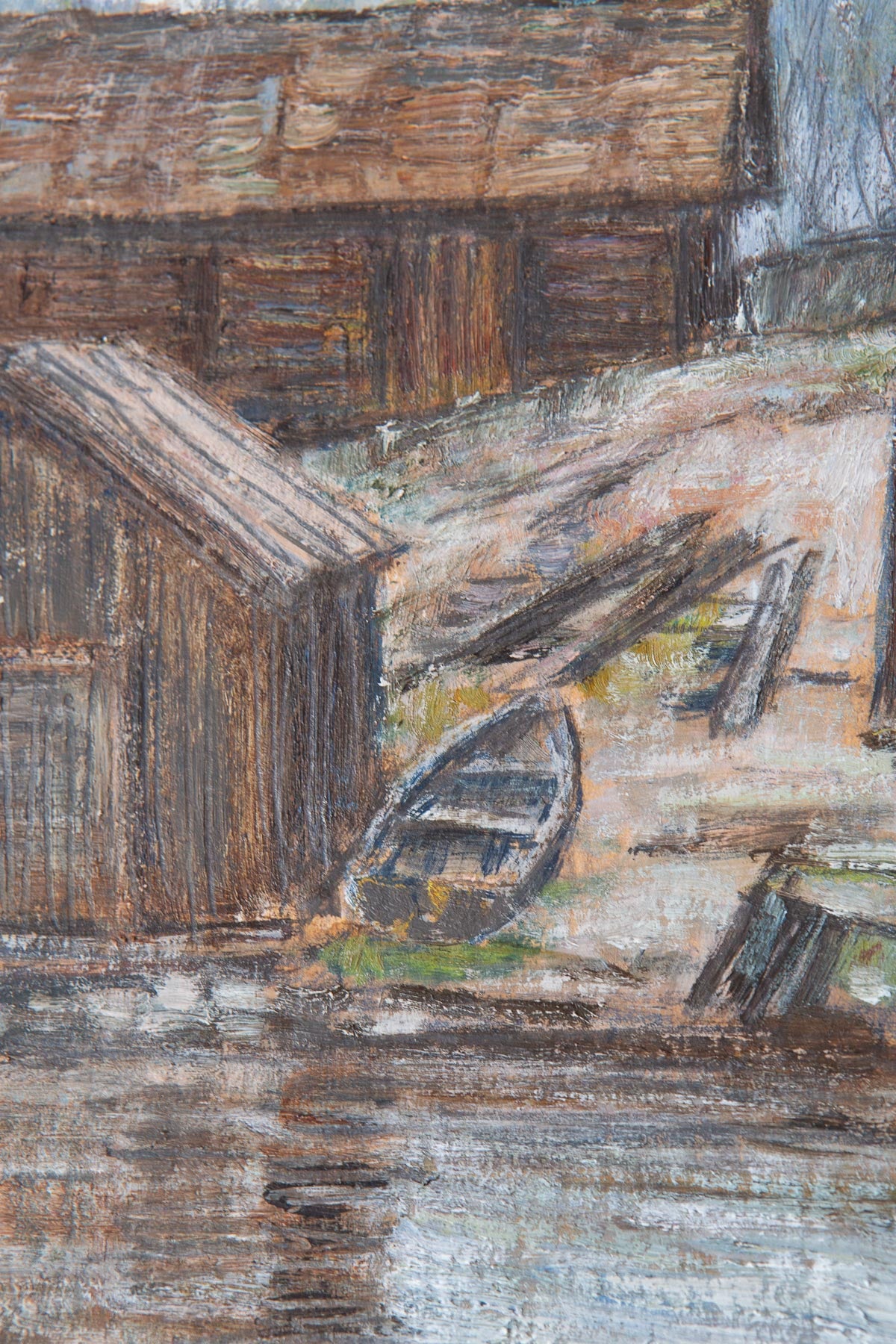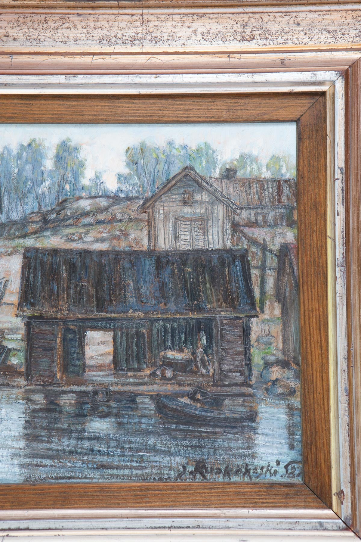 Obra del pintor finlandés Jalmari Ruokokoski, realizada probablemente en la década de 1920. Representa un paisaje nórdico con edificaciones de madera junto al agua, tratado con una paleta sobria y pincelada libre. El uso expresivo del color y la energía de la materia pictórica son característicos del expresionismo finlandés de principios del siglo XX.