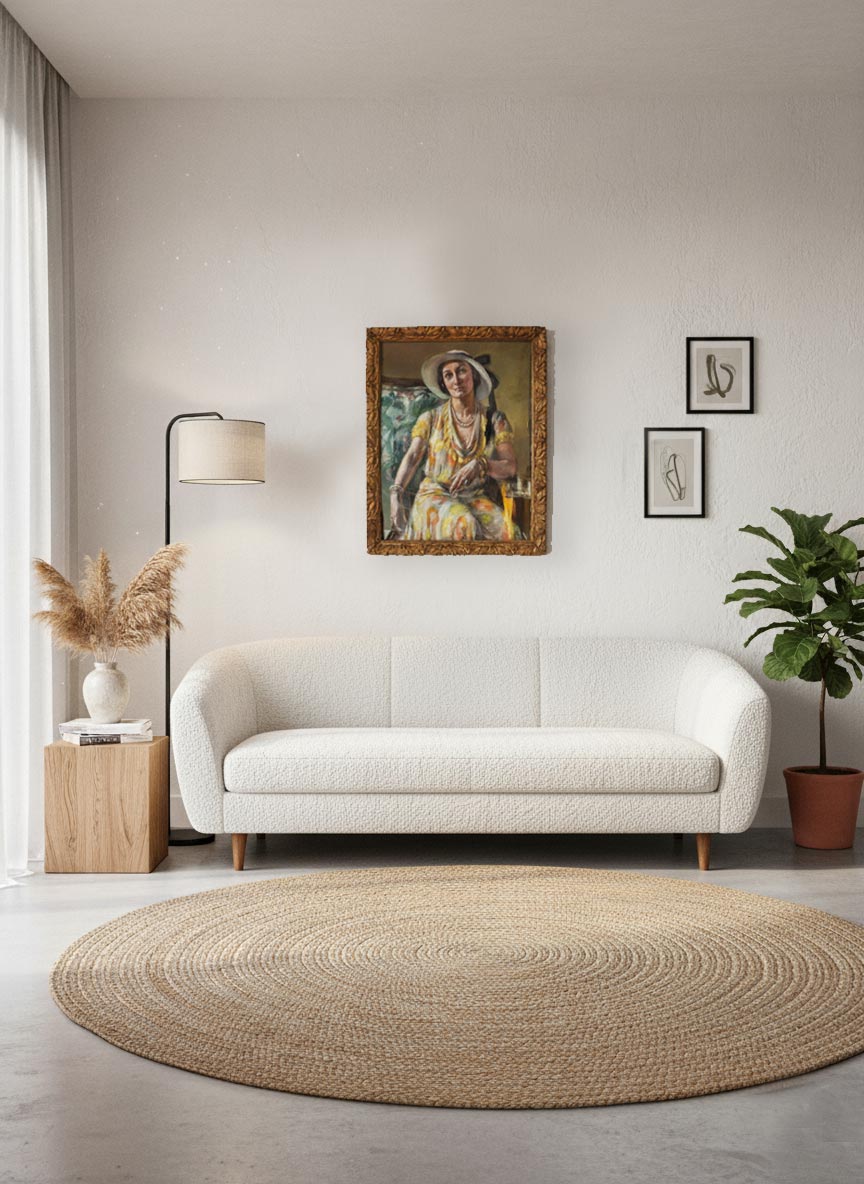 Female portrait in pastel by the French artist Fanny Billaud, dated 1932. The figure is depicted seated, wearing a white hat and a warm-toned patterned dress. The artist works with a vibrant palette. The artwork retains its original wooden frame, gilded in a dark copper tone, with some restorations. It also keeps its original blown glass. In the lower part of the pastel there are traces of moisture, which blend to a great extent with the artist’s strokes, though they are present. The back has been reinforced with steel crossbars in order to firmly keep the glass, backing board, and frame securely together. The piece will be shipped exactly as shown in the images. We also have another portrait by the same artist, very likely depicting the same woman, signed and dated 1948. You can see both together in the last photograph. Reference 6070. Measurements: With frame: 74 × 58 cm. Without frame: 64 × 49 cm. Shipping costs will be added at checkout.