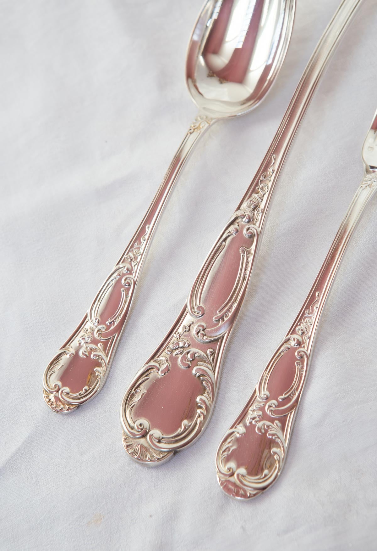 Juego de antiguos cubiertos franceses de la prestigiosa firma ERCUIS de estilo Luis XV. Parece que o están sin estrenar o los han usado un par de veces. Están casi como nuevos. Su baño de plata es el estándar, 84. El juego está formado 25 piezas: 12 cucharas soperas, 12 tenedores de mesa y un cucharón. Su estado de conservación es realmente fantástico. VENDIDOS