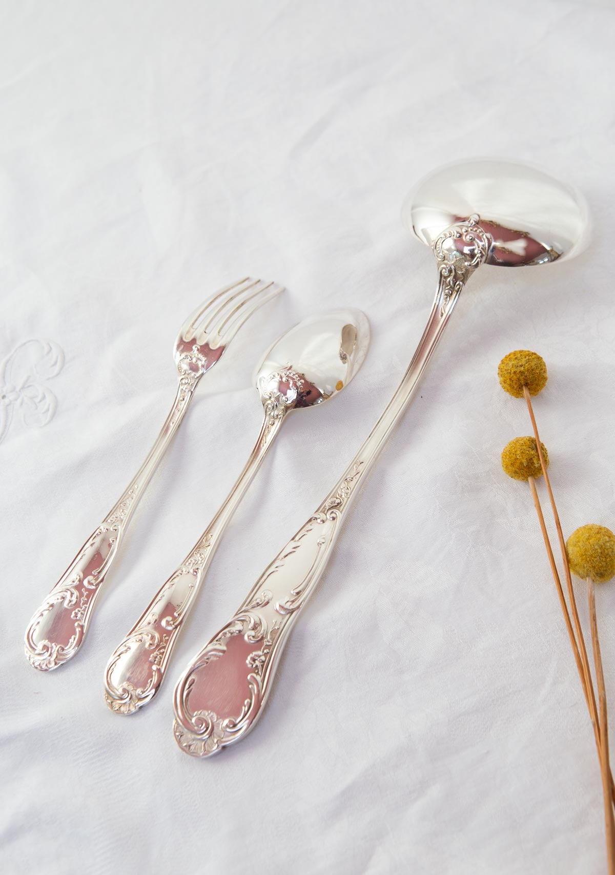 SOLD Set of antique French flatware for 12 by the prestigious ERCUIS firm, with a Louis XV design. The set is composed by 25 pieces: 12 forks, 12 soup spoons and 1 laddle. 84 hallmark. Dimensions: 21,5, 22 and 32 cm. In one of the photo they are displayed with knives ref. 6140, not included. The set has not a case, but it can be purchased with cutlery rolls. Please select the desired option just above. The rolls, which are not sold separately, are custom-made. In this case, 2 rolls will be included: one for the spoons and one for the forks.. We ship worldwide but shipping costs are not included in the price. Contact us for details.