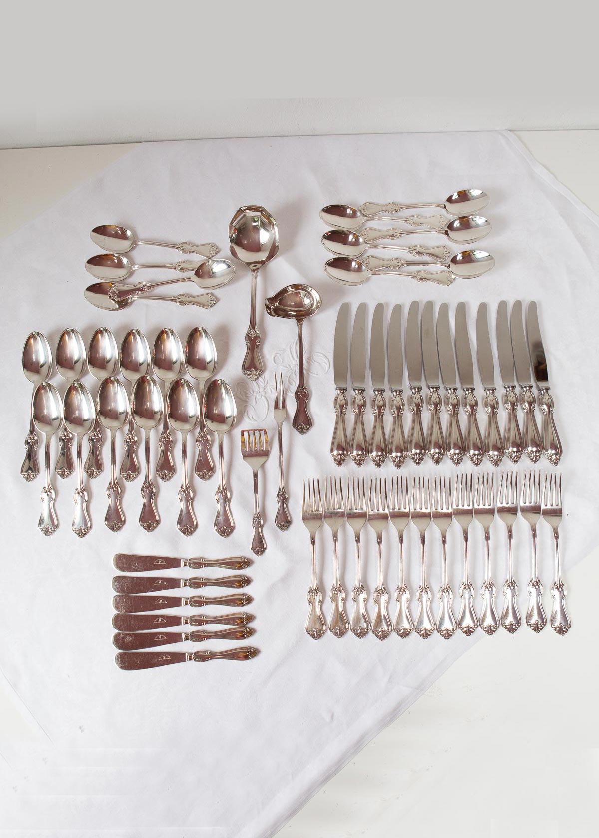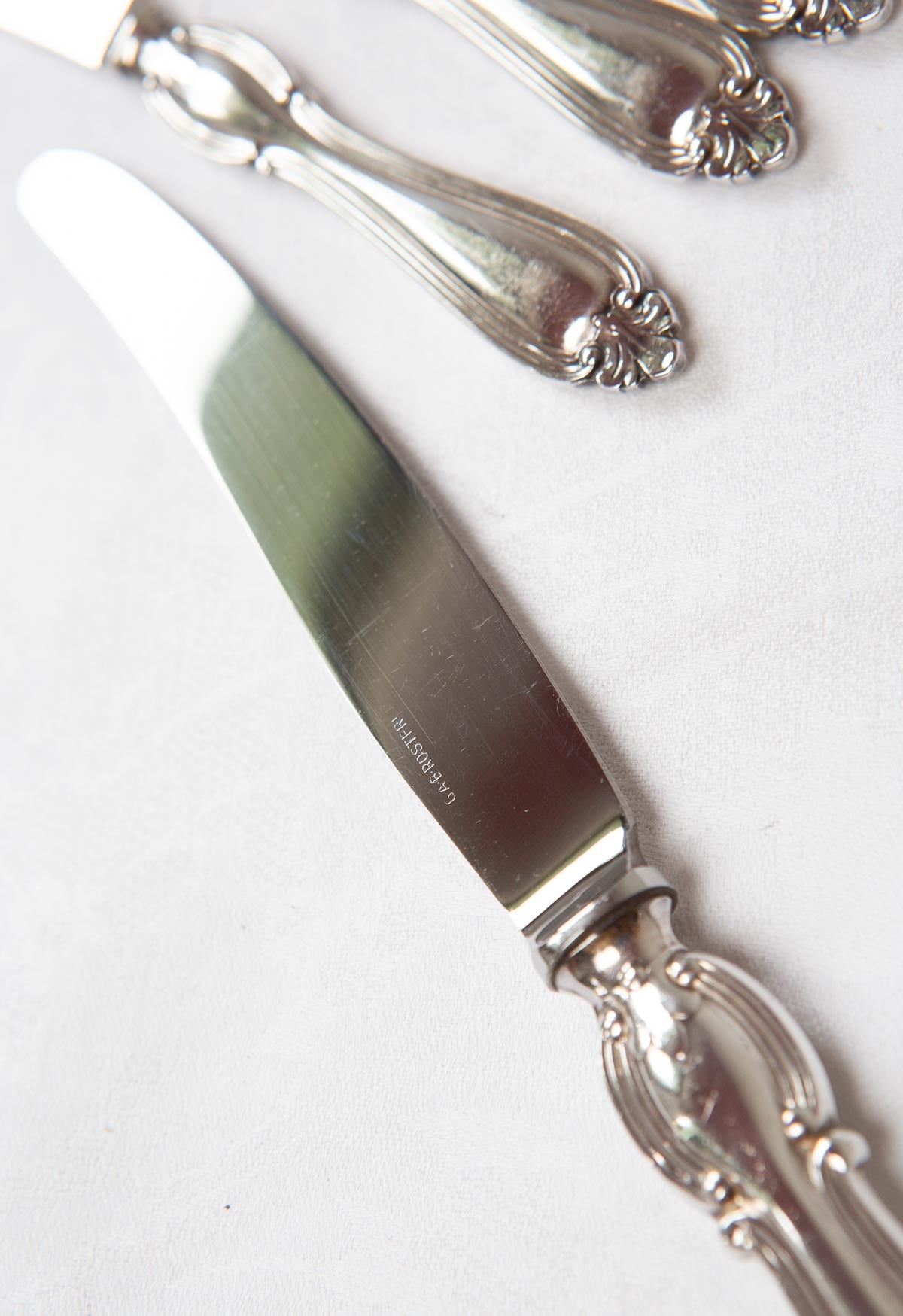 SOLD Set of vintage Swedish GAB top quality cutlery for entremets for 12. The set is composed by 56 pieces, 12 knives, 12 forks, 12 spoons, 6 butter knives, 10 smaller spoons, 4 serving pieces. Dimensions and weight: see description in Spanish. We ship worldwide. Shipping costs will be added at checkout.