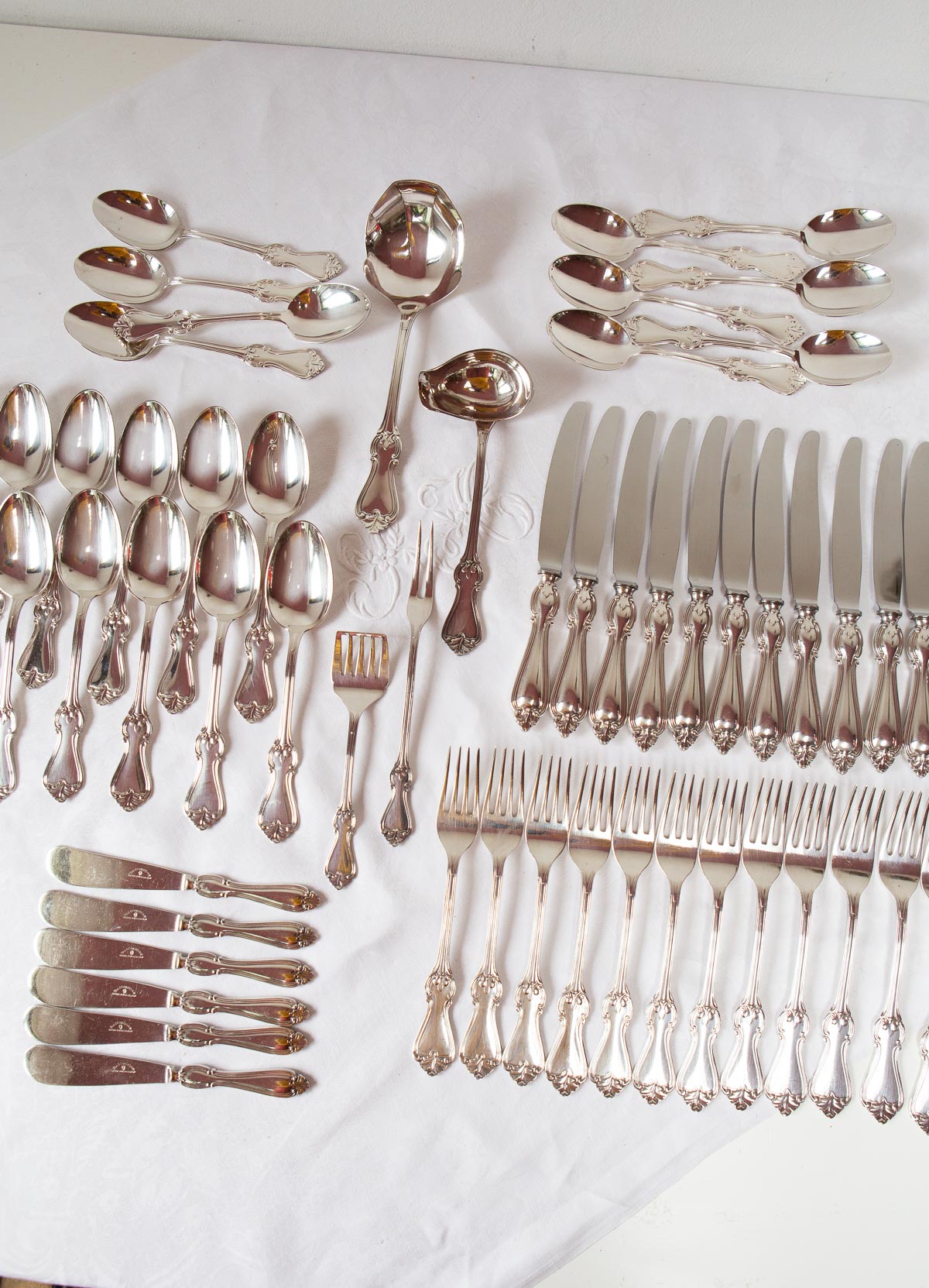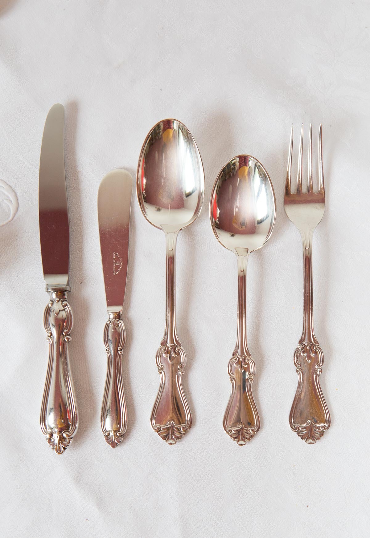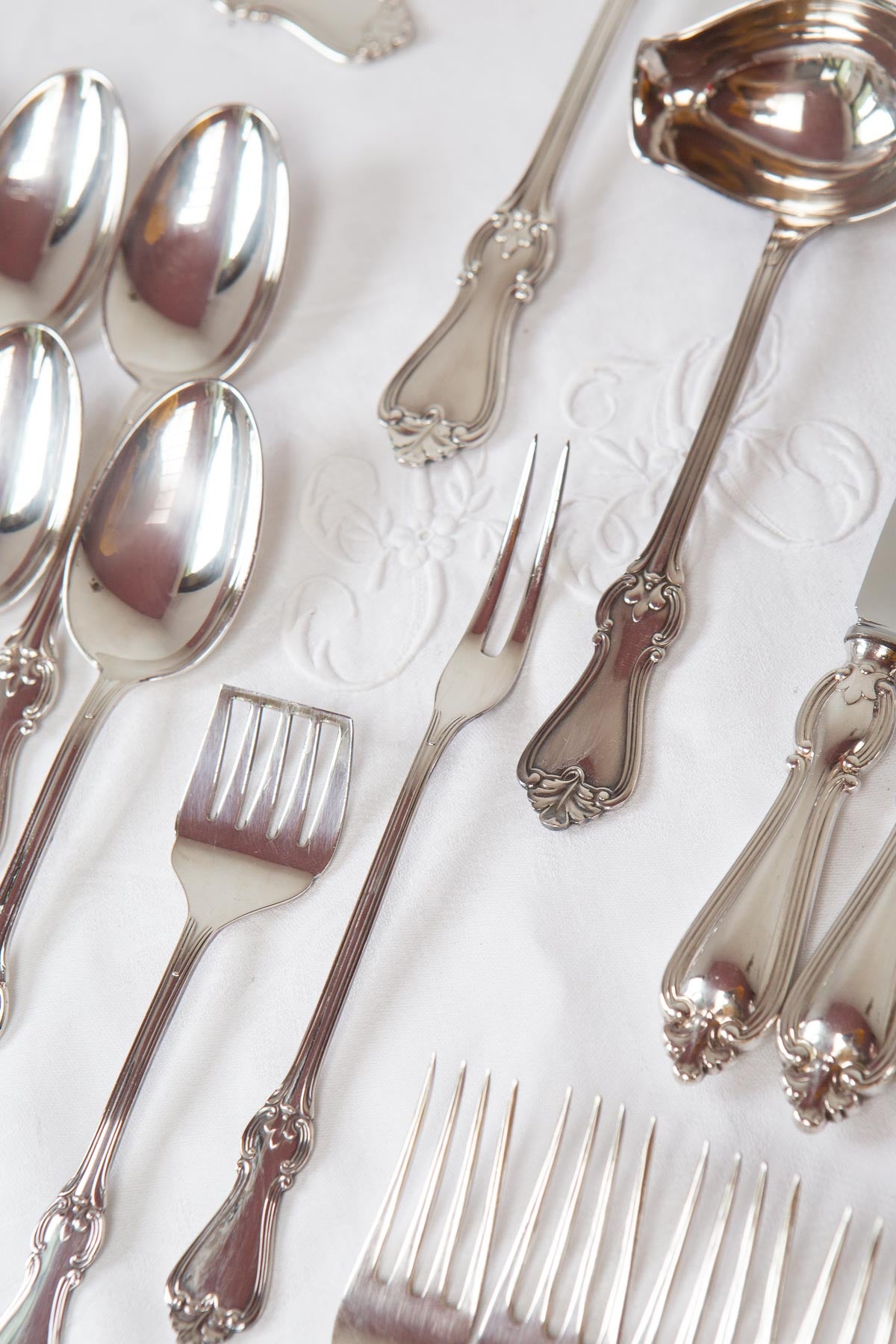 Juego de cubiertos suecos en metal con un baño de plata de gran calidad y de la firma GAB para 12 comensales. Son de la segunda mitad del s. XX, posiblemente finales. Las lamas de los cuchillos son de acero inoxidable de la mayor calidad. Están en un estado de conservación maravilloso, con apenas uso ¿sin estrenar? VENDIDOS