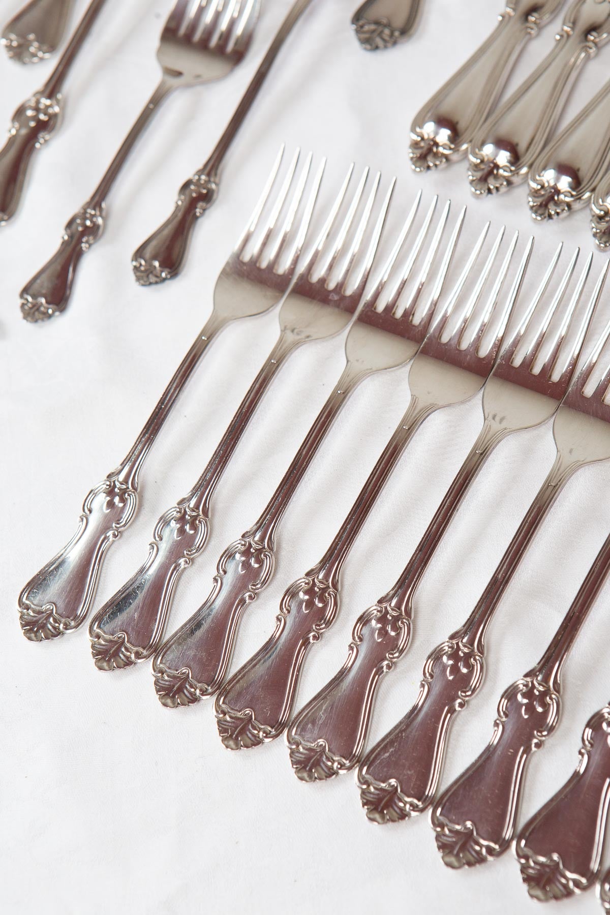 Este juego está formado por las siguientes 56 piezas: 12 cuchillos, 12 tenedores, 12 cucharas, 10 cucharillas, 6 cuchillos para mantequilla, 4 piezas de servir. Ideales para entrantes o postre.