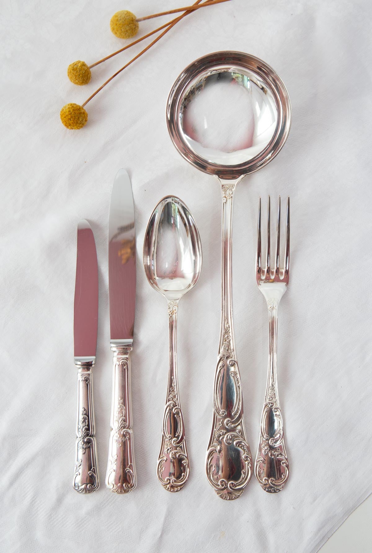 SOLD Set of 24 French Louis XV style entremets and table knives. Great quality and condition. The set is composed by 12 entremets et 12 table knives. Notice the difference in the patina of the silver among the sets. Dimensions and weight: 20,5 and 25,5 cm (67 and 96 grams). They do not retain their original cases, but this set of knives can be purchased with textile rolls or without them. Please select the desired option just above. The rolls, which are not sold separately, are custom-made. We ship worldwide. Shipping costs will be added at checkout.