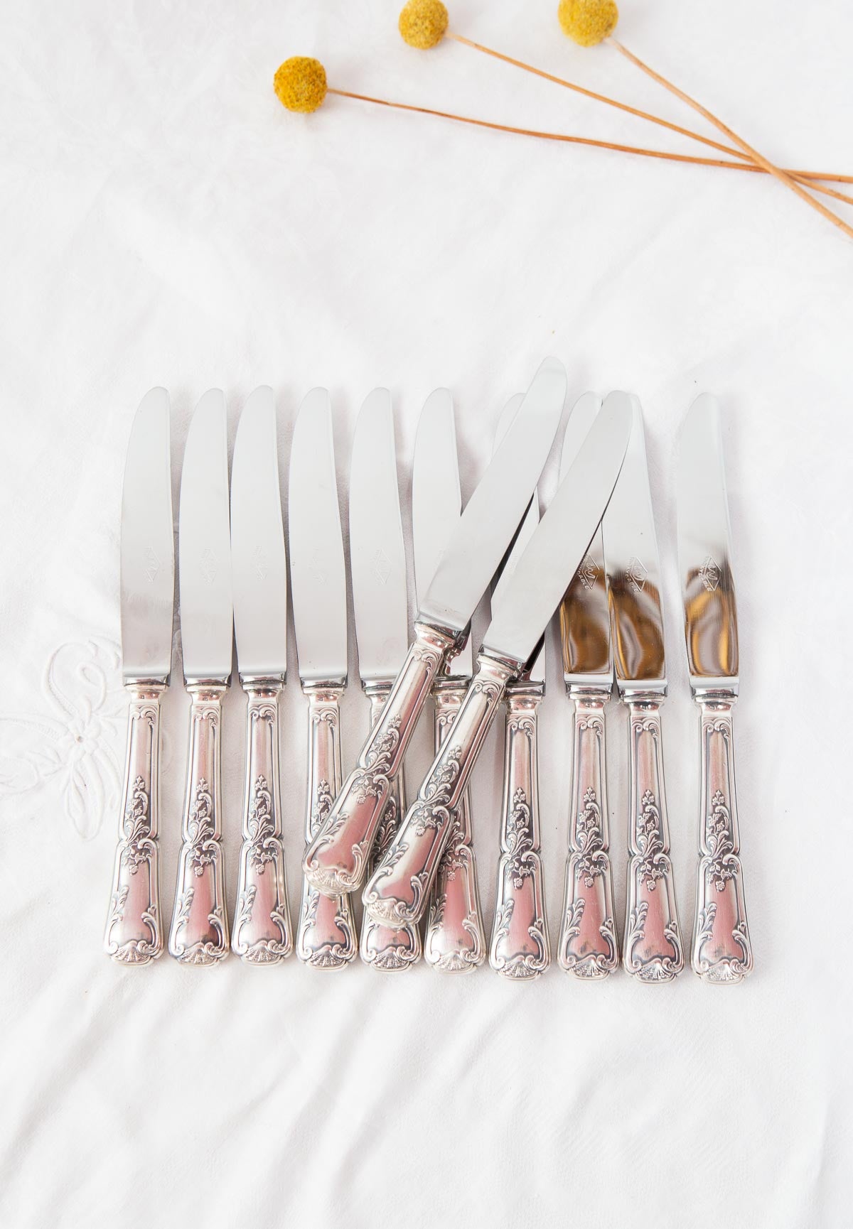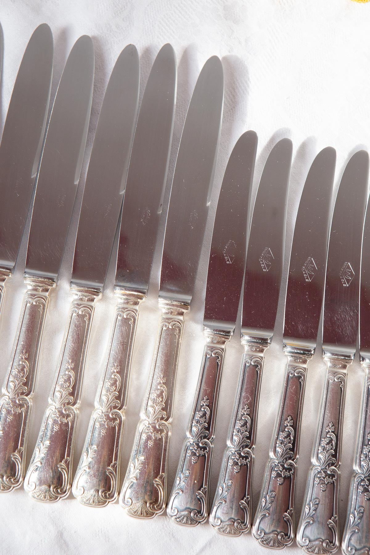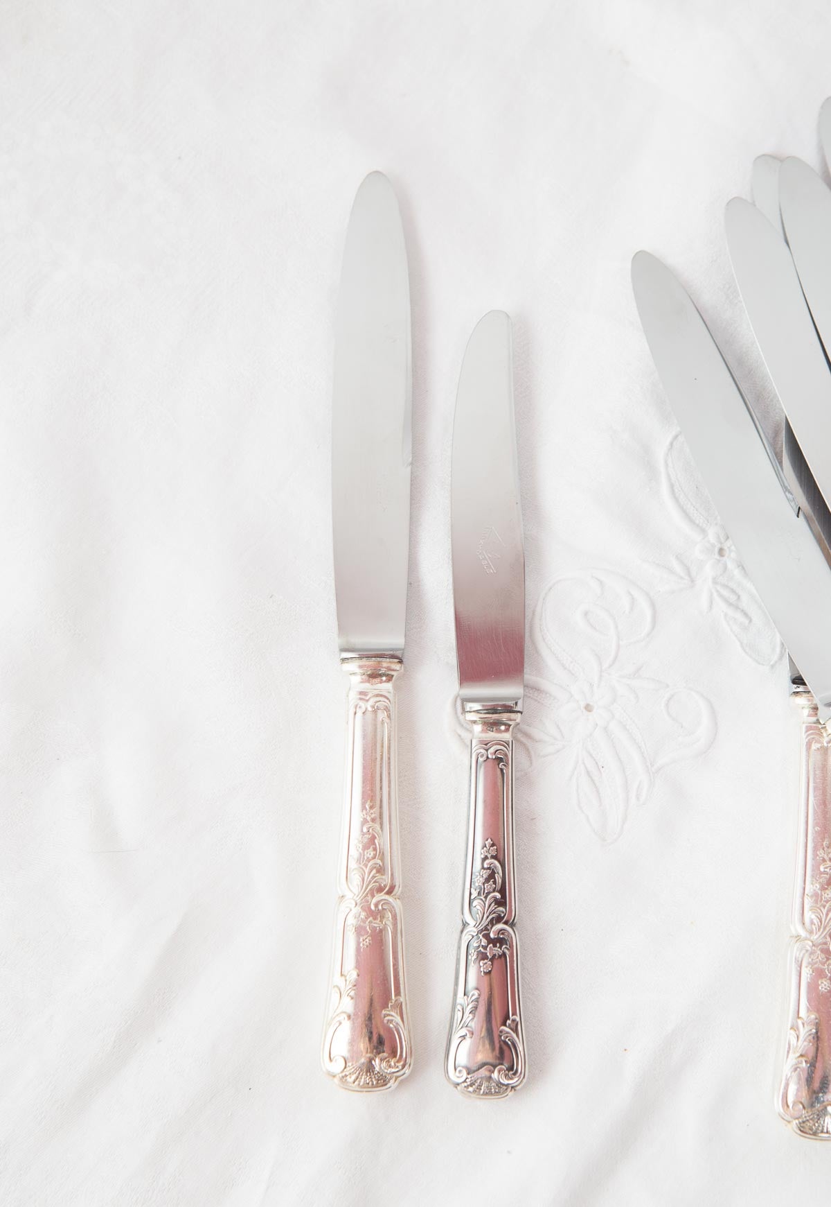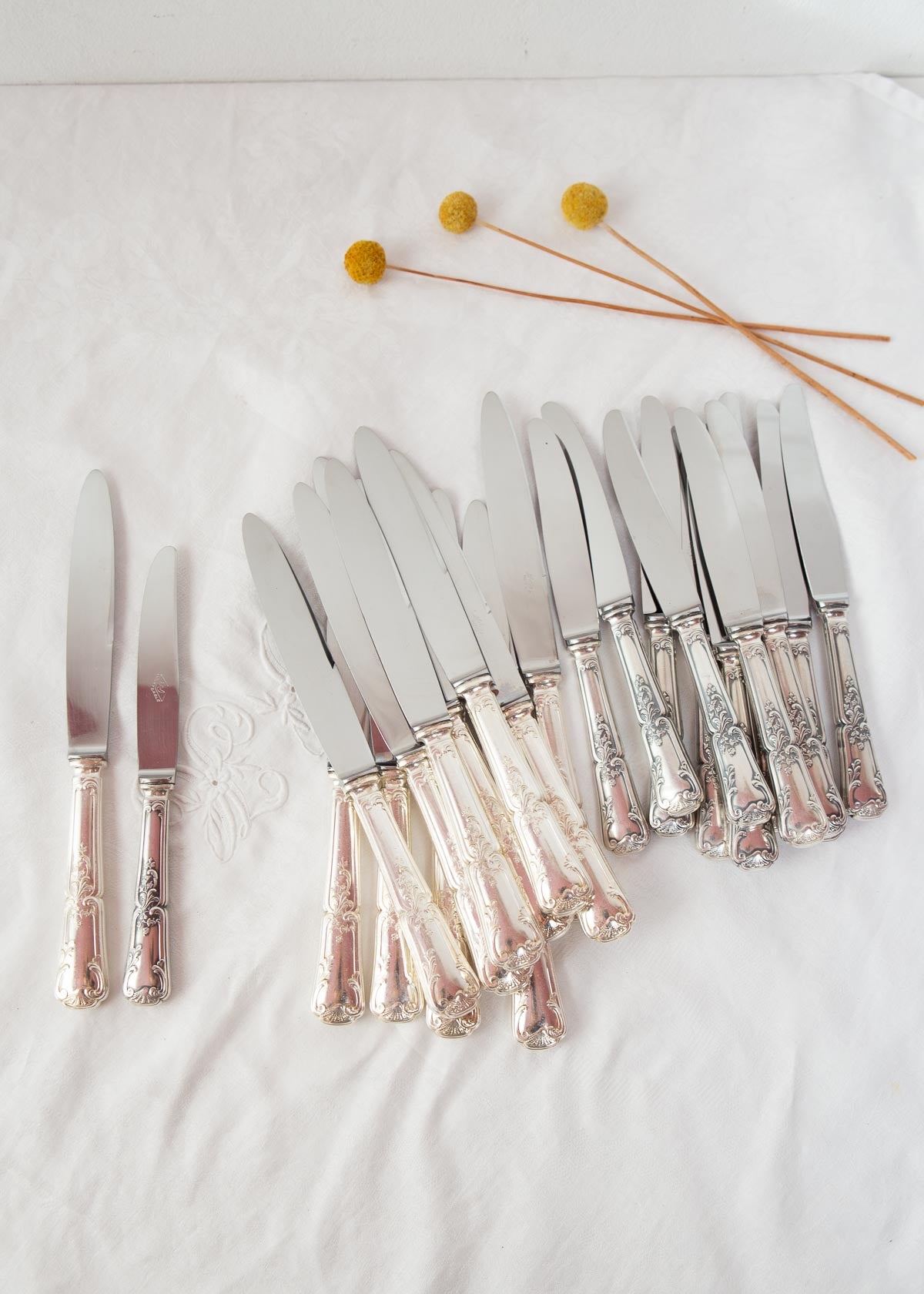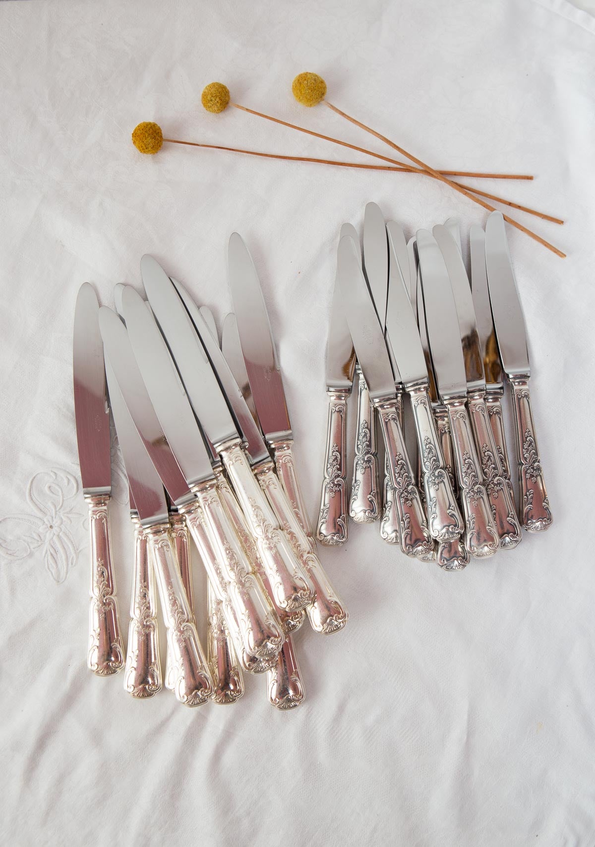 Juego de 24 cuchillos franceses de estilo Louis XV con mangos de metal con baño de plata y lamas de acero inoxidable de gran calidad y de mediados del s. XX. Los cuños no indican orfebre pero hemos tenido el mismo modelo de Le Mondial (referencia 5646). VENDIDOS