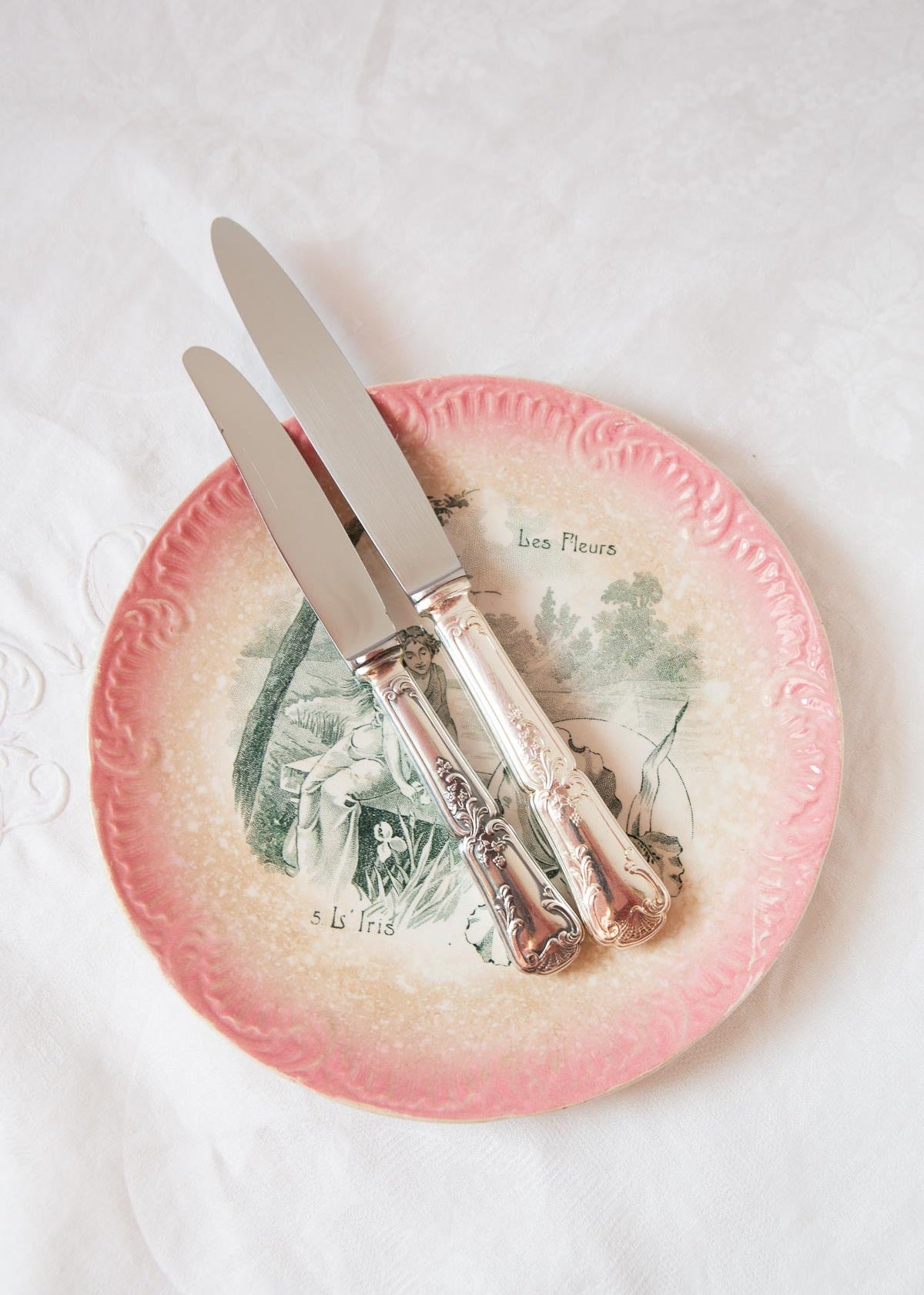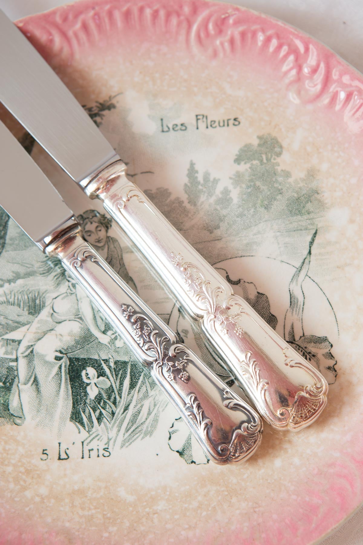 El juego está formado por 12 cuchillos de mesa y 12 cuchillos para entrantes o postre. Como ves, tienen una ligera diferencia en su pátina. Van limpios y relucientes y no hemos podido igualar más el tono de la plata.