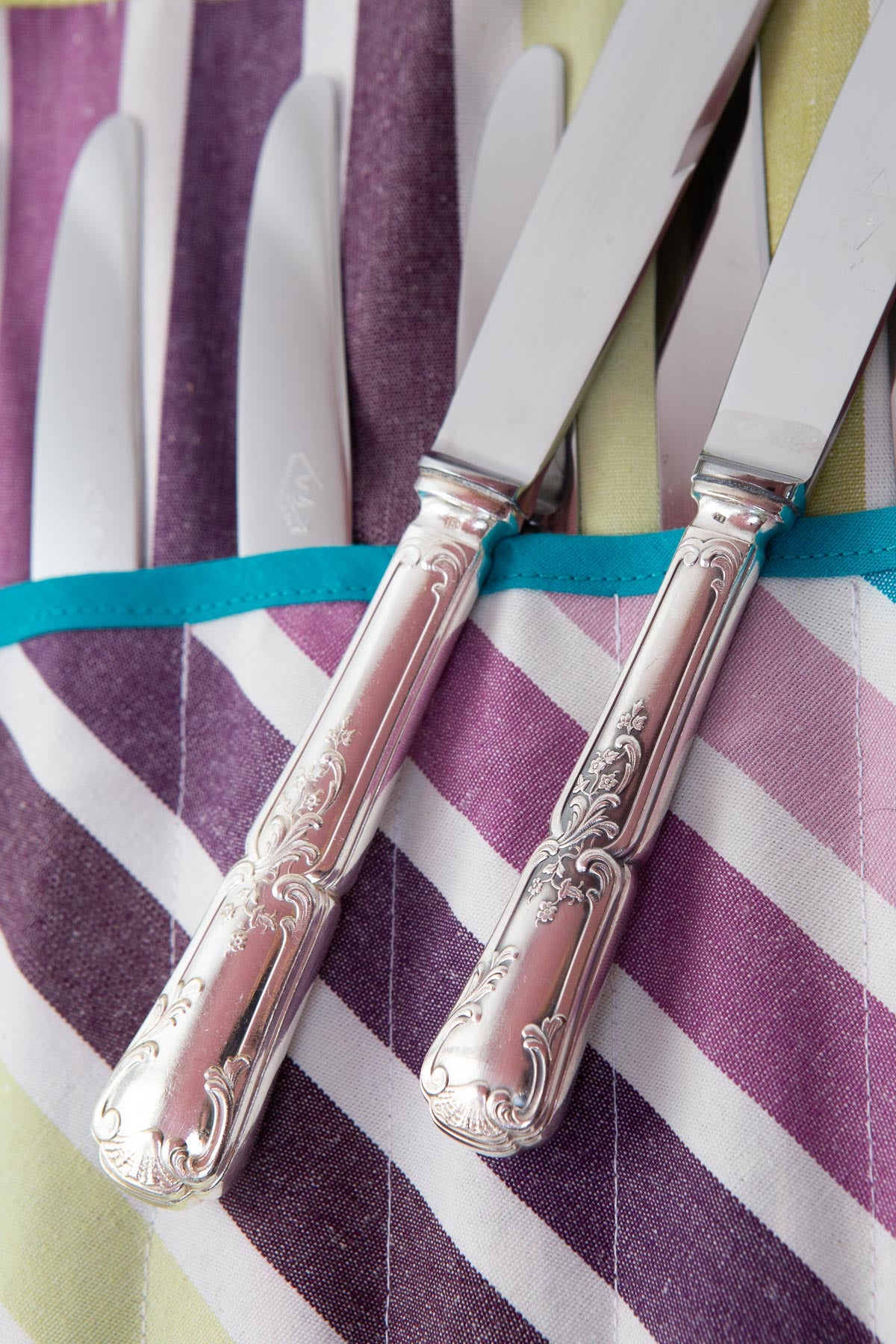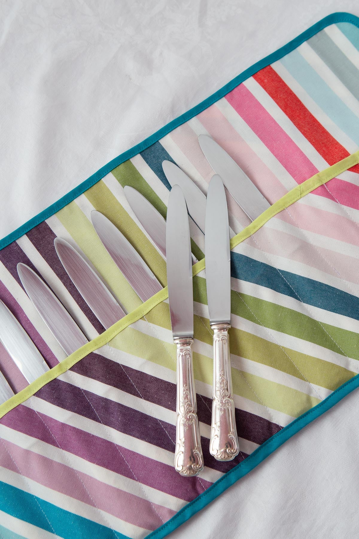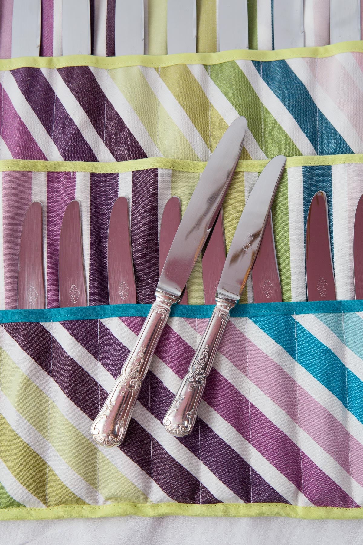 Este juego de cuchillos se puede adquirir con fundas textiles o sin ellas. Selecciona la opción deseada justo aquí encima. Las fundas, que no se venden por separado, están confeccionadas a medida con una loneta de rayas multicolores, vivos en verde pistacho y azul y lazadas de terciopelo de algodón azul. Entres las fotos verás varias de los estuches.