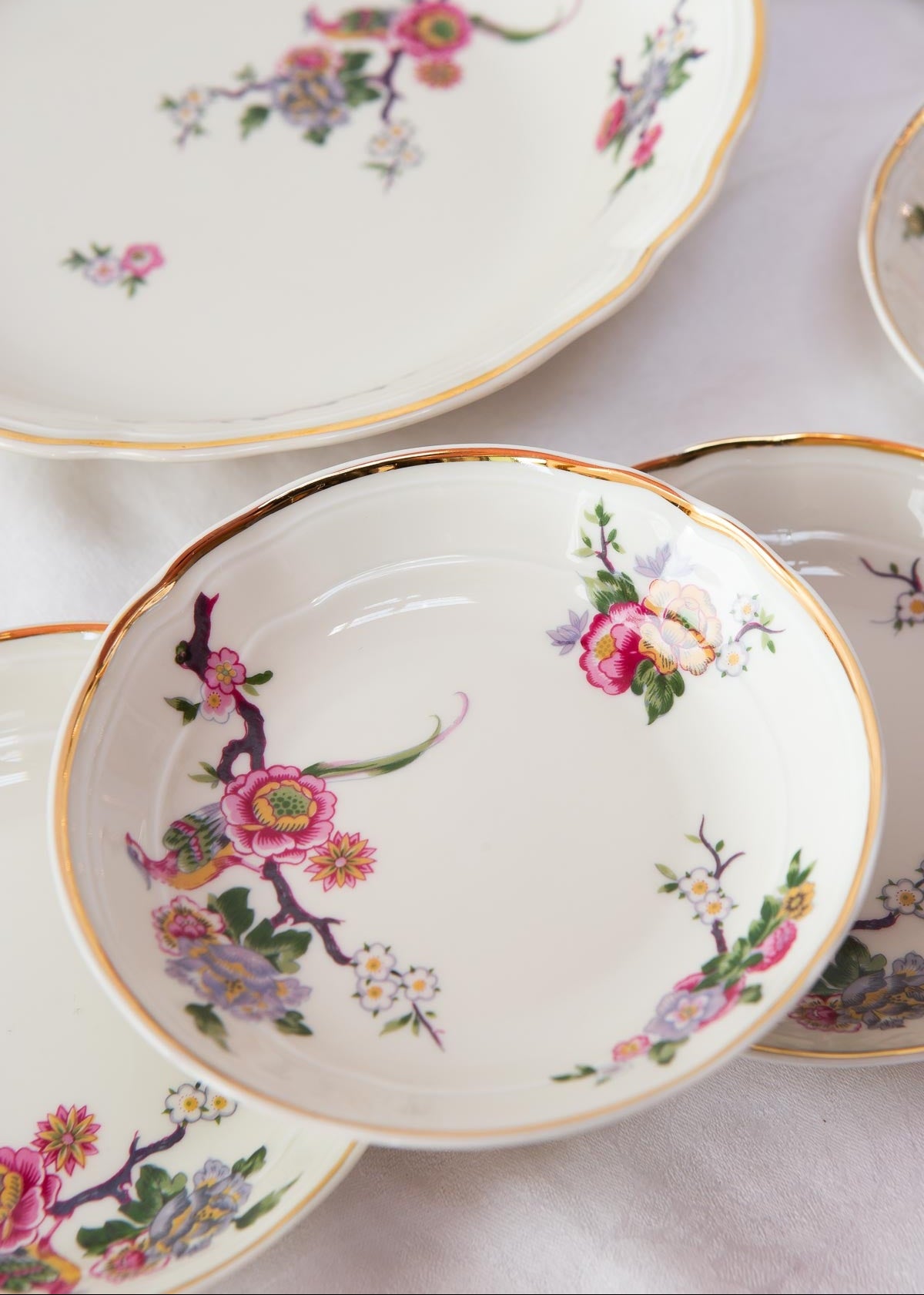 Juego de macedonia en porcelana francesa de la mayor calidad de la prestigiosa firma Bernardaud. Posiblemente sin estrenar ya que está como nuevo. El juego está formado por 1 fuente y 12 cuencos. VENDIDO