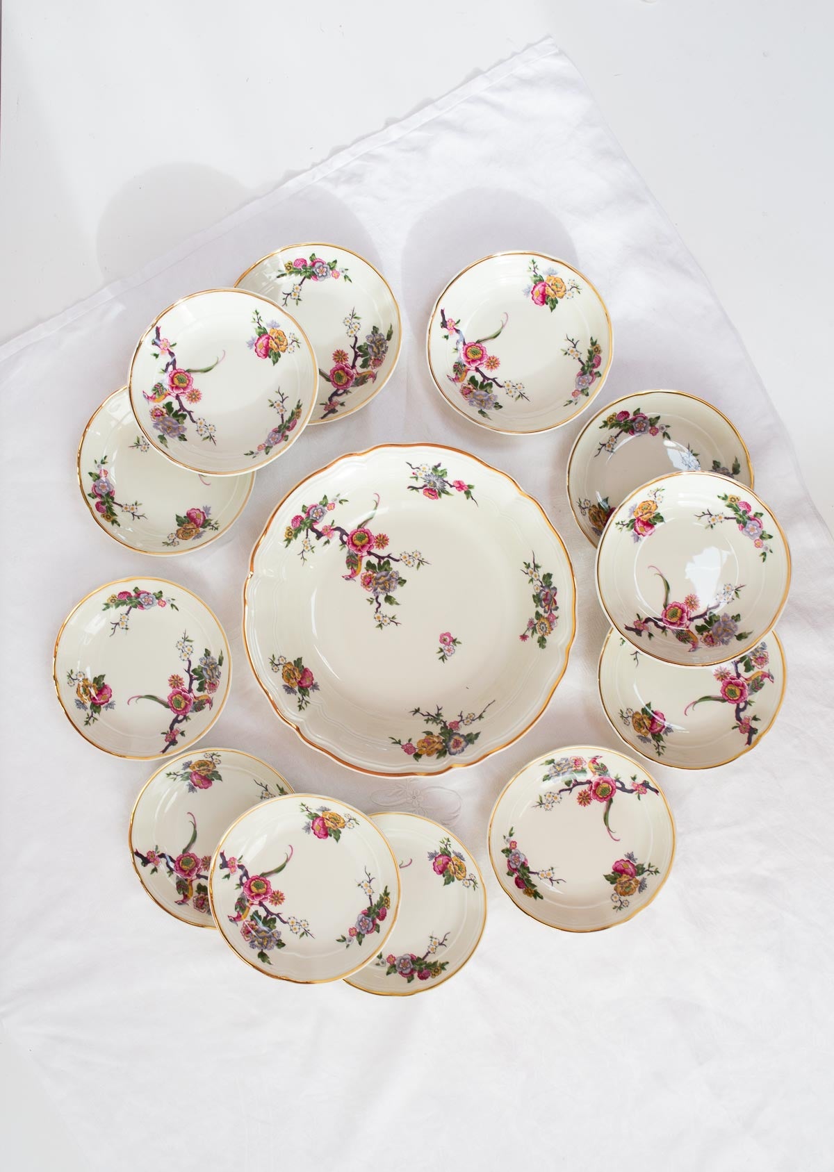 SOLD French porcelain fruit salad set of the highest quality by the prestigious firm Bernardaud. Possibly unused as it is like new. The set consists of 1 serving bowl and 12 smaller bowls.. Dimensions: The serving bowl 24 cm and H 5.5 cm; the bowls measure 13.5 cm and H 3 cm. We ship worldwide. Shipping costs will be added at checkout.