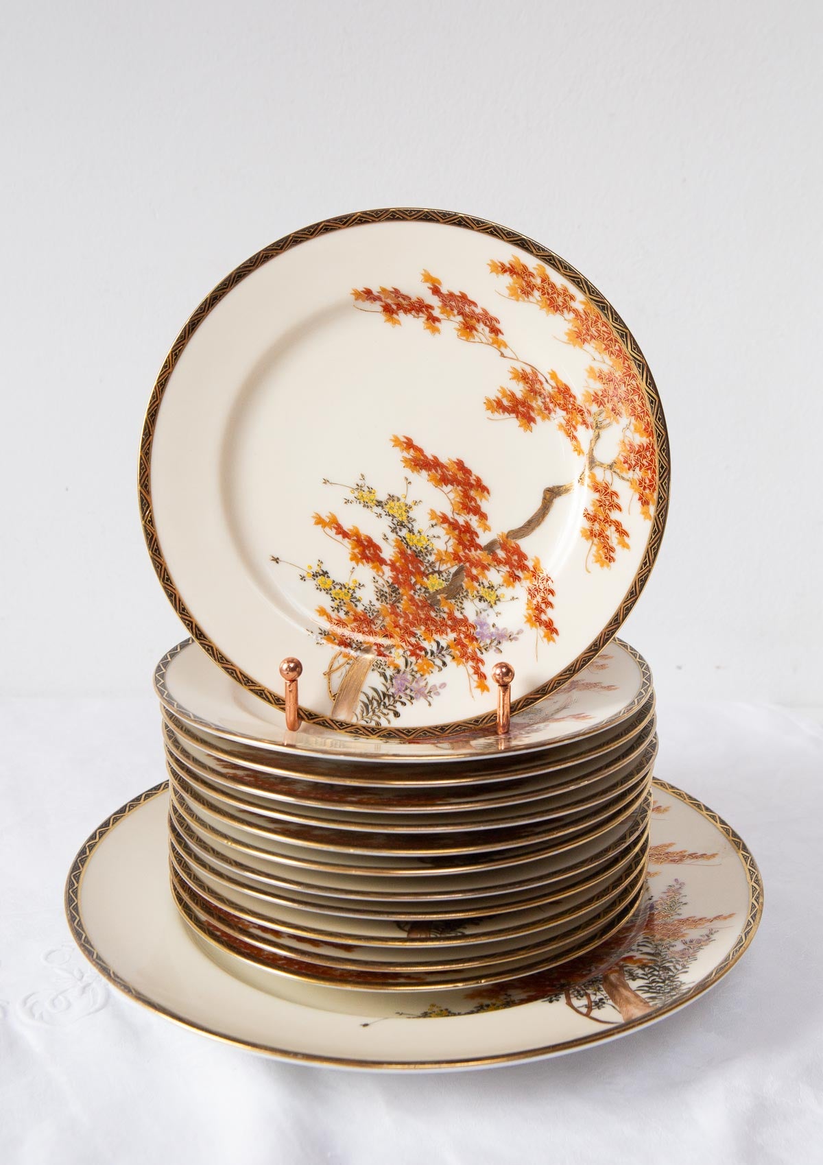Juego de postre en porcelana japonesa para 12 comensales completamente pintado a mano hoja a hoja. Es de una delicadeza increíble y están impecables. Posiblemente sin estrenar o con poquísimo uso. VENDIDO