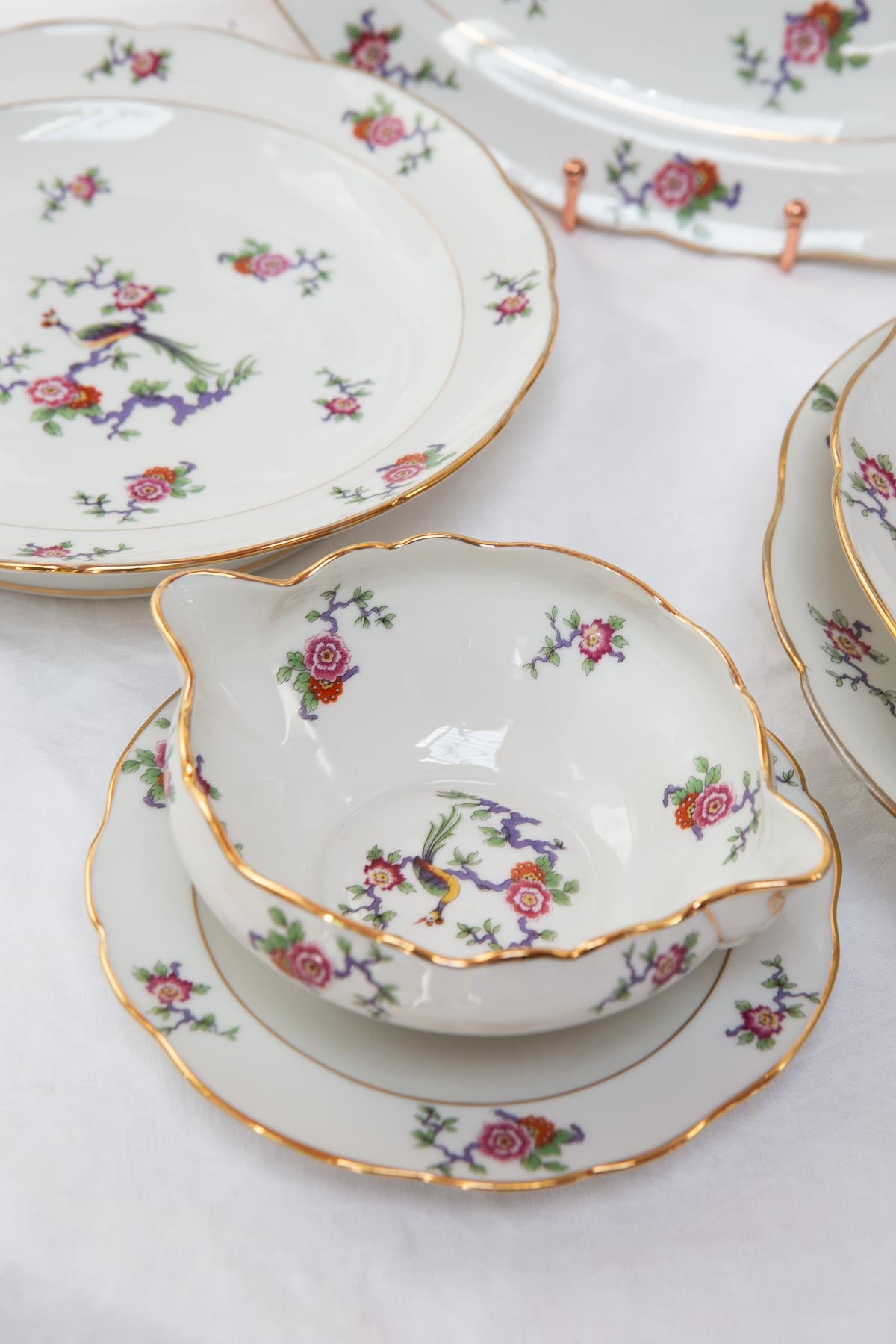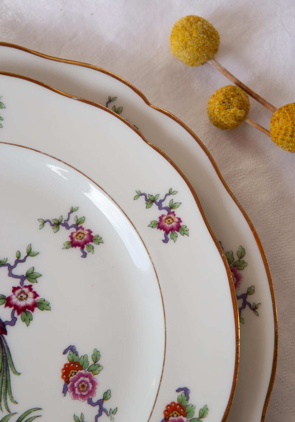 Preciosa vajilla francesa de porcelana Limoges de mediados del s. XX con el diseño "ave del paraíso" y detalles en dorado en un fantástico estado de conservación. VENDIDA