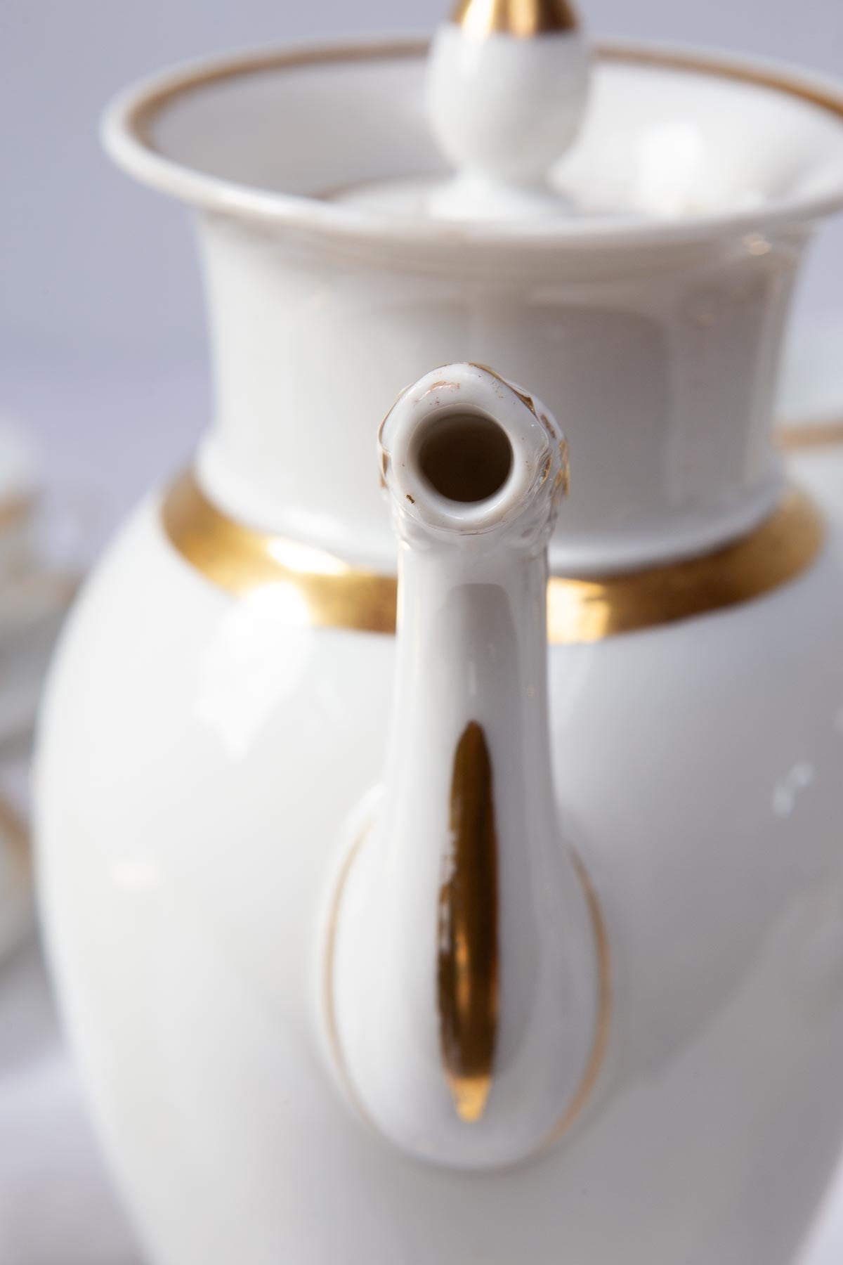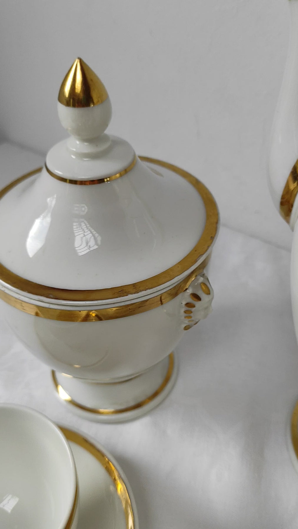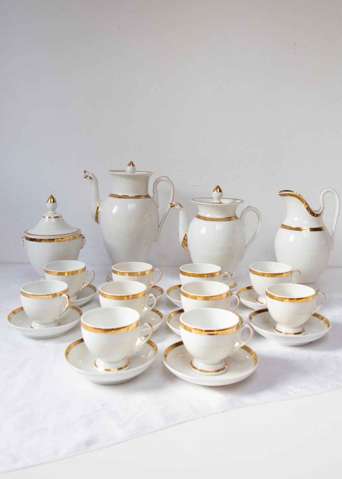 Uno de esos juegos de café o té que destacan por su edad, unos 150 años y su increíble estado de conservación. Juego de porcelana francesa conocida como "viejo París" o "viejo Limoges" que es como se conoce genéricamente a este tipo de porcelana de la segunda mitad del s. XX fabricada en ambos lugares. Con detalles al oro fino pintados a mano y la porcelana impecable. Llaman la atención las asas del azucarero y las bocas de tetera y cafetera que imitan las bocas de animales