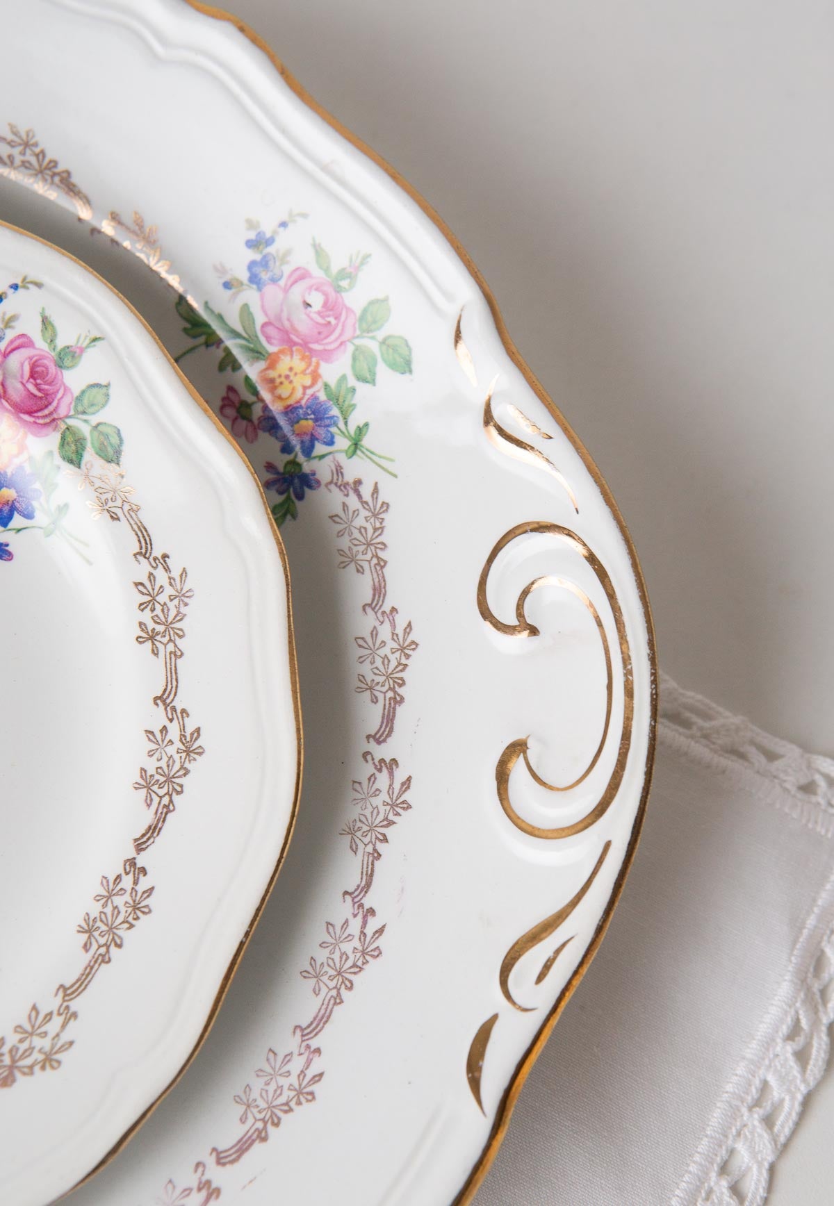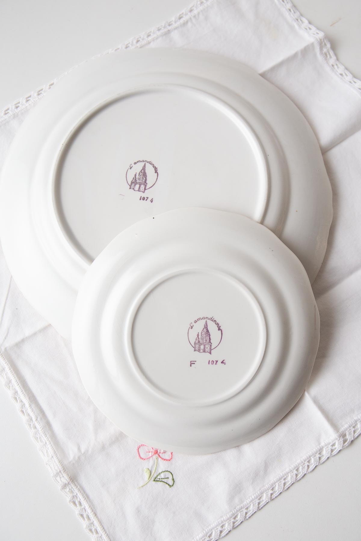 French dessert set by L'Amandinoise. 12 dessert plates + serving dish. c. 1900-1930s. No chips or cracks. Dimensions:  ⌀ 18 cm (plates),  30,5 * 28,5  cm (dish). Shipping costs will be added at checkout.
