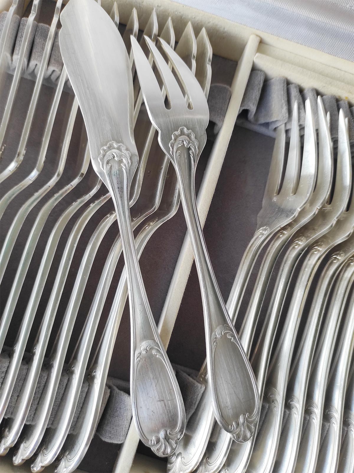 Fish cutlery set by Ercuis for 12 people. Louis XV style. The set consists of 12 fish knives and 12 forks, for a total of 24 pieces. Great condition. In original case. Dimensions: 18-21 cm. We ship worldwide but shipping costs are not included in the price. Contact us for details.