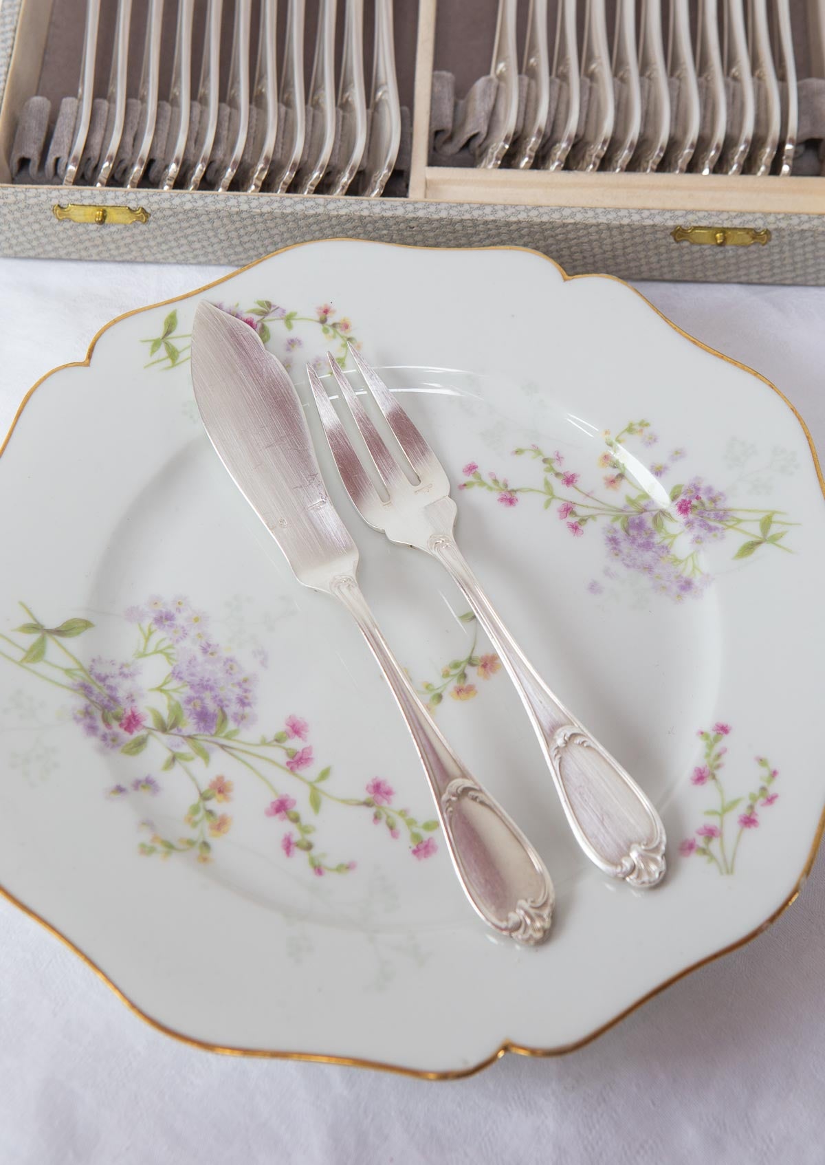 Juego de cubiertos de pescado franceses para 12 comensales en metal con baño de plata 60, del orfebre Ercuis de mediados del s. XX con un precioso diseño barroco estilo Luis XV. Todas las piezas están en un estado de conservación fantástico y la cubertería conserva el estuche original que ves en las fotos