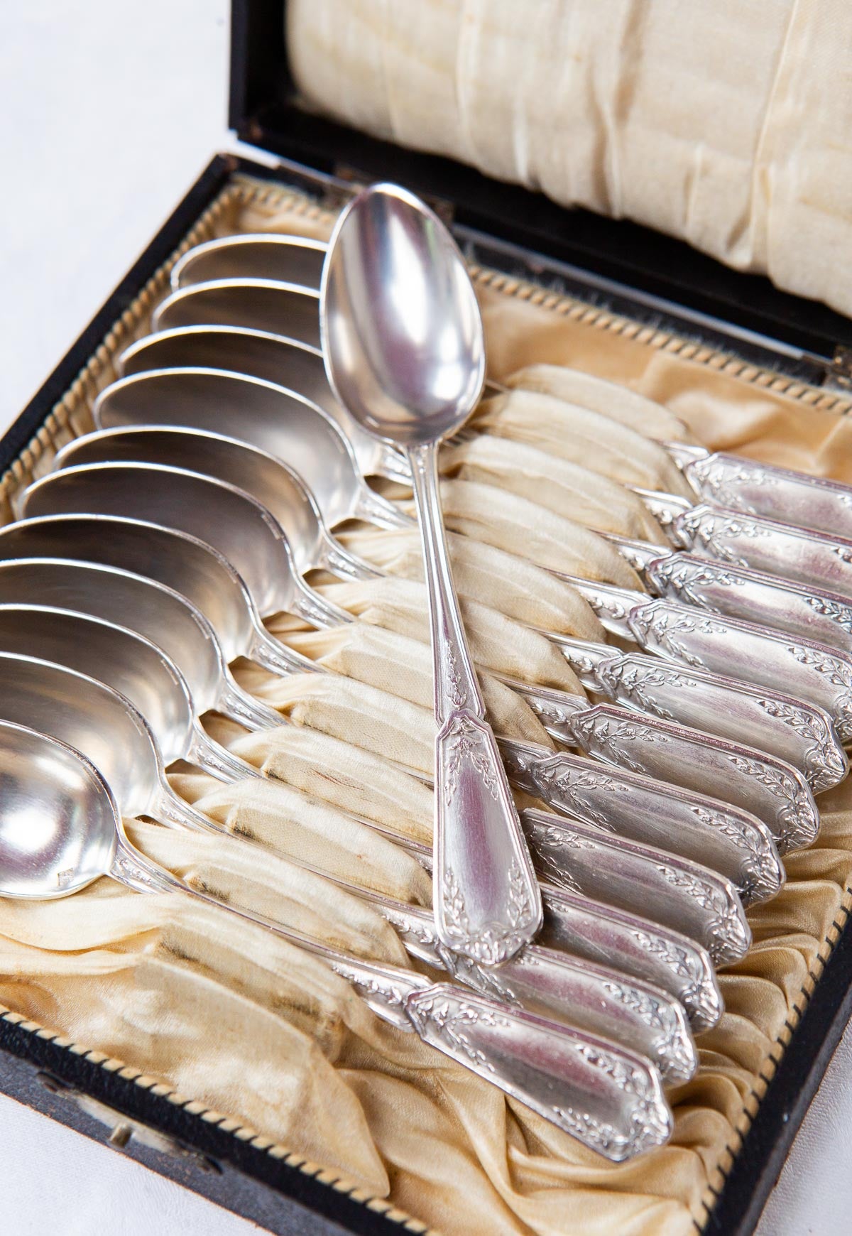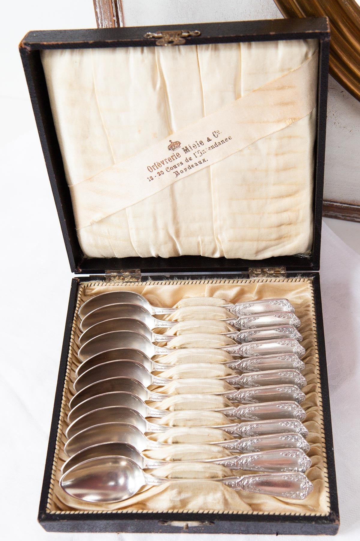 Juego de antiguas cucharillas francesas de la presitigiosa firma ERCUIS del modelo LOUIS XVI. De metal con un baño de plata, conservan su estuche original con la banda impresa con la información de la tienda que la vendió allá por los inicios del s. XX. Orfevrerie Miele & Co en la 18-20 Cours de L'Intendance en Burdeos, una de las calles comerciales más cotizadas, aún hoy día.