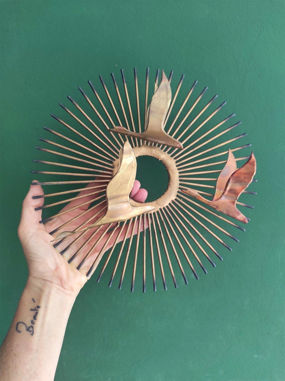SOLD Vintage sunburst sculpture attrib. to Curtis Jeré from the 60s/70s. It comes from the USA. Gilded iron with 3 brass and copper birds in flight. Dimensions: 26 cm diameter. We ship worldwide. Shipping costs will be added at checkout.
