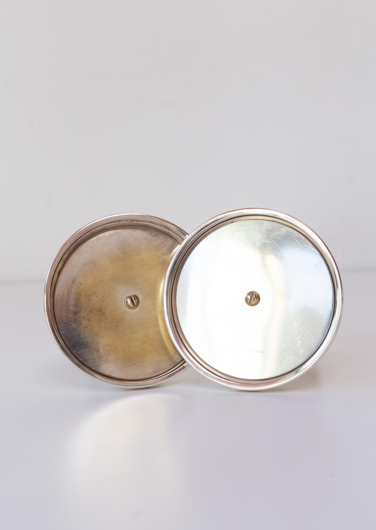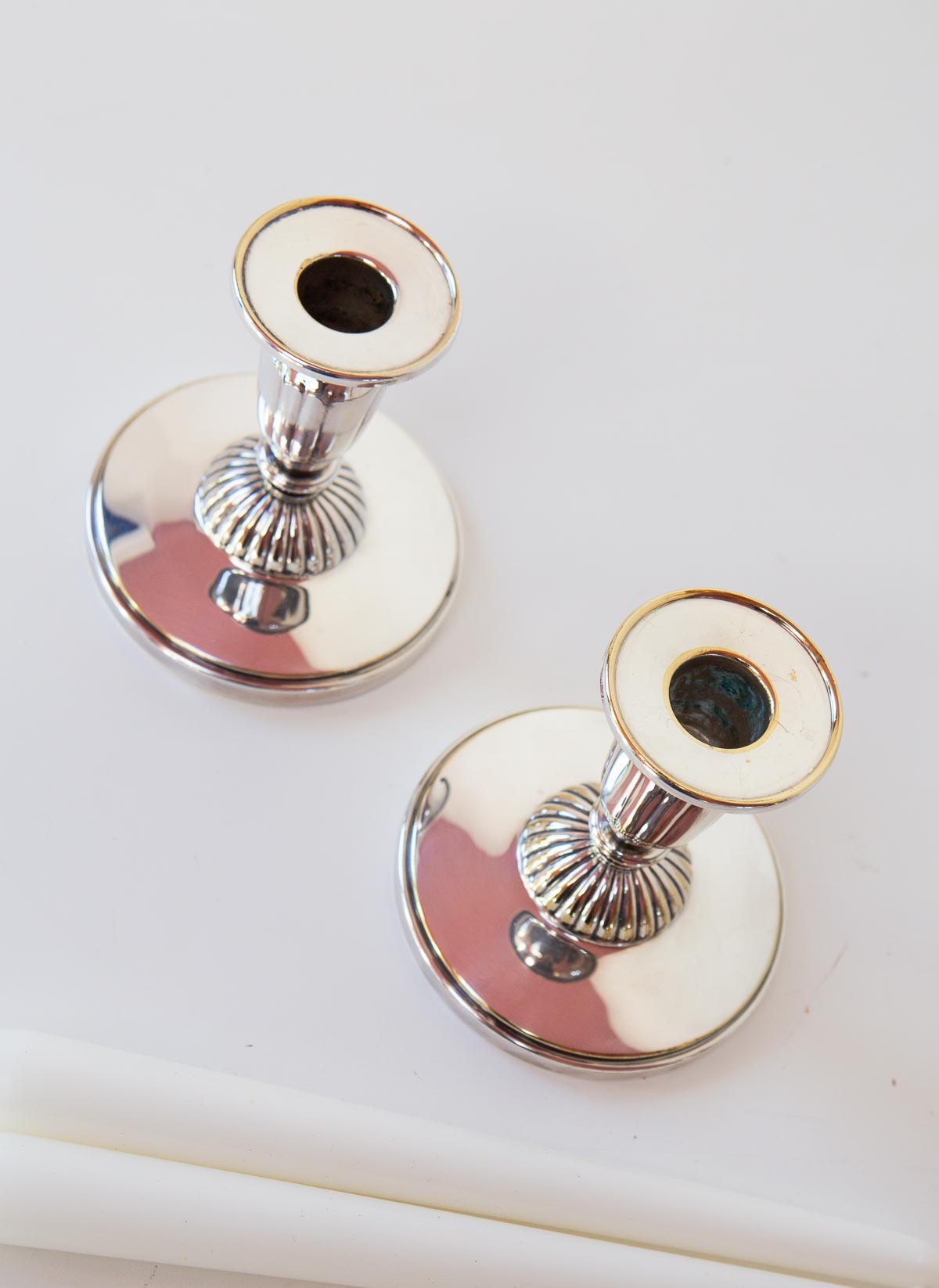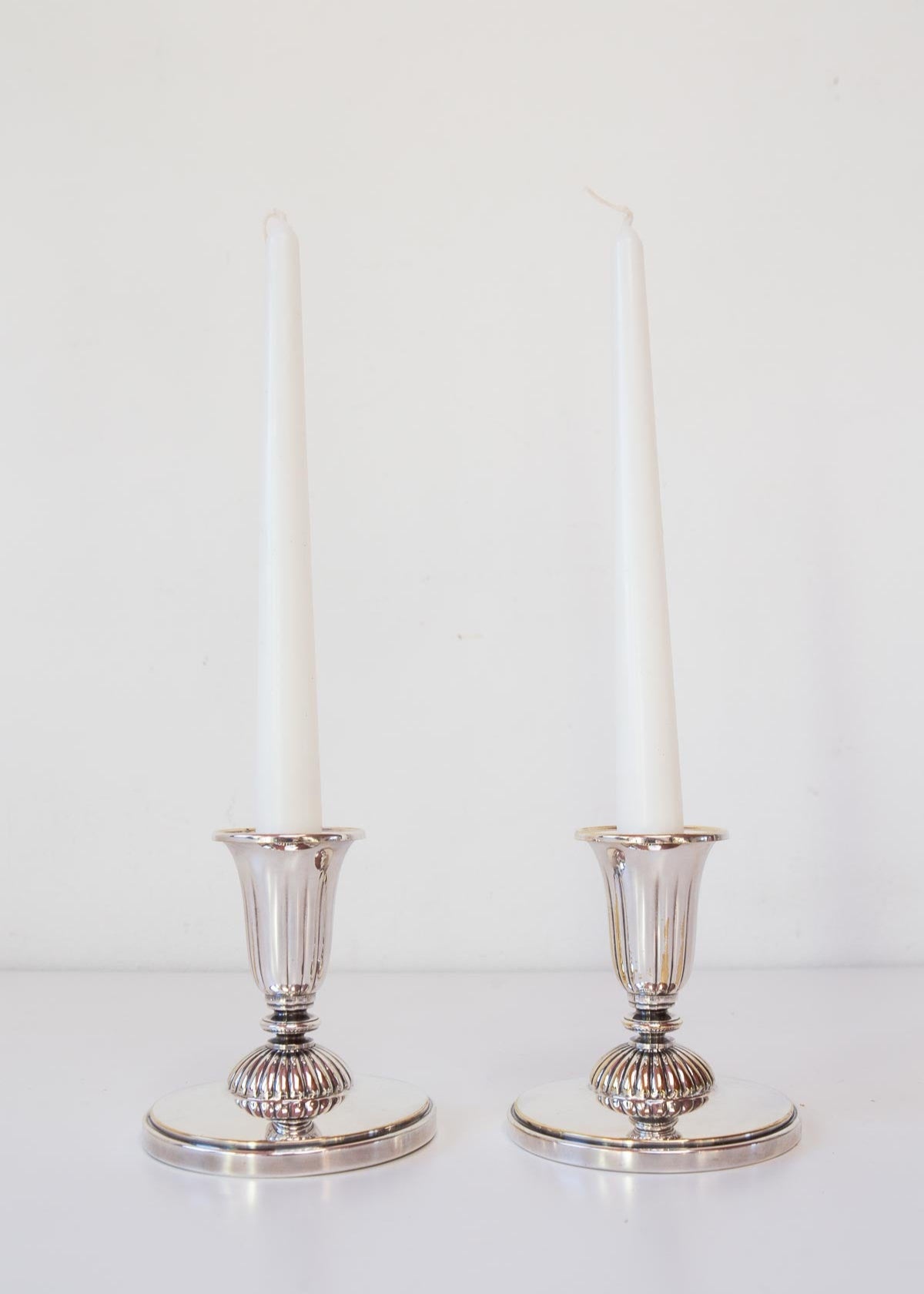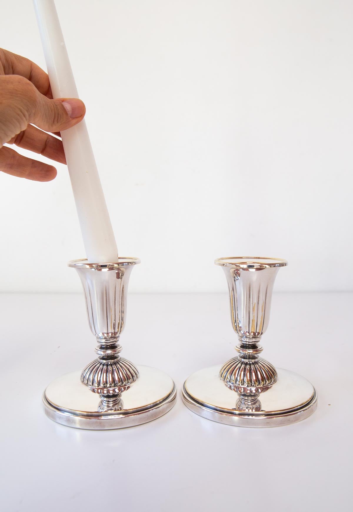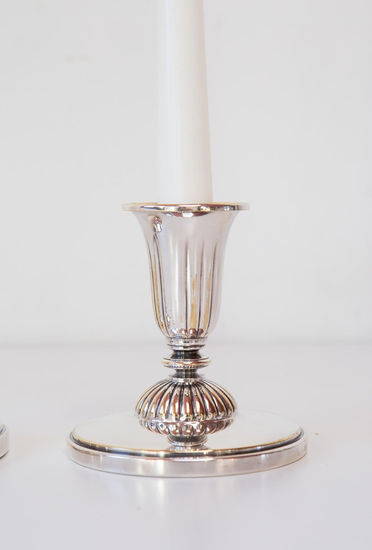 Paire de petits bougeoirs suédois en laiton plaqué argent. Dimensions:  cm haut,   cm. Les frais d'expédition seront ajoutés dans le panier.