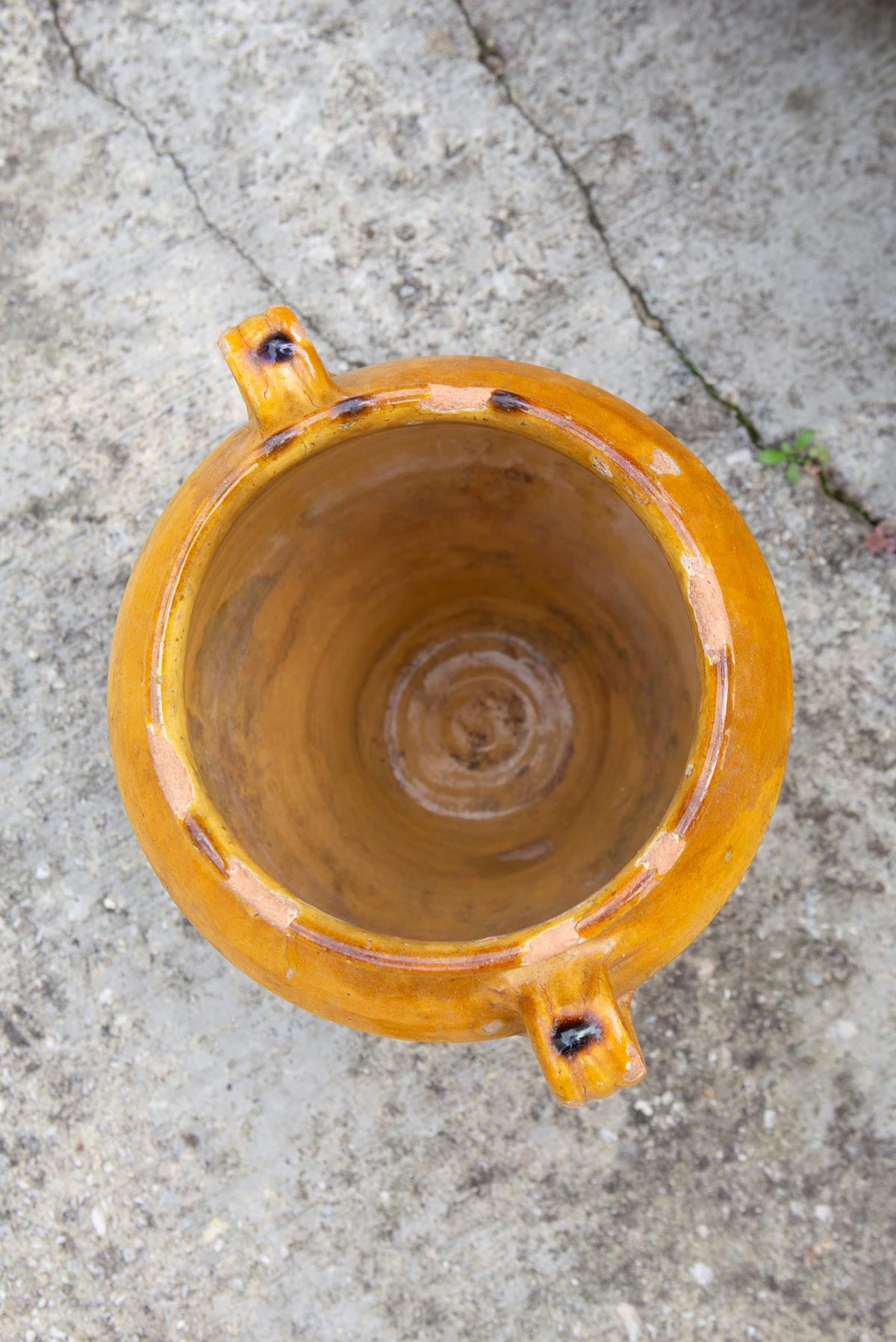 Antigua vasija en barro esmaltado para la preparación del confit de pato. Este tipo de vasijas son típicas del sur oeste francés por su esmalte de color amarillo-ocre. Es de la segunda mitad del s. XIX y una pieza decorativa fantástica que queda tan bien en una cocina como en un jardín o terraza.