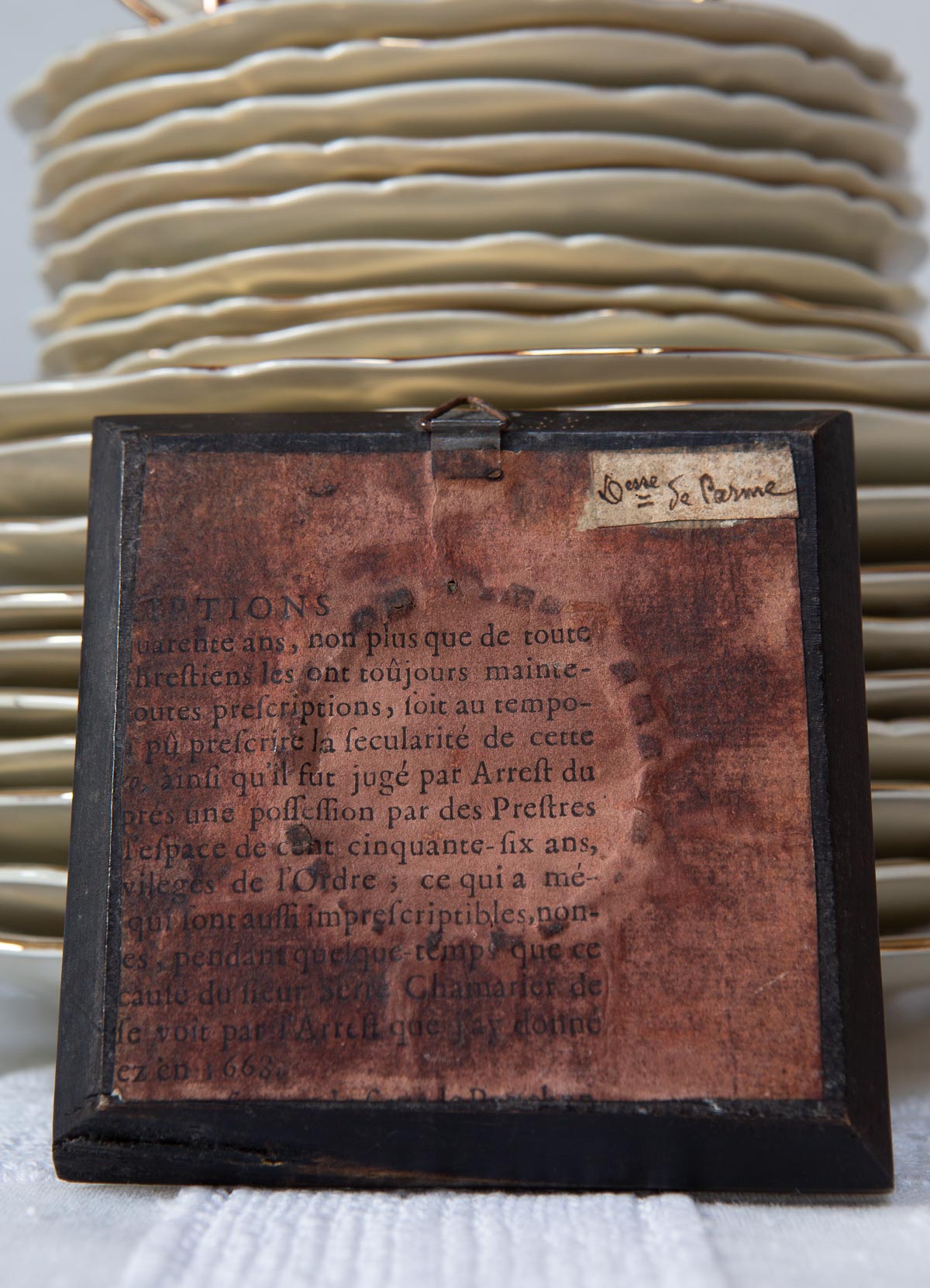 Lleva un marco de madera de formato cuadrado, posiblemente el original de la pieza junto con el cristal. La trasera, como se ve en las fotos, lleva una indicación manuscrita con la anotación "Duchesse de Parme". Desconocemos las identidades del autor y de la retratada.
