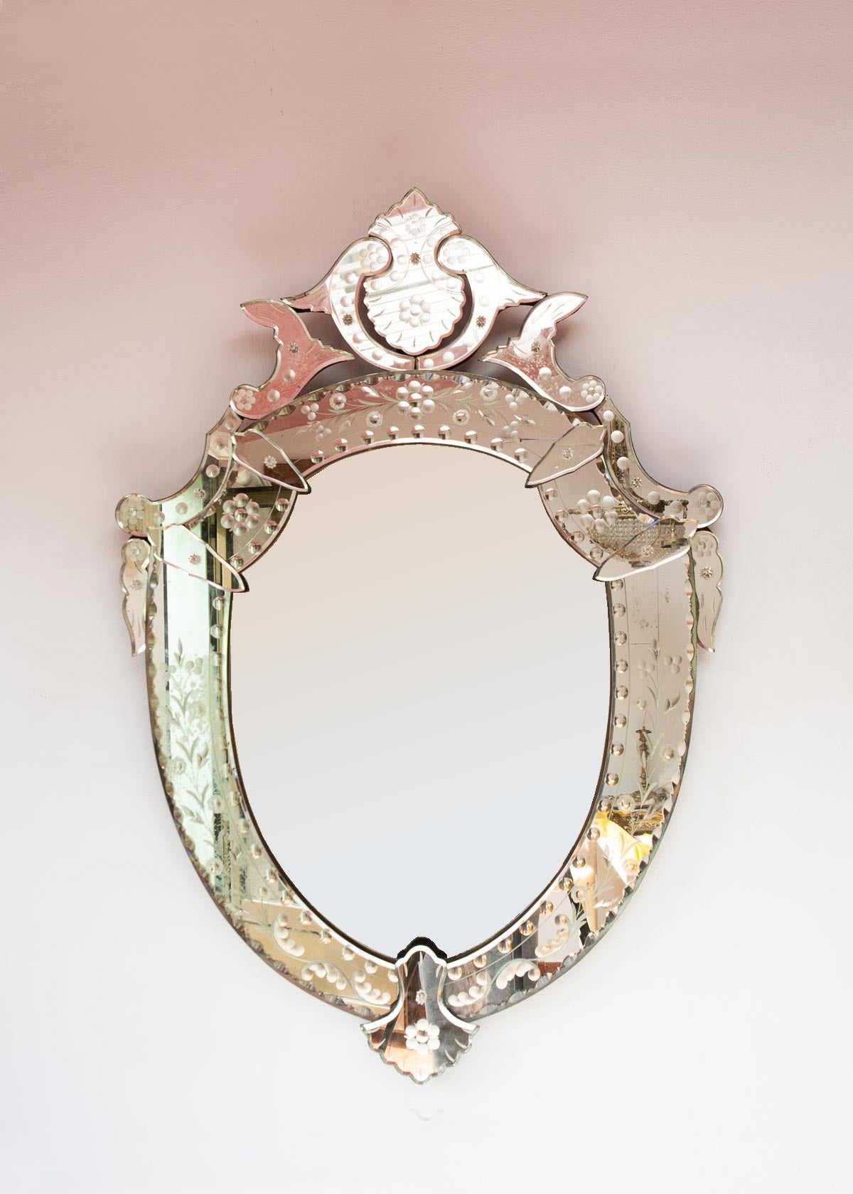 Precioso espejo antiguo francés con marco de madera tallada y dorado al oro fino de la primera mitad del s. XX. Presenta un diseño decorativo con volutas y motivos vegetales tallados a mano. El dorado muestra una pátina acorde a su antigüedad, con zonas de desgaste que realzan su carácter decorativo.