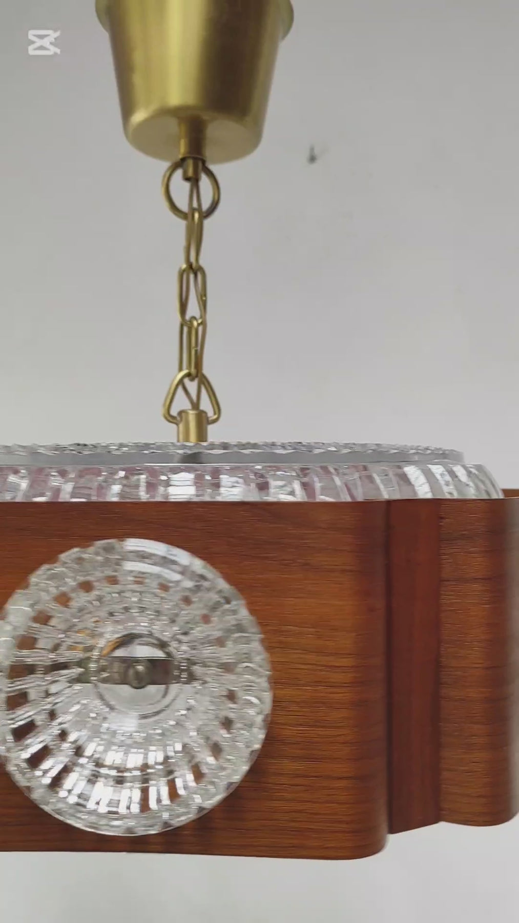 Lámpara de techo sueca de cristal y madera, posiblemente diseñada por Carl Fagerlund para Orrefors, aunque viene sin etiqueta, pero es un diseño generalmente atribuido a este diseñador. Es muy pesada para su tamaño ya que las piezas superior e inferior son de cristal con aprox. 1 cm de espesor y cada pequeña pieza exterior es también de cristal. Está IMPECABLE.