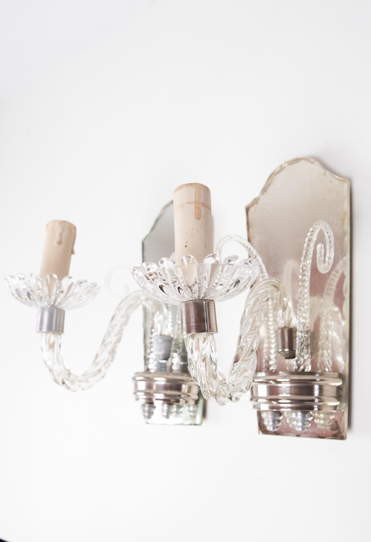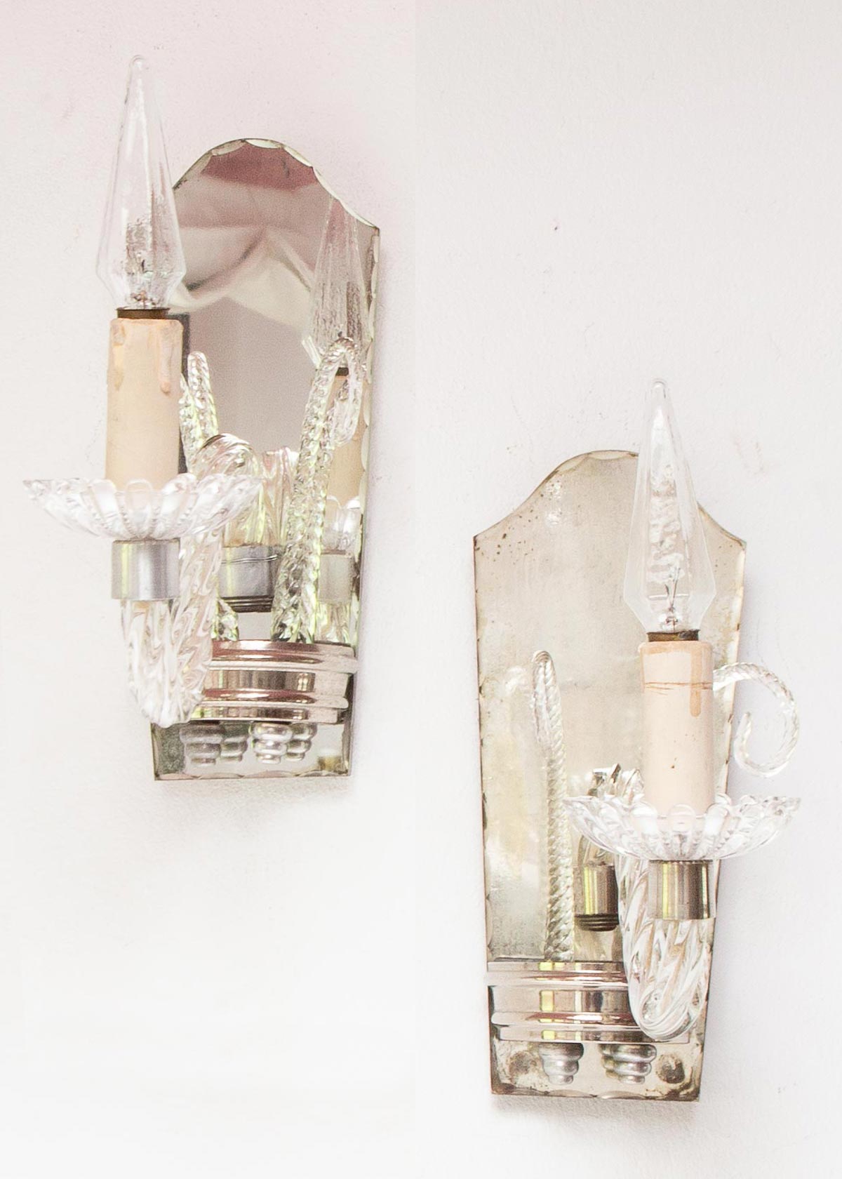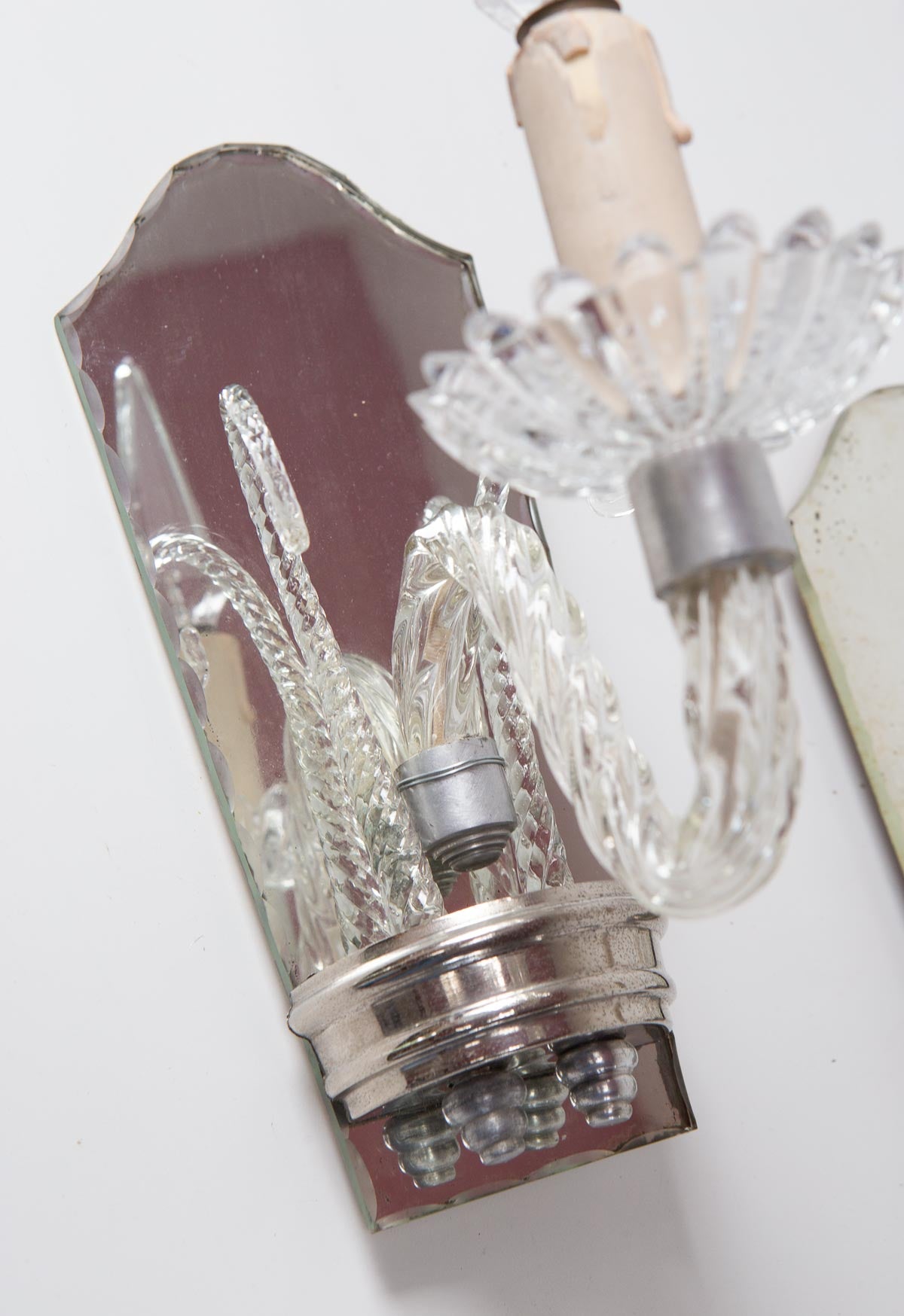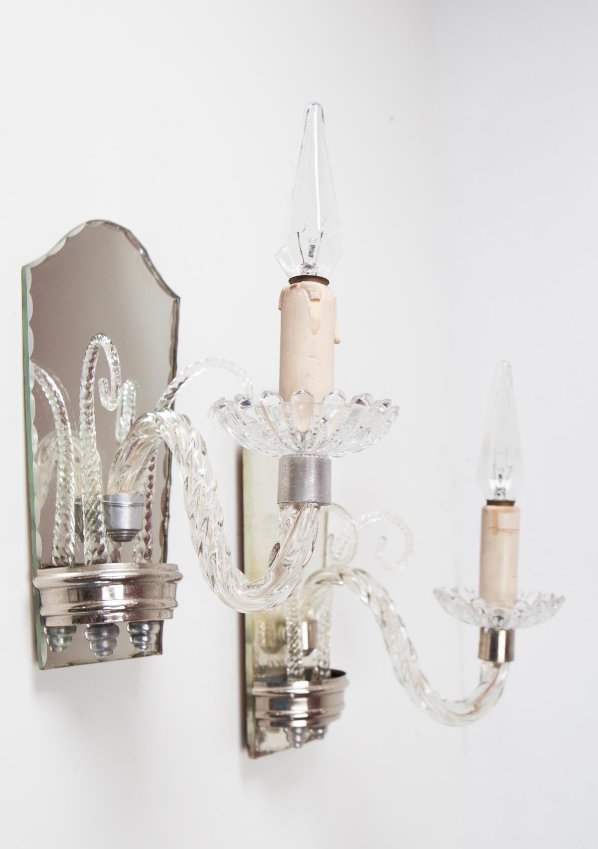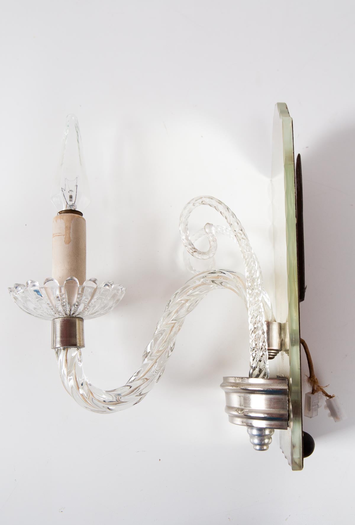 Uno de los dos apliques tiene una abrazadera hecha con un alambre de metal que sirve para mantener el brazo de cristal en su sitio. La pieza de metal plateado que sujeta tiene una grieta por detrás y por eso necesita ese refuerzo estructural. Lo ves perfectamente en la última foto. Hemos tenido cuenta de ese detalle en el precio. Ambos son funcionales y, salvo por ese alambre, están perfectos.