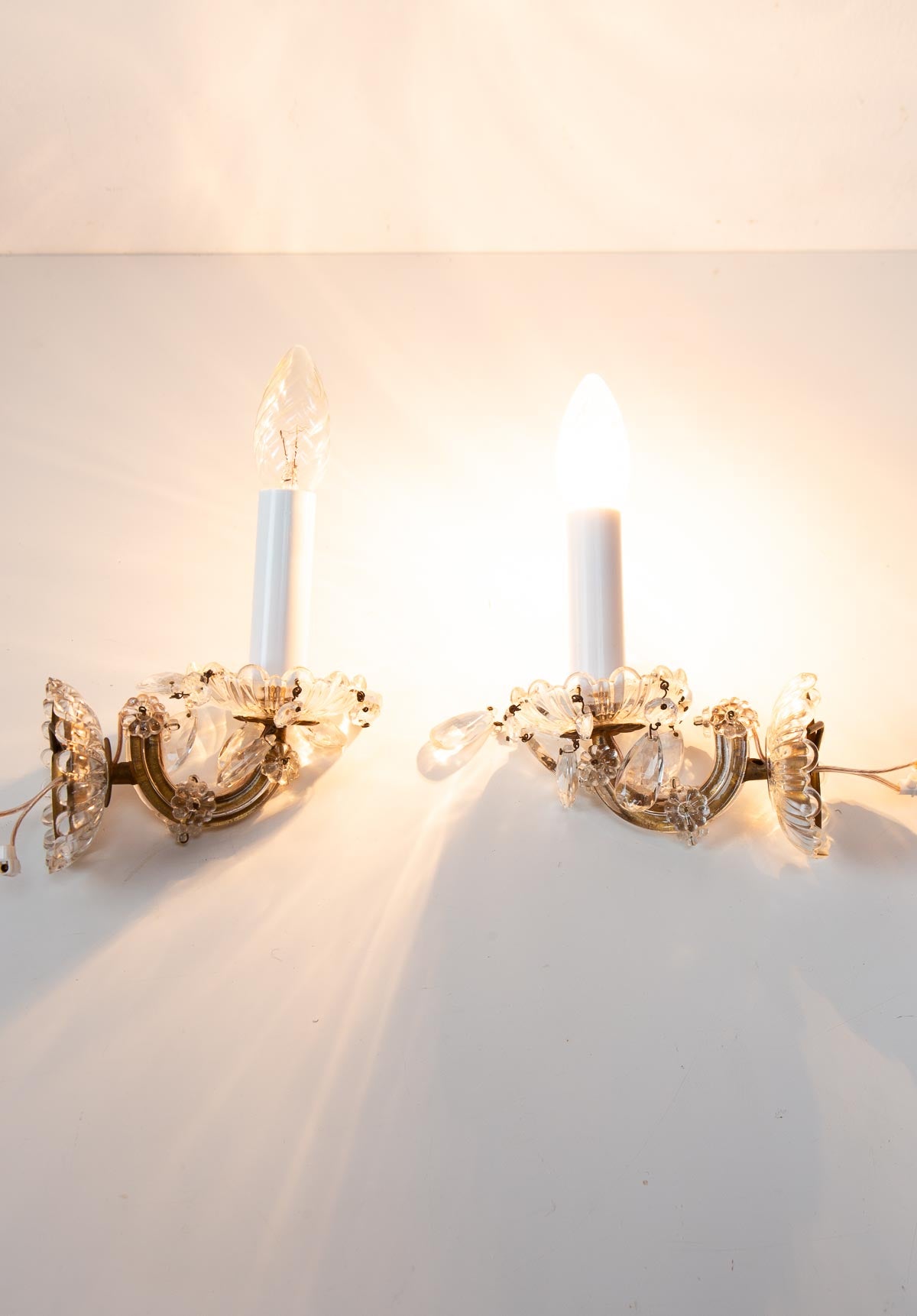 Paire d'appliques vintage en metal doré, verre et cristal. Vers 1950. Parfait état. PRIX DE LA PAIRE. Pour 1 ampoule type E14 (non inclus). Dimensions: 10*17*15 cm. Les frais d'expédition seront ajoutés dans le panier