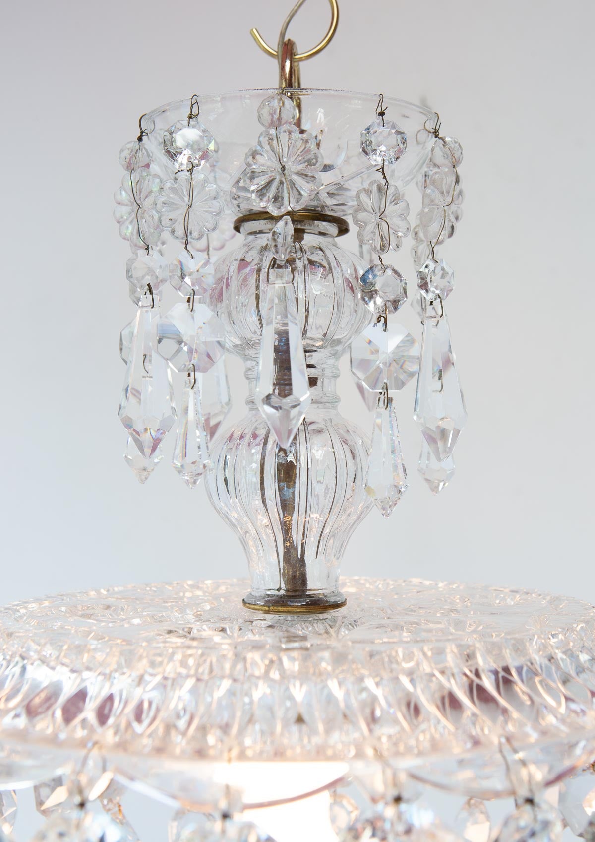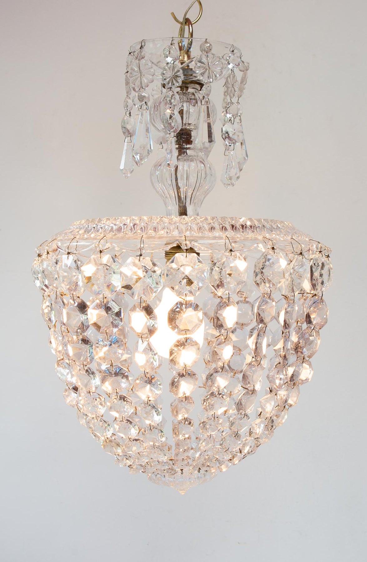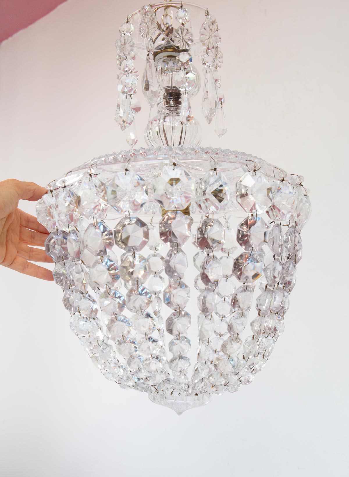 Vintage French or Italian ceiling fixture. Glass and crystal. c. 1960s. For 1 bulb type E27. Rewired. Dimensions: 32 cm diam, H 50 cm. Shipping costs are not included. Contact us for details.