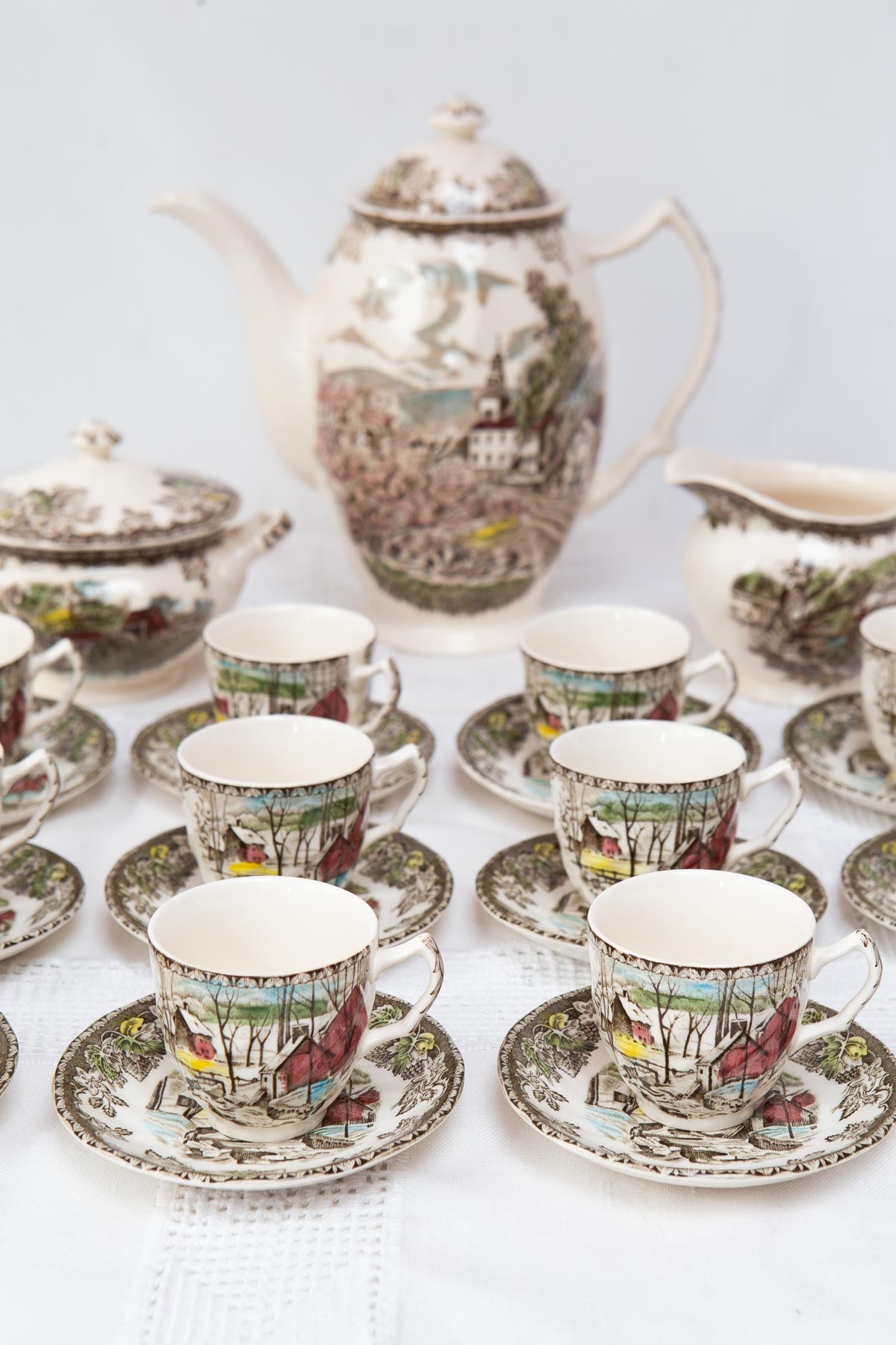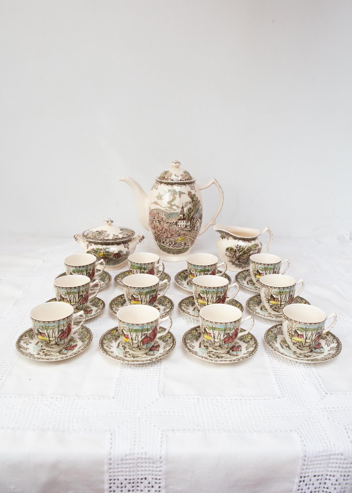 Excepcional juego de café inglés para 12 de la prestigiosa firma Johnson Bros (Staffordshire, England), perteneciente a la célebre serie The Friendly Village, una de las más apreciadas de su producción, con varias escenas. Las tazas son de The Ice House, el azucarero es de "The Old Mill", la cafetera de "The Village Green"