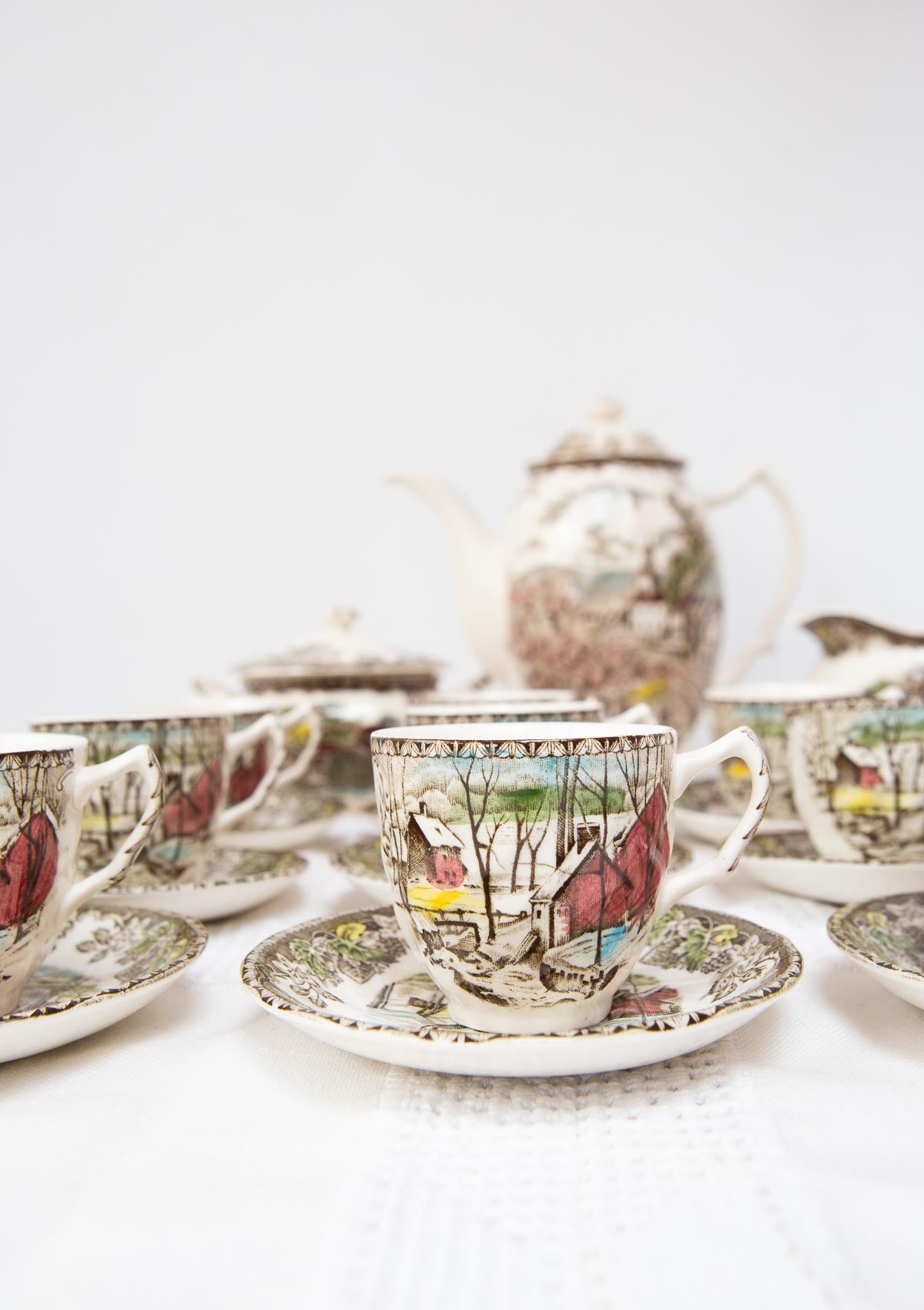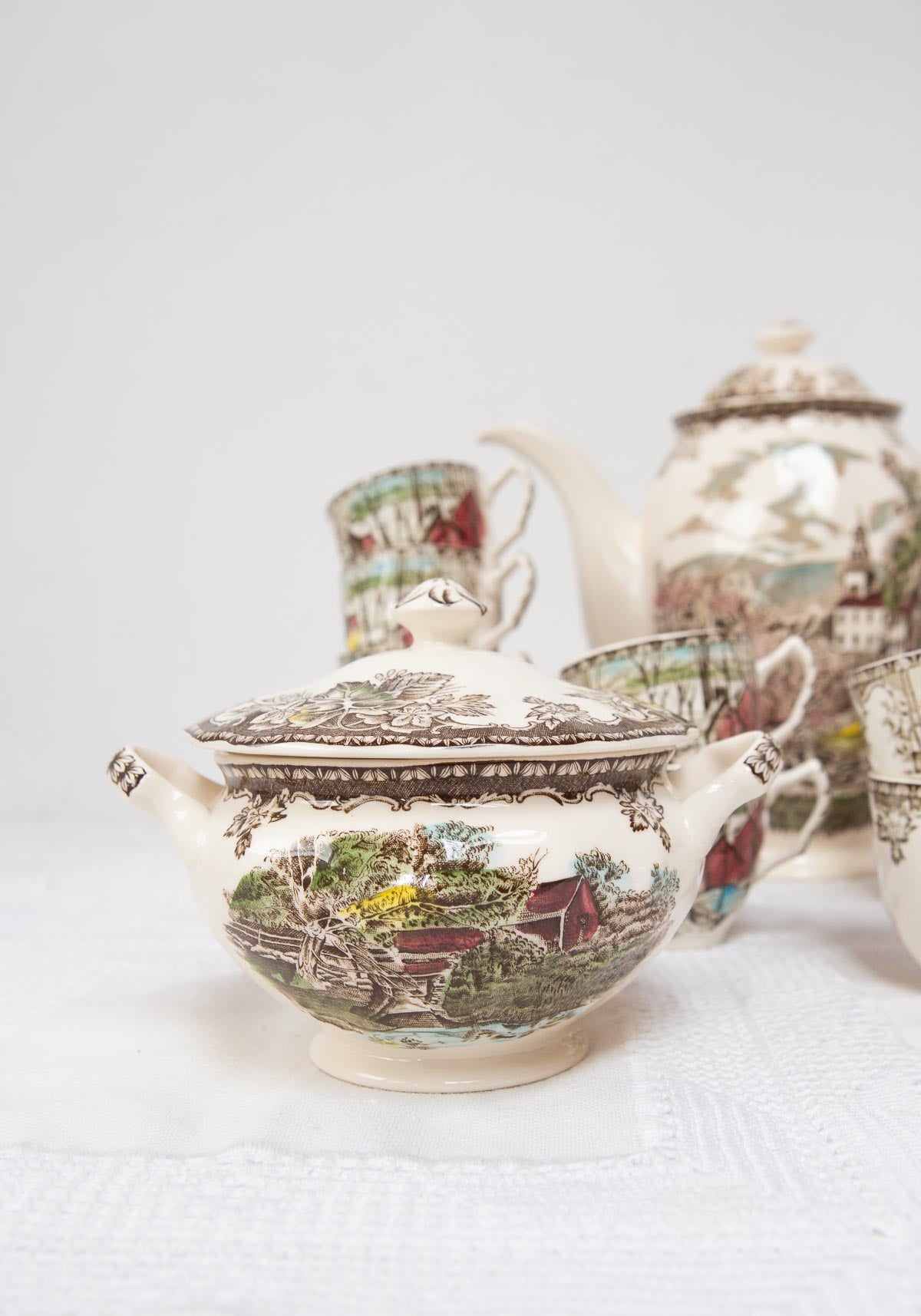 Juego de café inglés PARA 12 The Friendly Village Johnson Bros c. 1960 (27 PIEZAS)