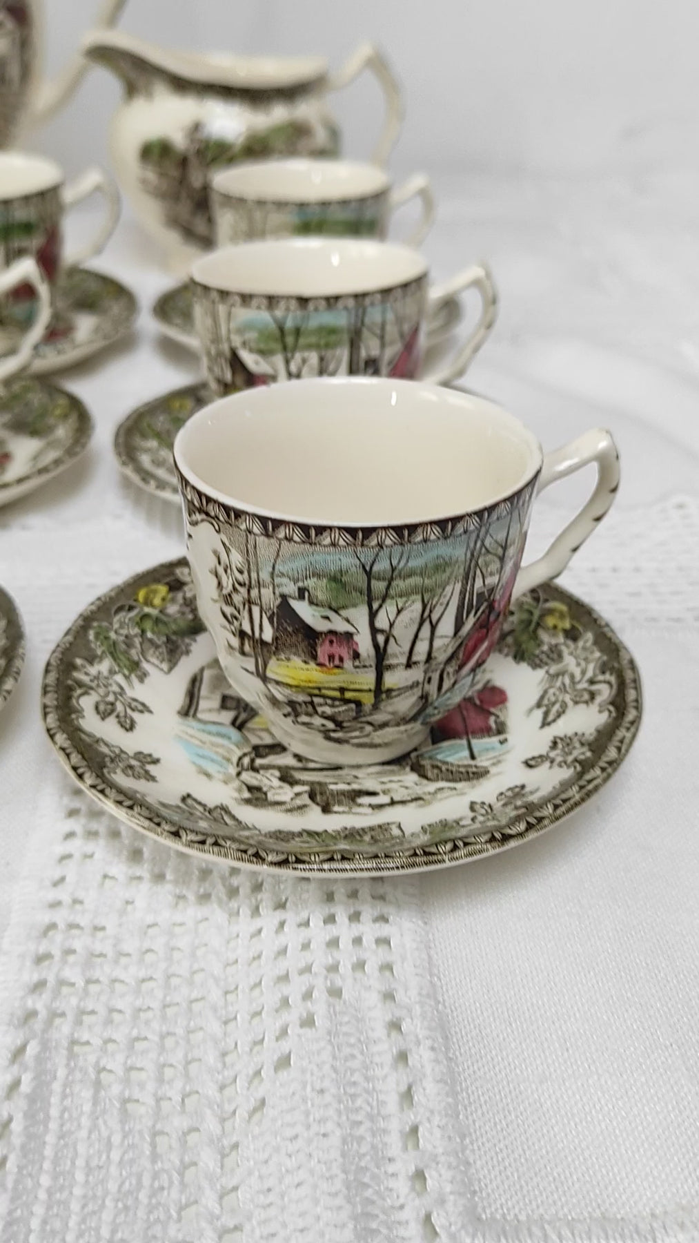 Service à café anglais for 12 The Ice House / The Friendly Village by Johnson Bros. c. 1960s. 27 pièces. Comme neuf. Dimensions: voir description en espagnol. Les frais d'expédition seront ajoutés dans le panier