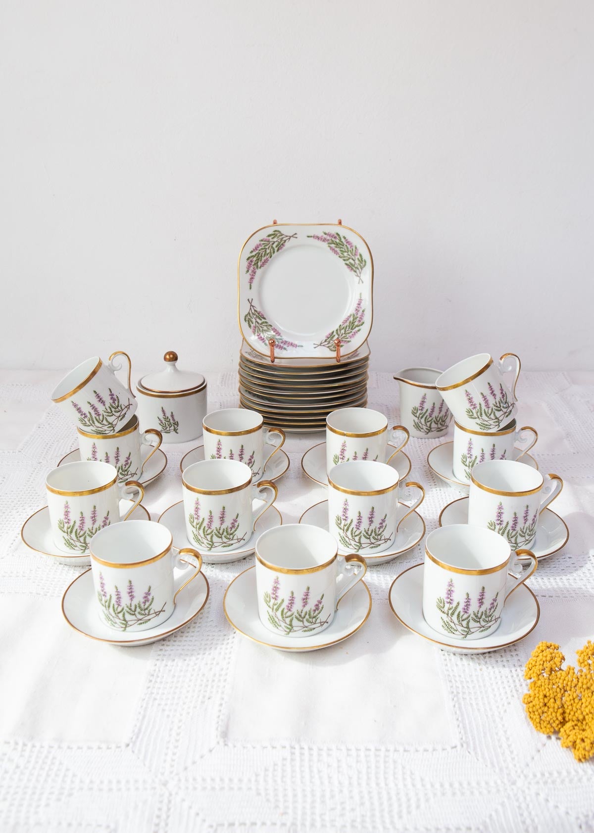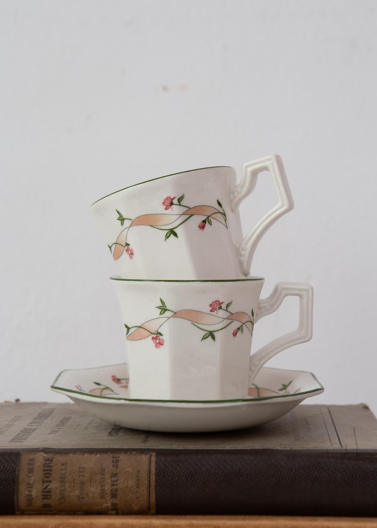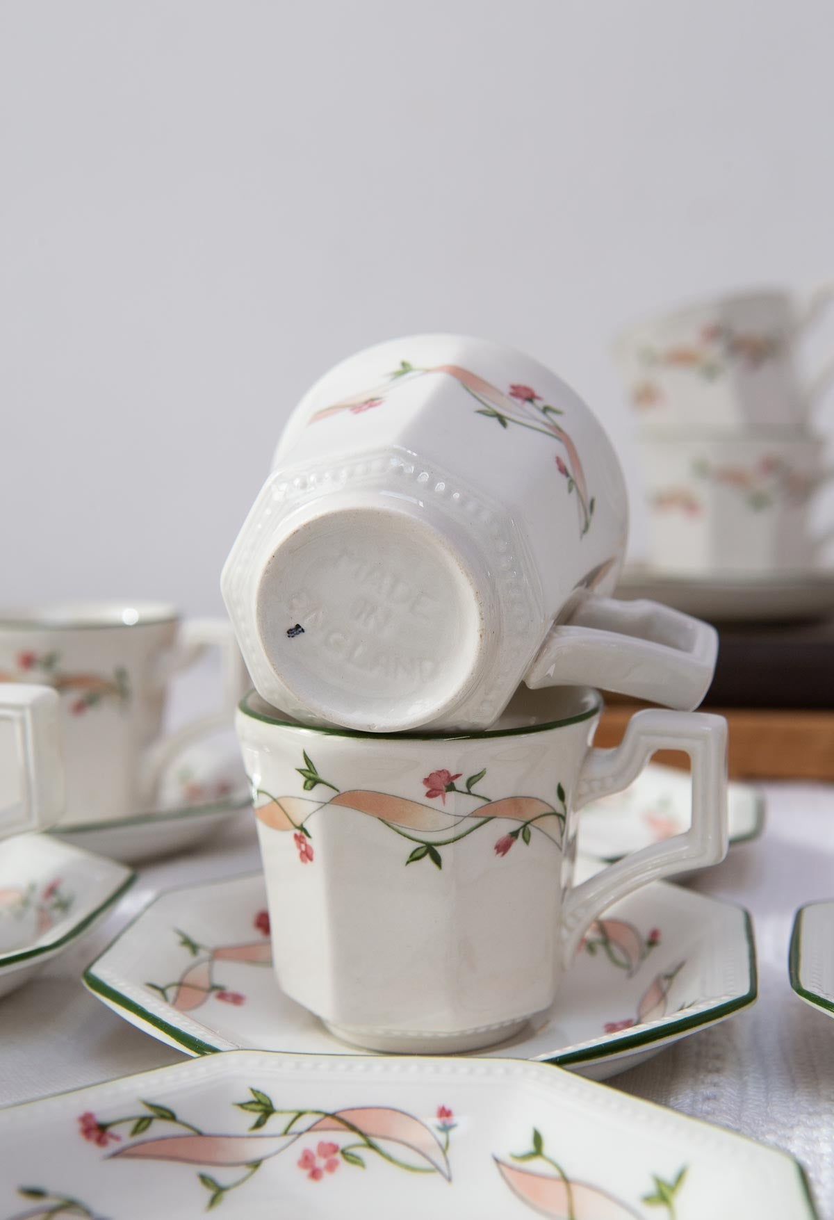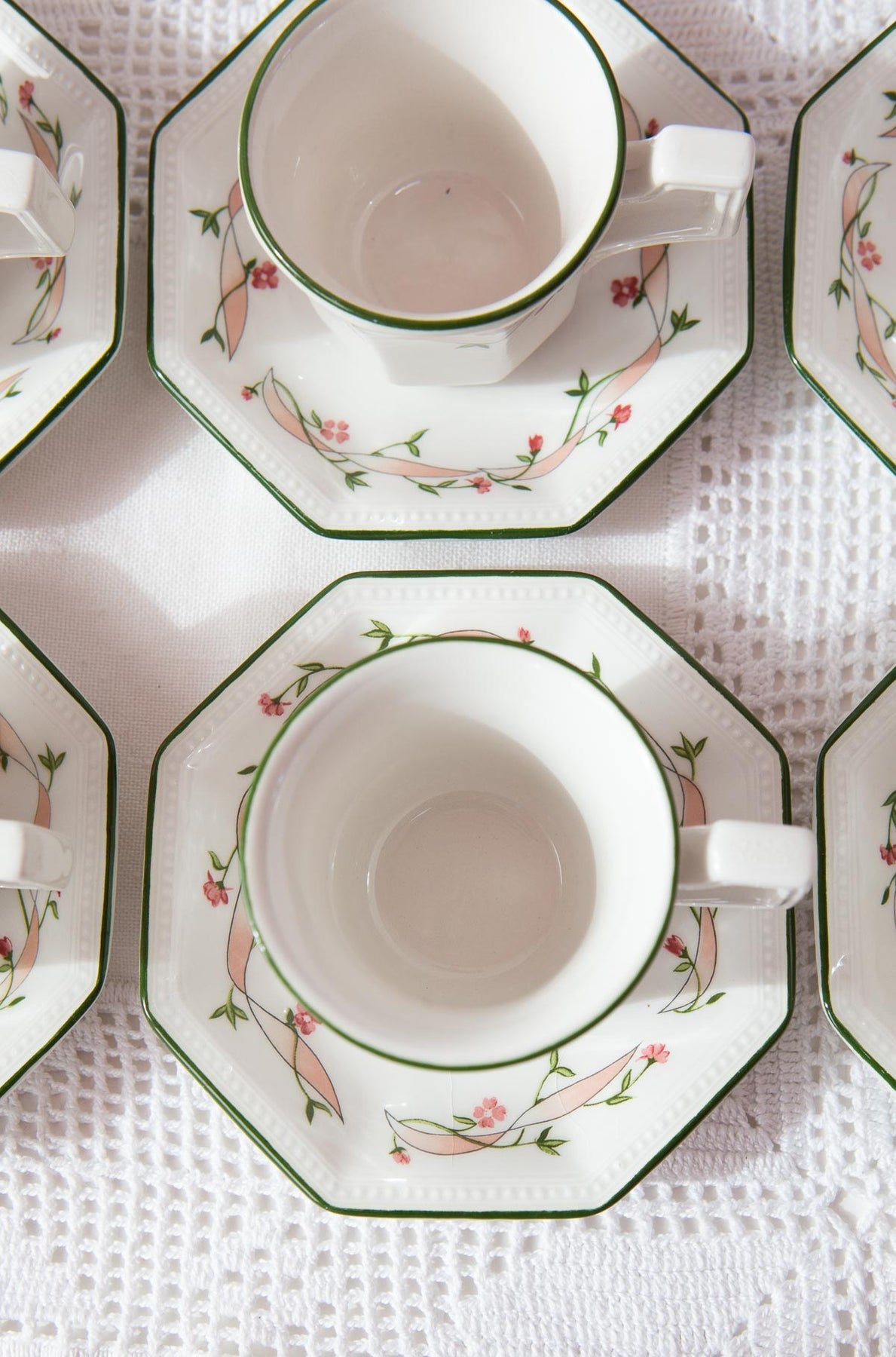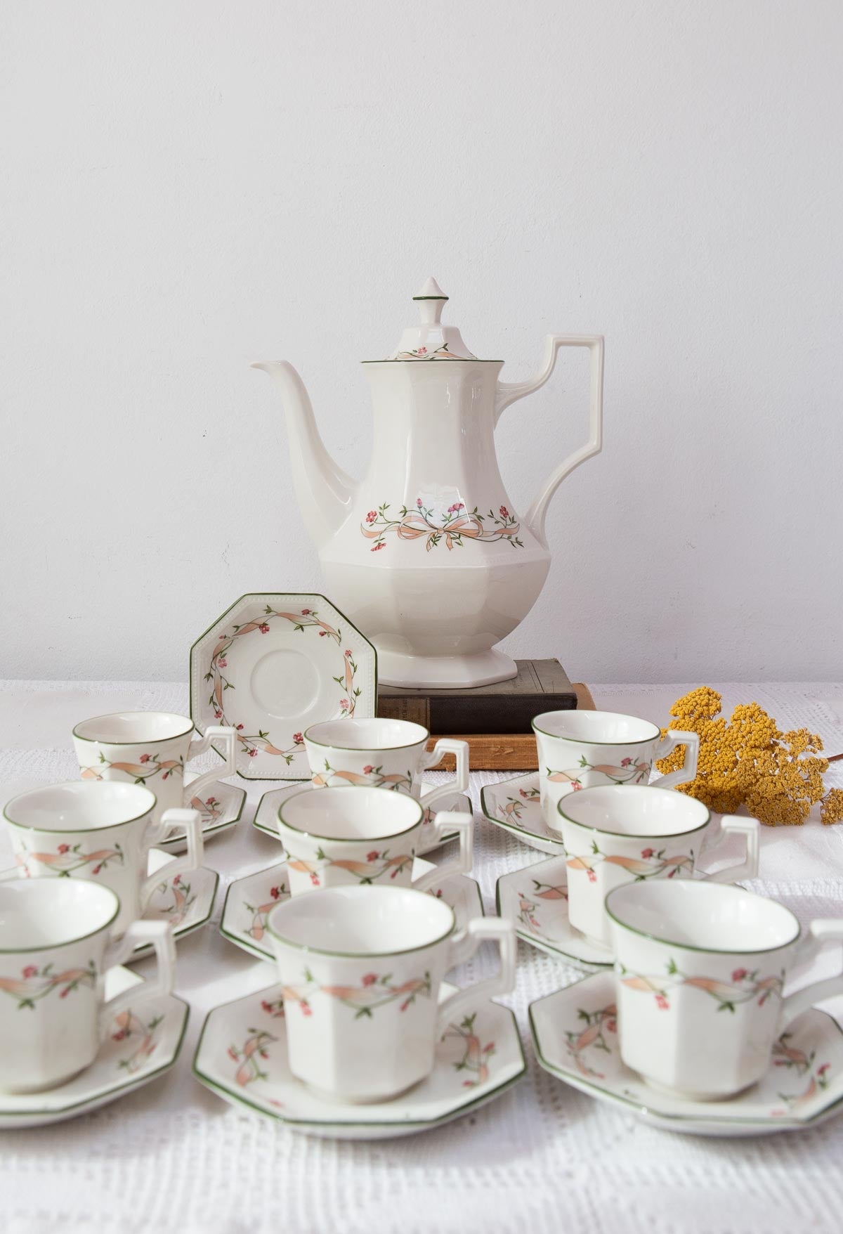 Charming coffee set for 9 from the prestigious English firm Johnson Brothers, model “Eternal Beau”, produced in England during the 1980s. 20 pieces. This design is distinguished by its elegant octagonal shape and its delicate floral motif featuring small pink blossoms intertwined with a peach-colored ribbon and a fine green rim. A classic example of romantic English style, perfect for those who appreciate vintage tableware with timeless charm. Amazing condition. Dimensions: see description in Spanish. Shipping costs will be added at checkout.
