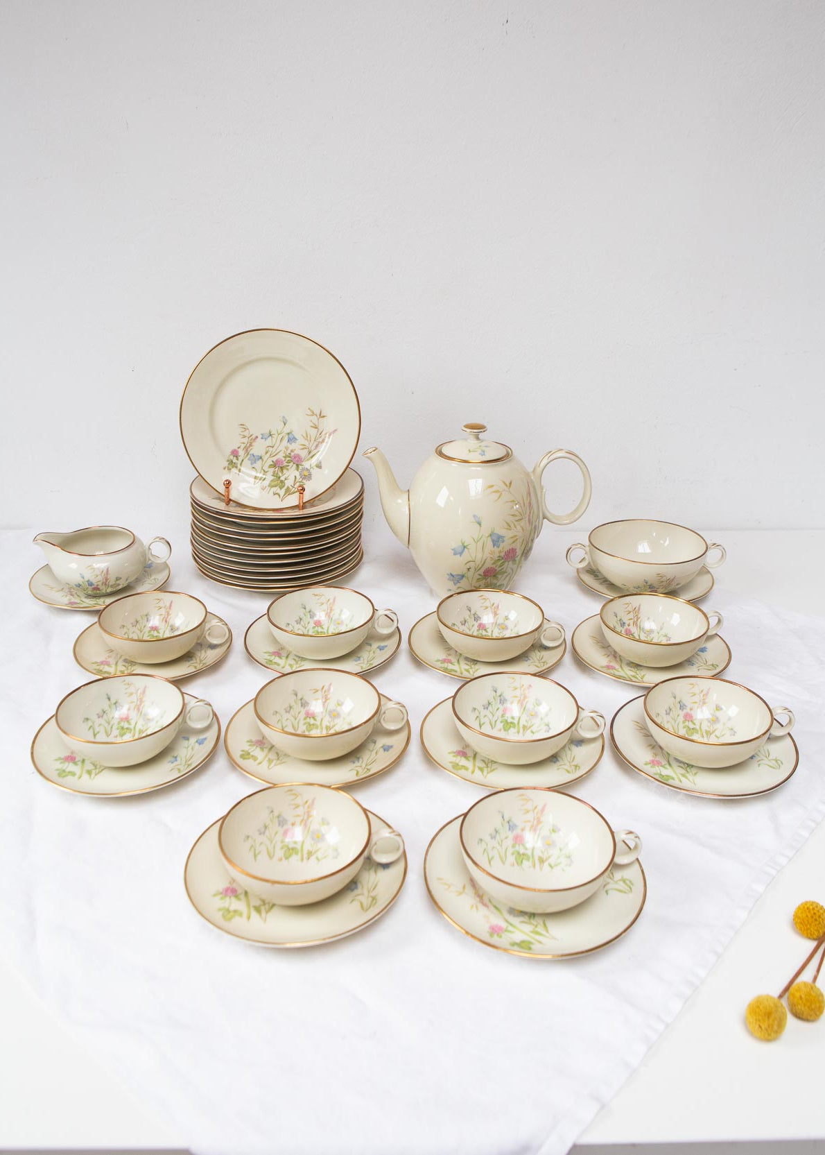 Juego de te o café de porcelana sueca de la firma Hackefors con un precioso diseño floral sobre fondo crema de aprox. 1960s. Todas las piezas tienen un filo dorado y el mismo motivo.