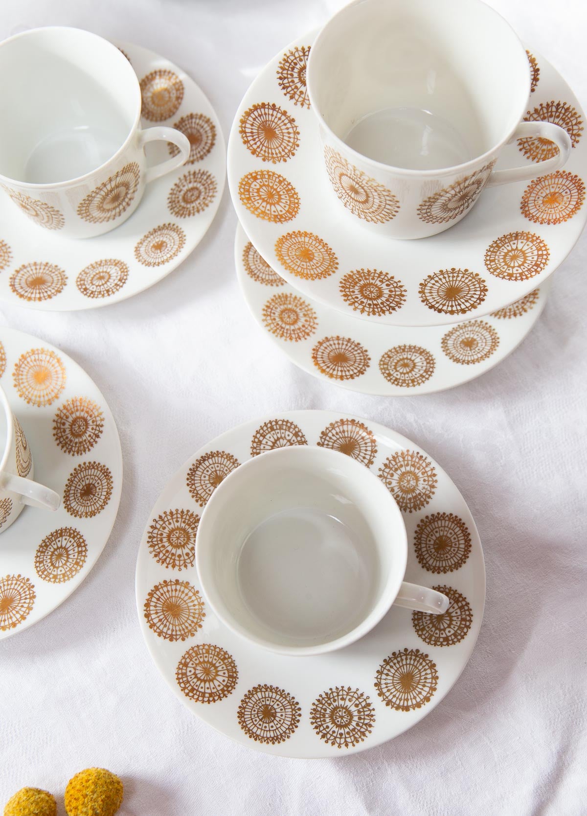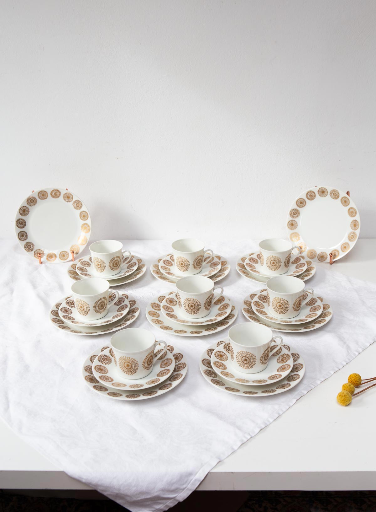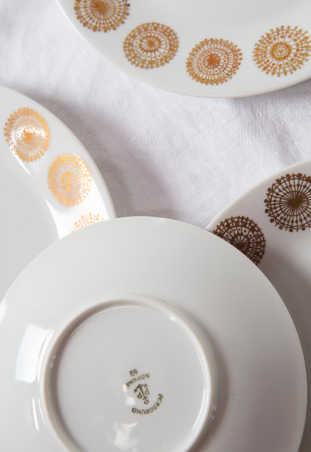 El motivo de este juego de diseño nórdico consiste en una serie de medallones dorados circulares con calcomanías al oro fino que se repiten alrededor de la pieza sobre un fondo blanco puro de porcelana. Este diseño forma parte de sus servicios de lujo de los años 60, fabricado en el año 1969.