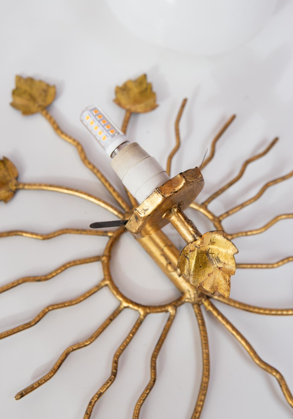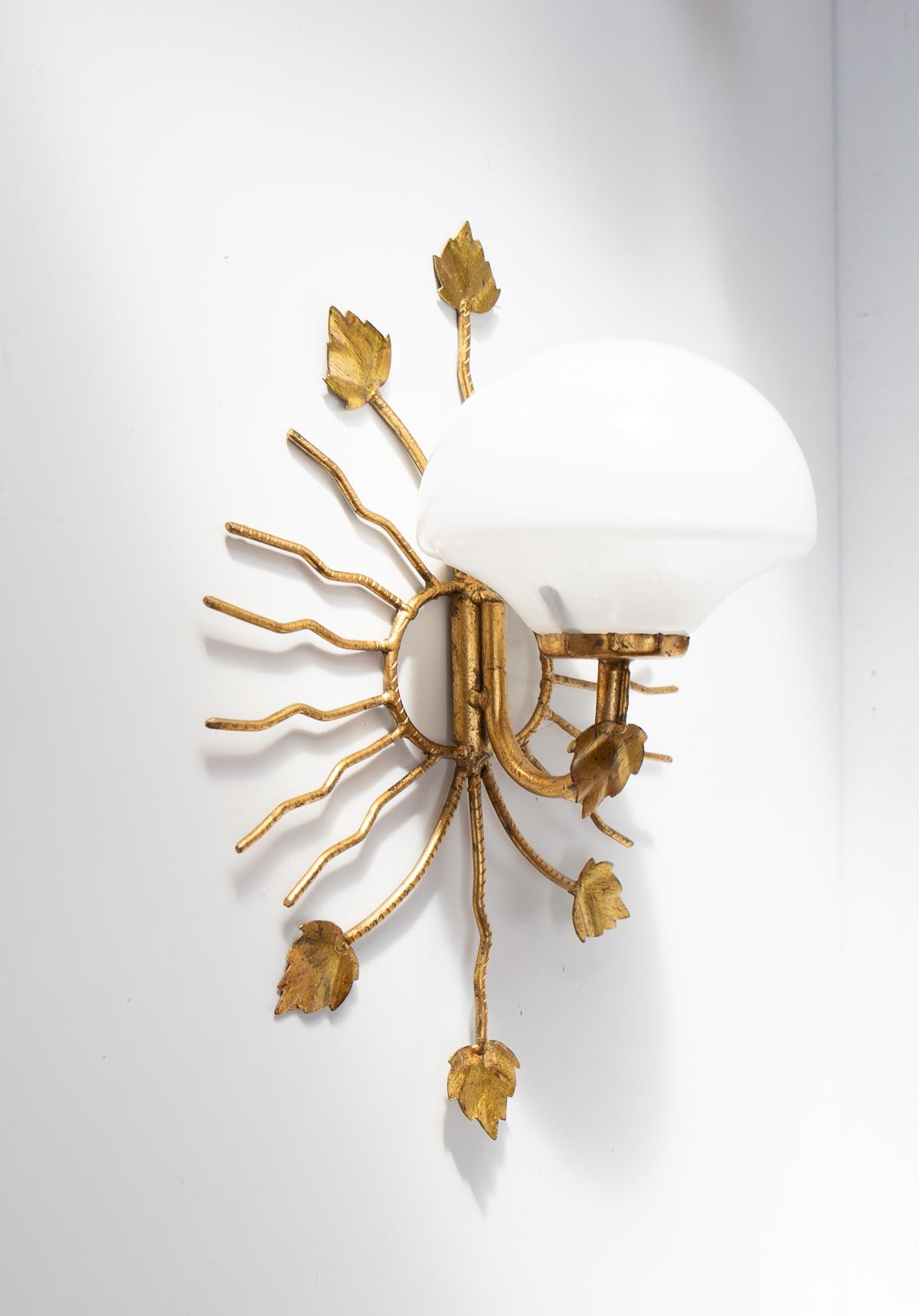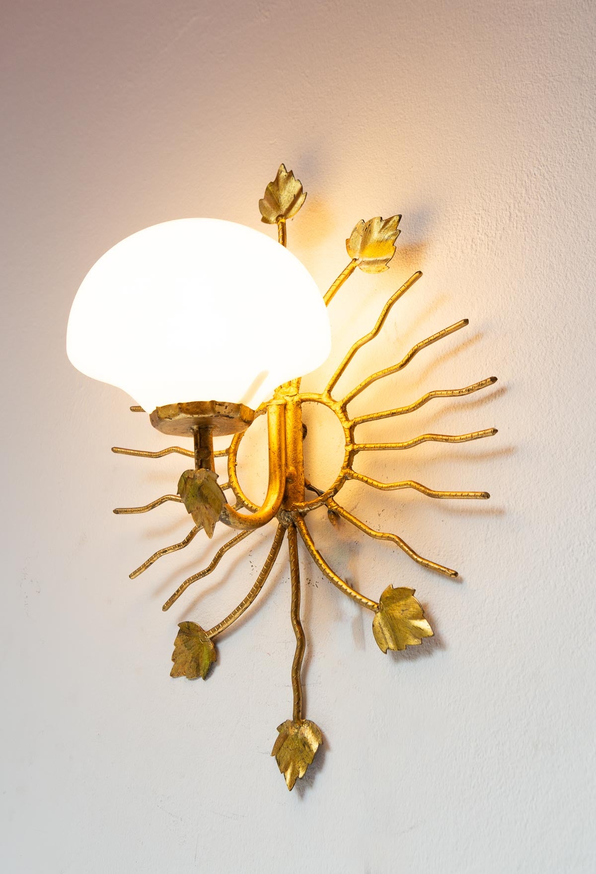 Aplique italiano de aprox. 1970 de metal dorado (hierro?) con diseño de hojas y rayos, tulipa de cristal de opalina blanca y un punto de luz para una bombilla de rosca fina. Por el diseño del aplique la bombilla ha de ser especialmente pequeña, similar a la de la última foto. Si necesitas que te la enviemos con ella, consúltanos.