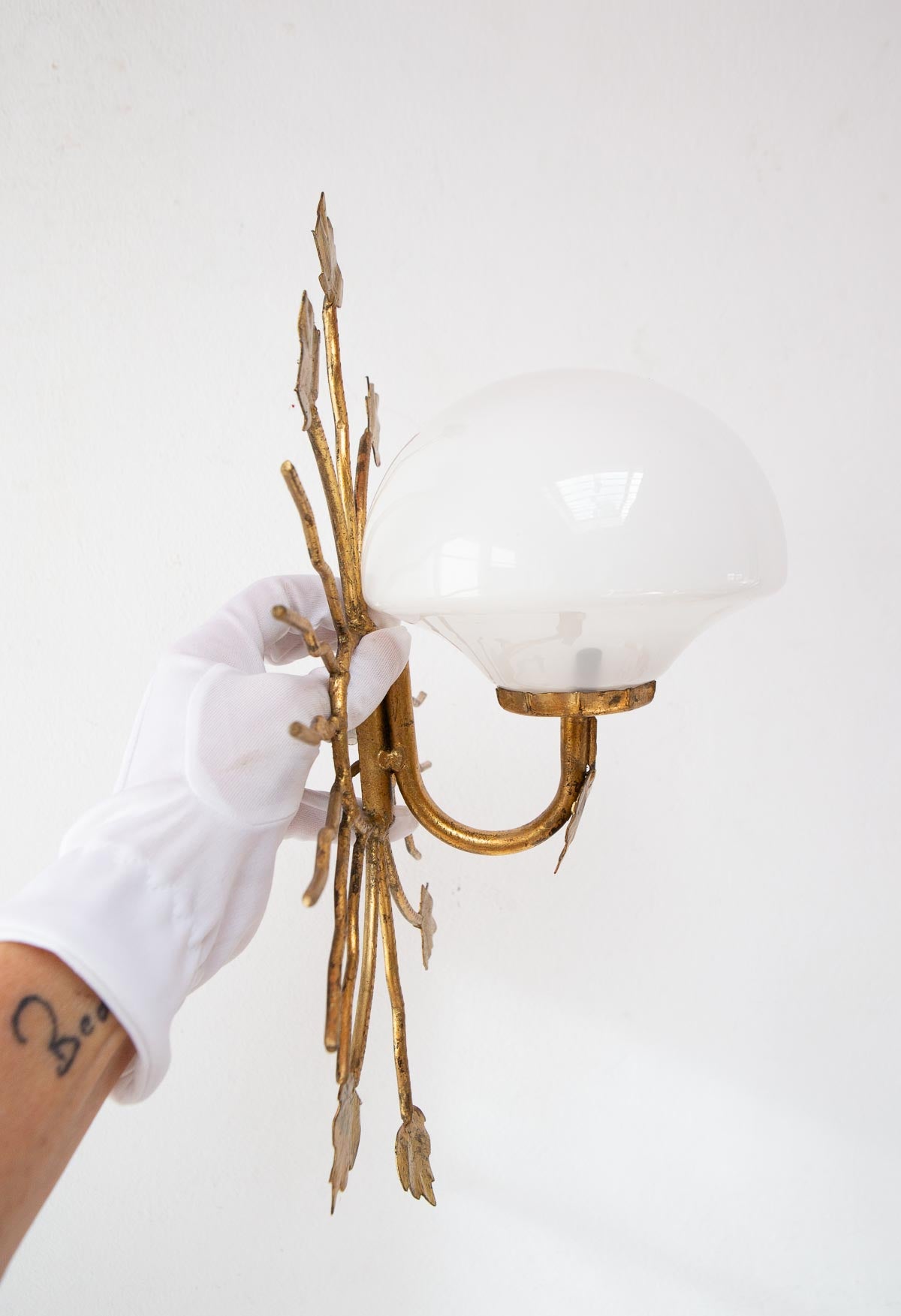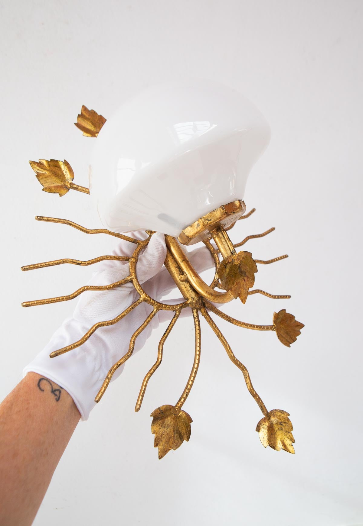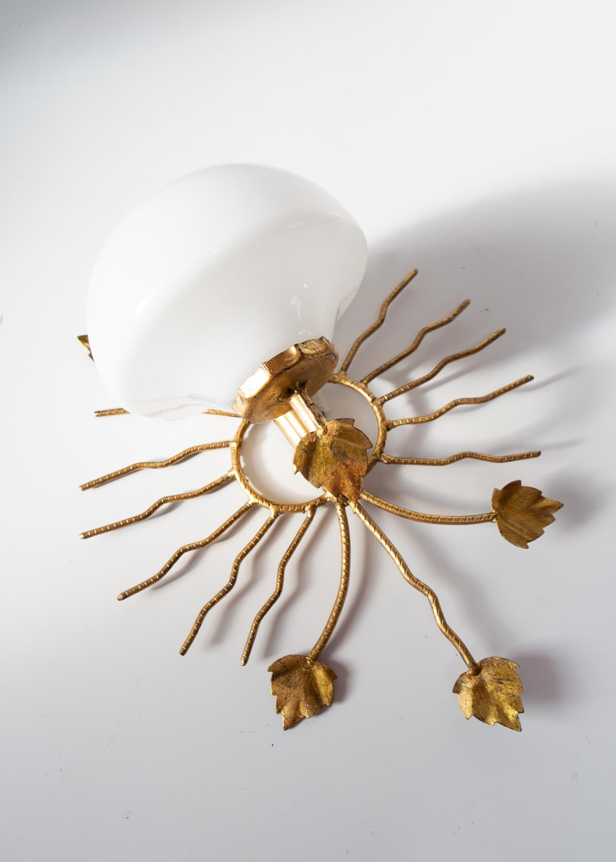 Aplique italiano de aprox. 1970 de metal dorado (hierro?) con diseño de hojas y rayos, tulipa de cristal de opalina blanca y un punto de luz para una bombilla de rosca fina. Por el diseño del aplique la bombilla ha de ser especialmente pequeña, similar a la de la última foto. Si necesitas que te la enviemos con ella, consúltanos.