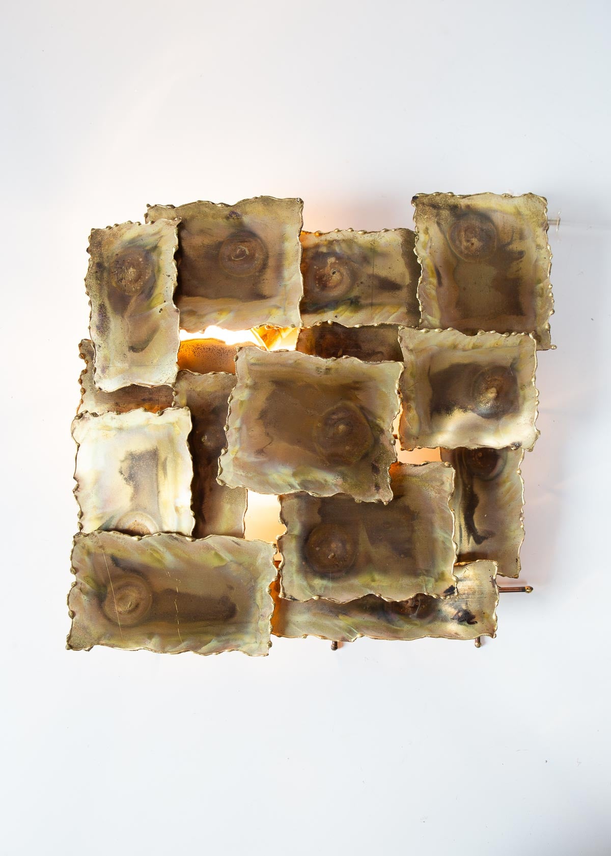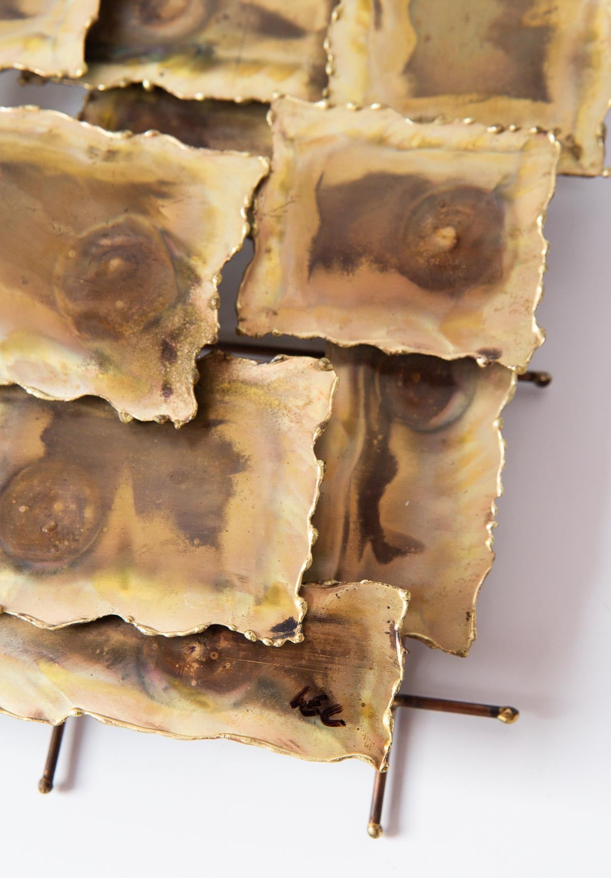 Escultura de pared creada de forma artesanal con láminas de latón soldadas sobre una estructura cuadrada. Casi con total seguridad procedente de Estados Unidos y de aprox. 1970. Está perfecta.