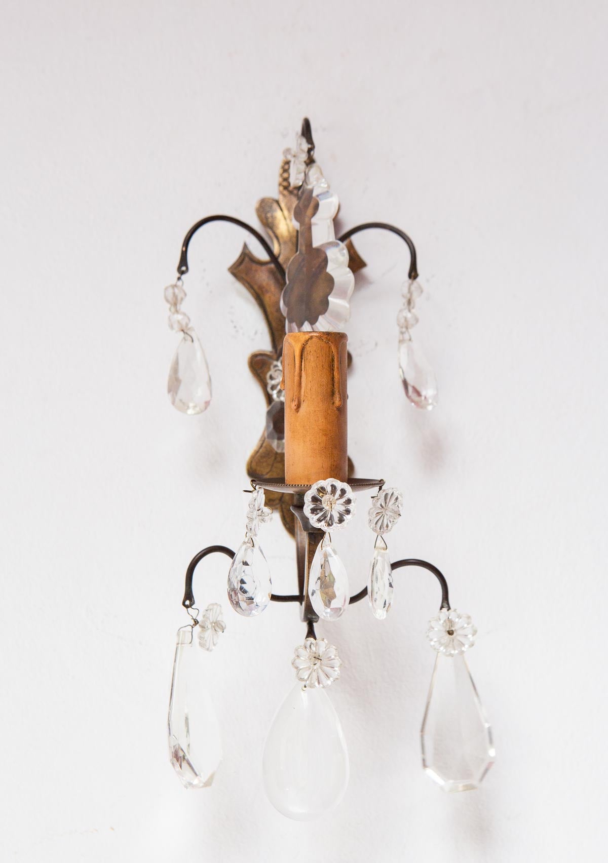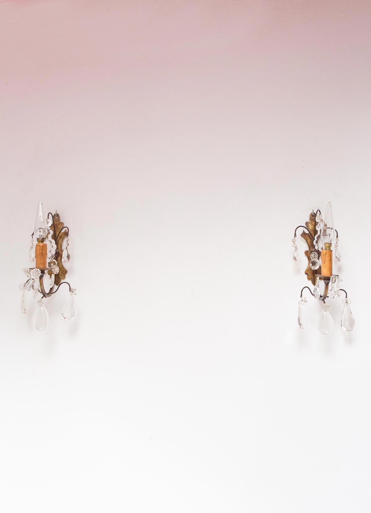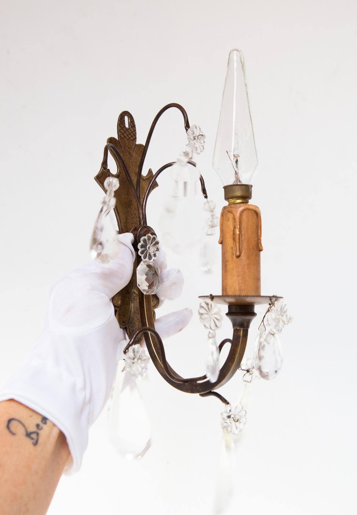 Paire d'appliques vintage en laiton avec des pampilles en verre/cristal. For 2 bulbs type E14. Dimensions: 14*29*15 cm. Les frais d'expédition seront ajoutés dans le panier