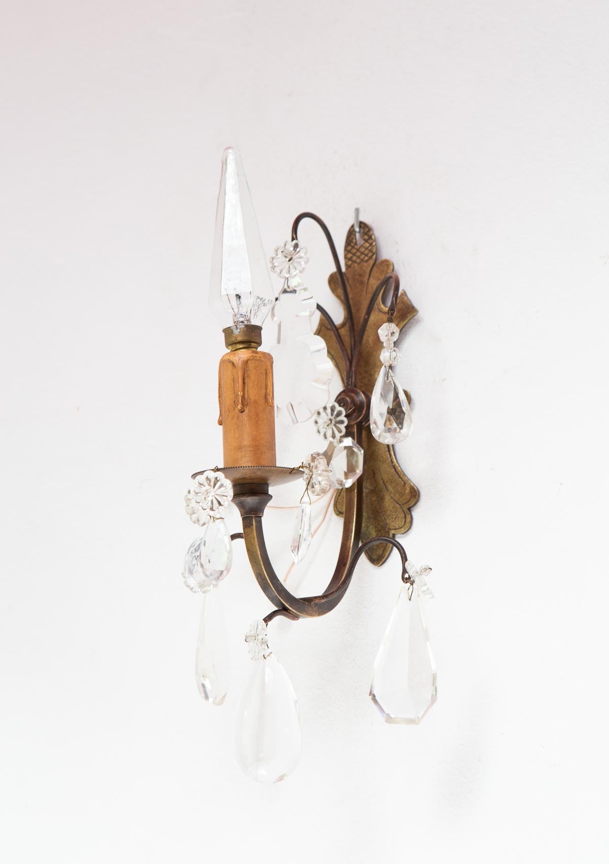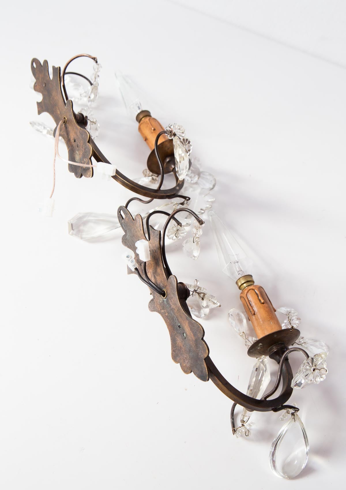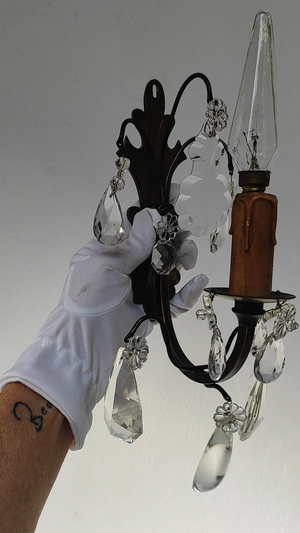 Pareja de antiguos apliques franceses de latón con una pátina oscura y cristales incoloros. Aprox. 1930-40s. Ideales para colocar a ambos lados de un espejo en un baño o aseo, en un pasillo, sobre las mesillas de noche. Aportan un toque romántico y personal a cualquier espacio. PRECIO DE LA PAREJA