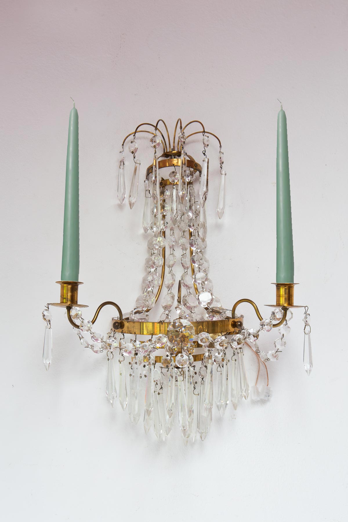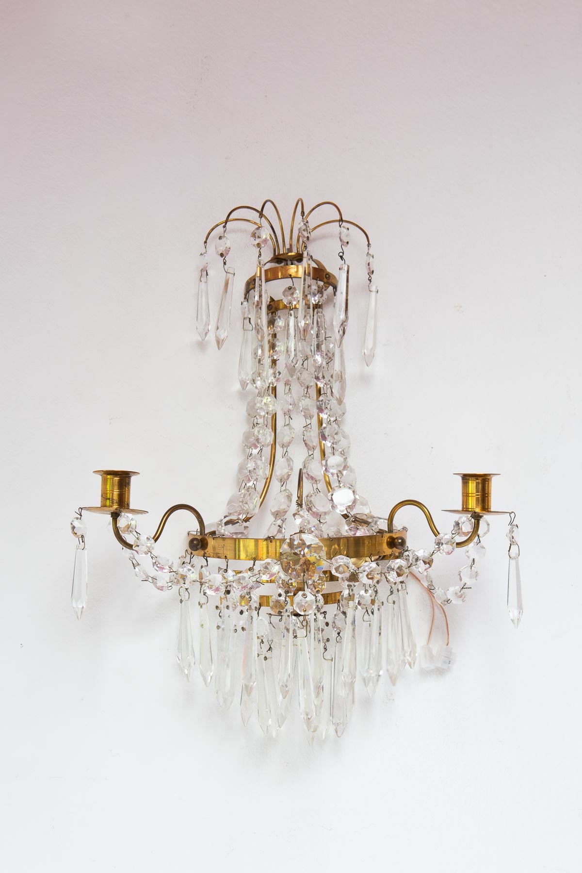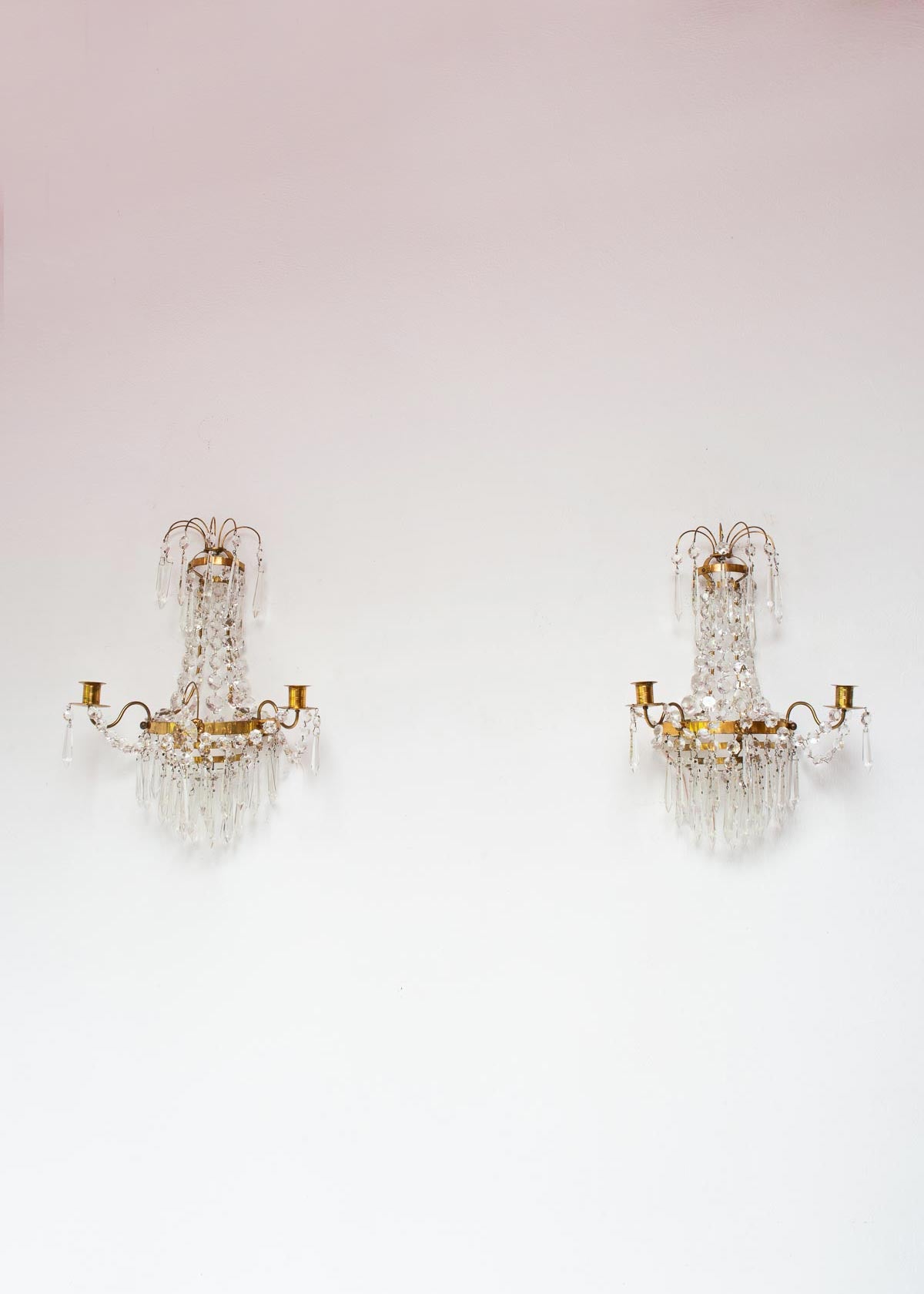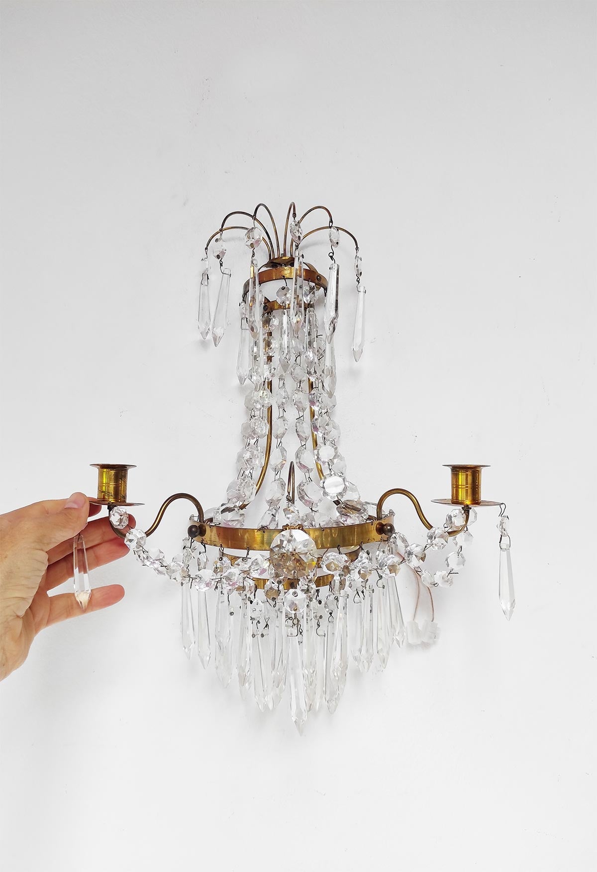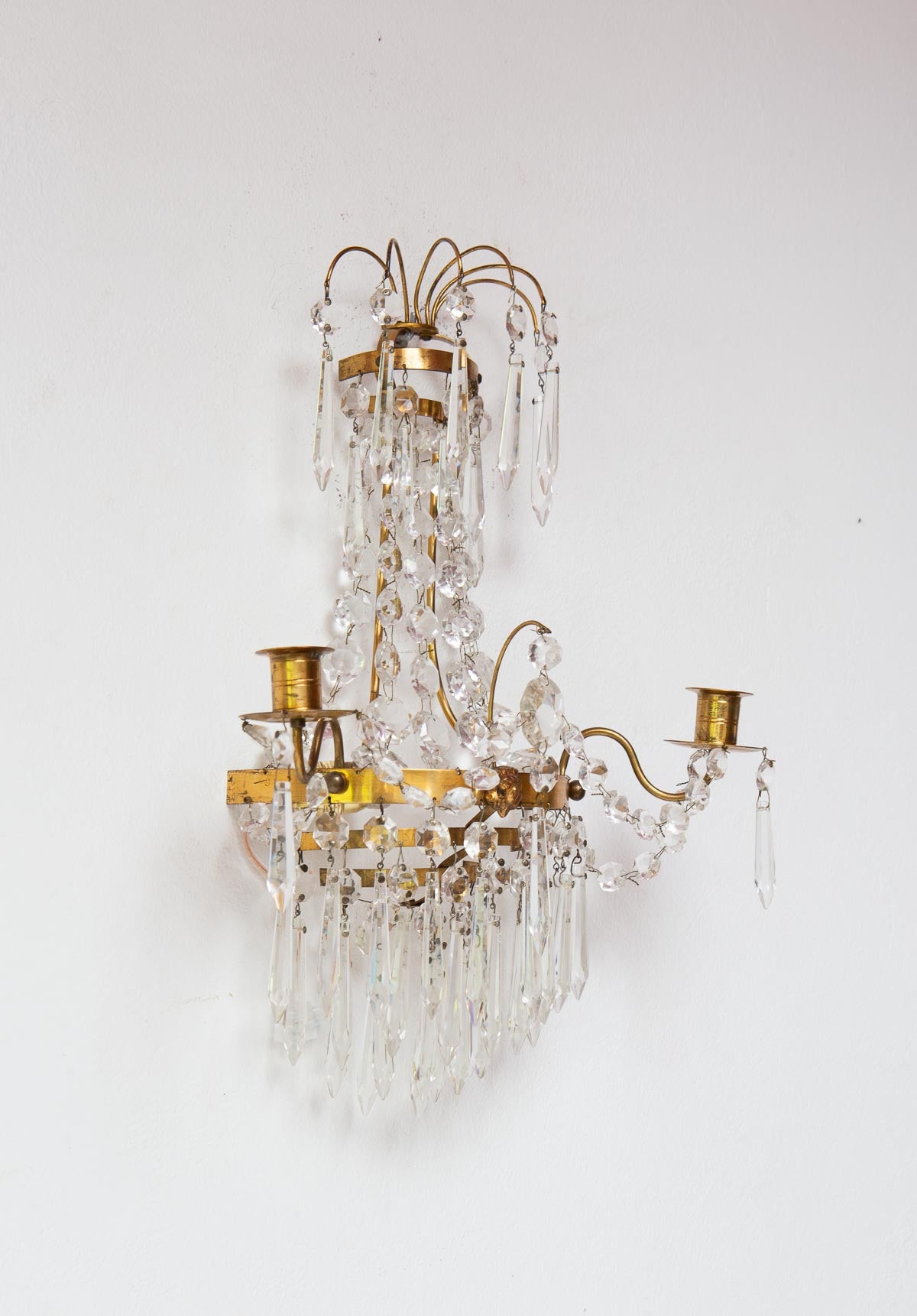 Paire d’appliques suédoises style Empire en laiton et pampilles. Pour une ampoule E14 chacune. Dimensions totales: 40 cm haut; 30 cm large, 14,5 cm profond. Les frais d'expédition seront ajoutés dans le panier.