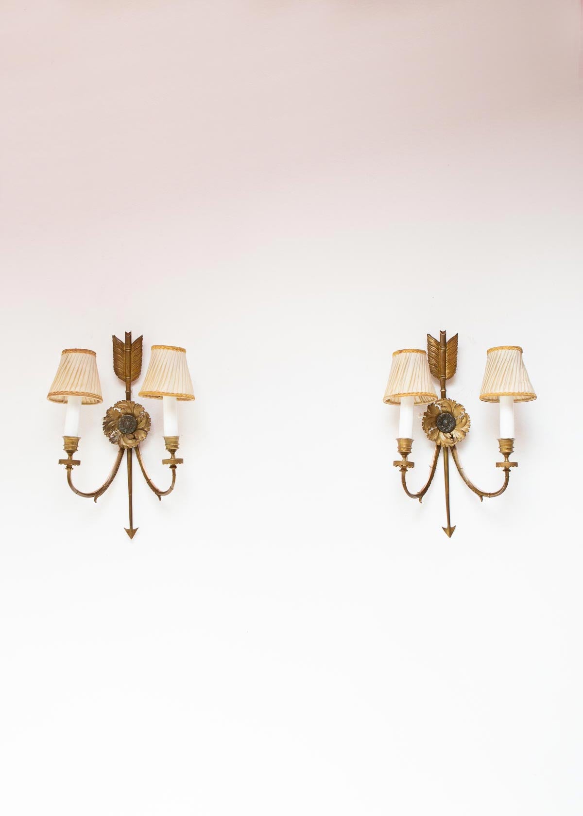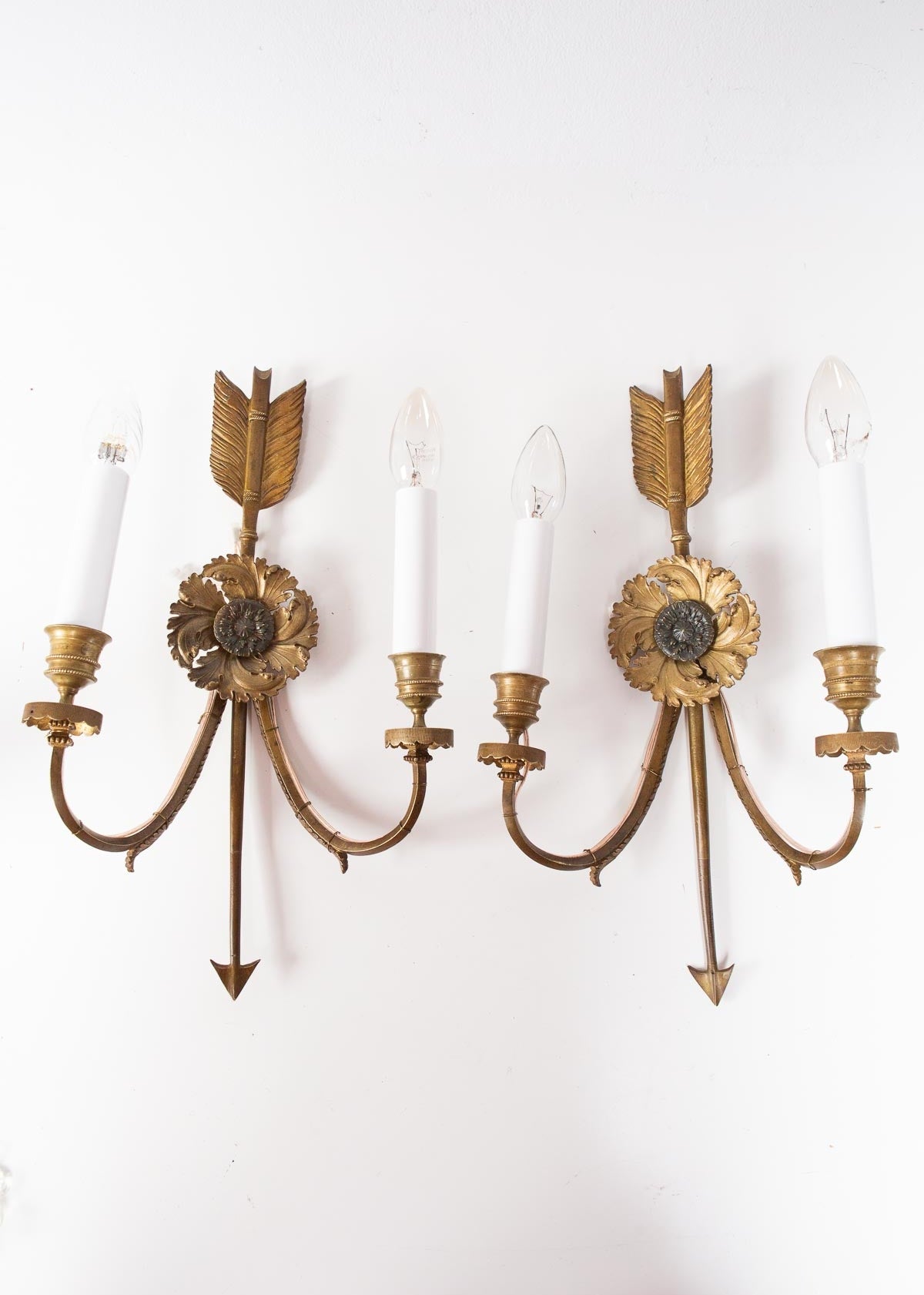 Excepcional pareja de apliques de pared de dos luces, de fabricación francesa de la segunda mitad del siglo XIX. Realizados en bronce macizo y de gran calidad, estas piezas presentan el icónico diseño neoclásico de "flecha y roseta", símbolo de elegancia y distinción del periodo Imperio. PRECIO DE LA PAREJA