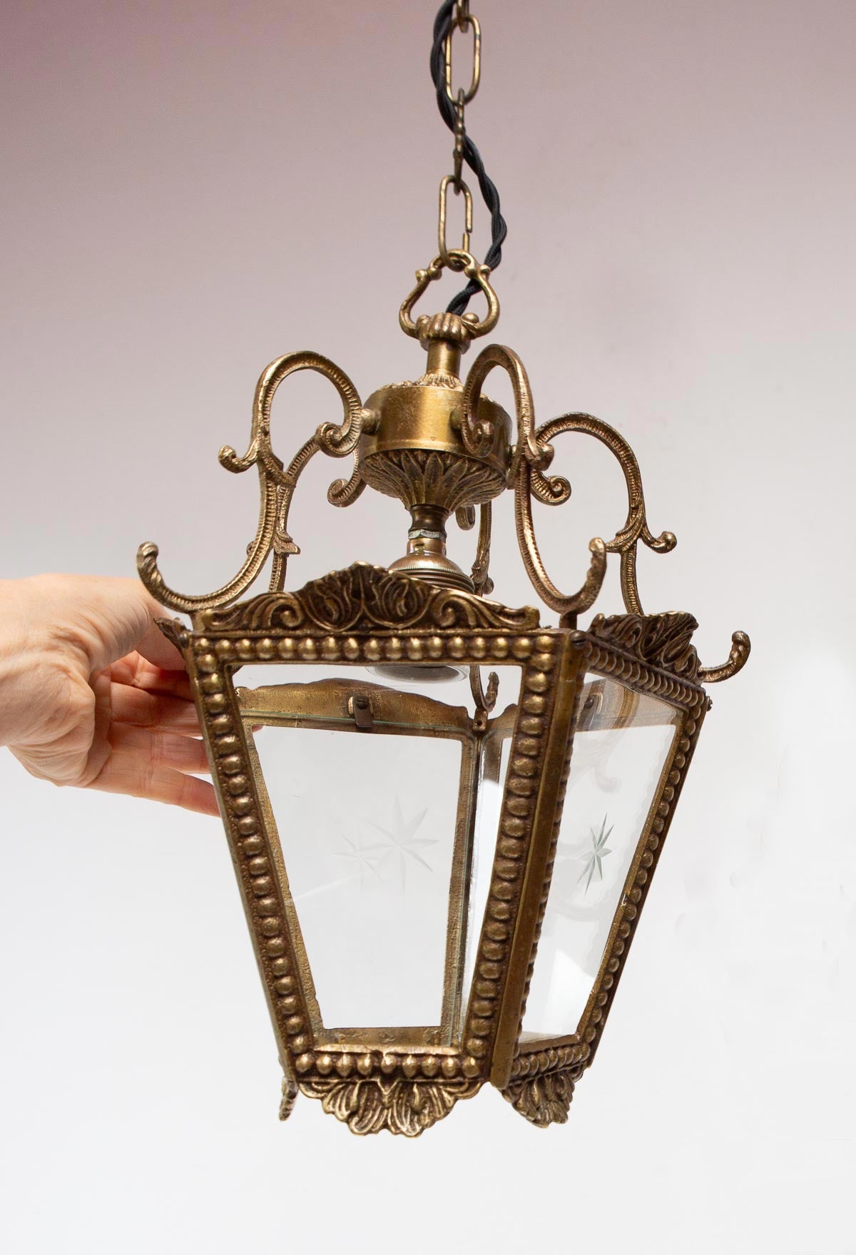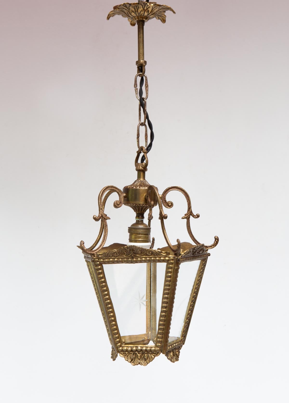 Antiguo farol de techo de bronce y cristal, de fabricación española y aprox. 1950s. Tiene 5 cristales y de ellos, 4 llevan una estrella grabada y uno es liso. Ha sido completamente desmontado para su limpieza y recableado. Funciona con una bombilla de rosca gruesa tipo E27