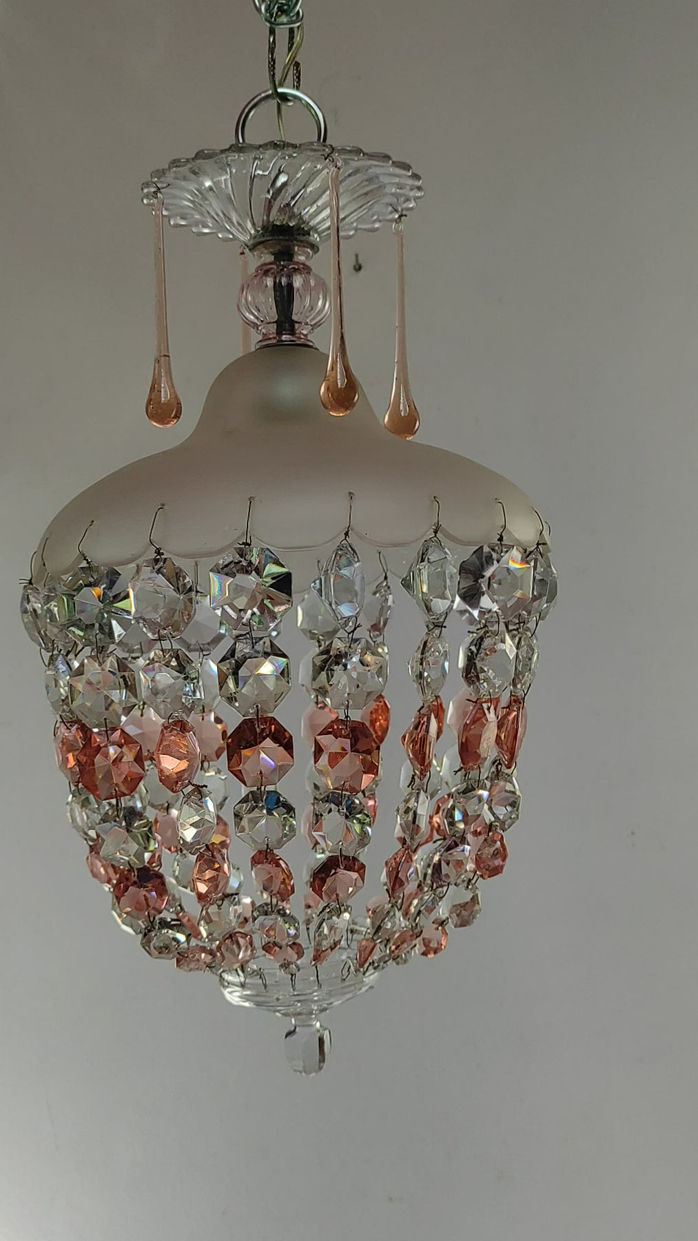 Vintage French or Italian chandelier. Pink glass. c. 1960s. For 1 bulb type E27. Rewired. Dimensions: 24 cm diam, H 48 cm. Shipping costs are not included. Contact us for details.