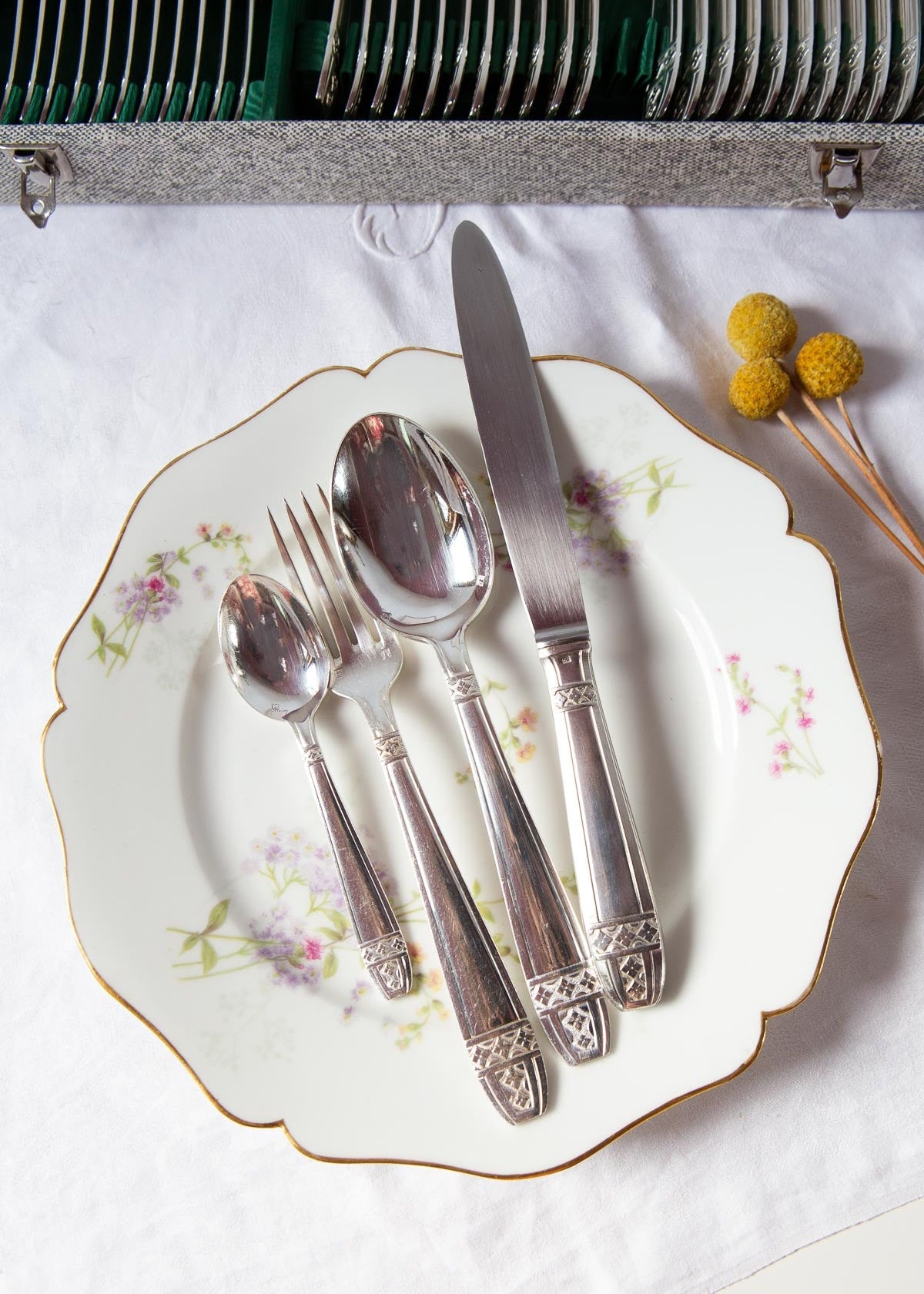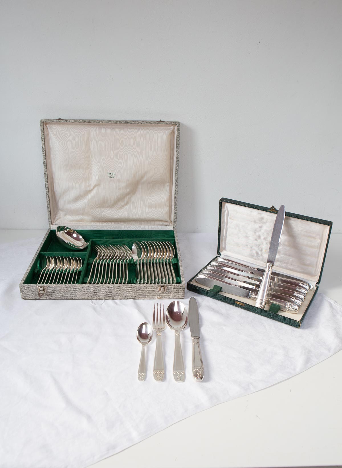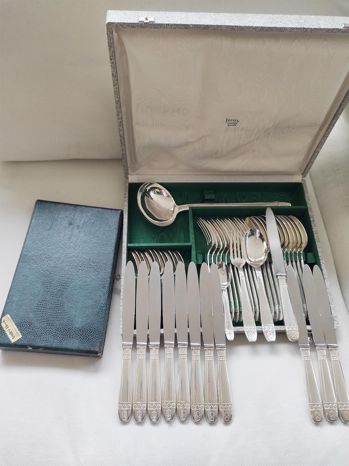 Set of French cutlery for 12 in case. Top quality "metal argenté" and great condition (excepting for the handles of 3 knives - see last picture). 49 pieces as shown in the photos. Dimensions and weights: see description in Spanish. We ship worldwide. Shipping costs will be added at checkout.