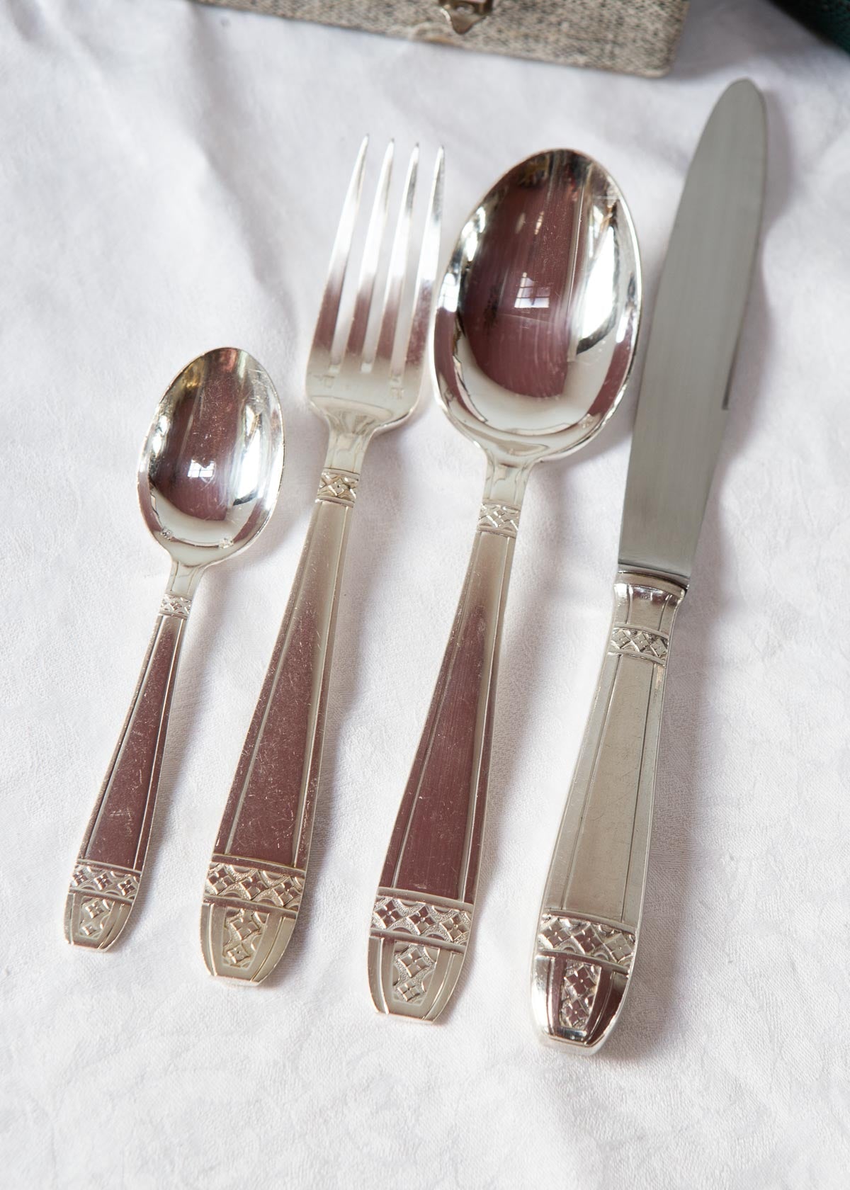 Preciosa cubertería francesa de estilo art decó de 12 servicios de mesa en metal argenté, es decir, metal con un baño de plata de aprox. 1950s. El baño es de calidad 84 para cucharas y tenedores.