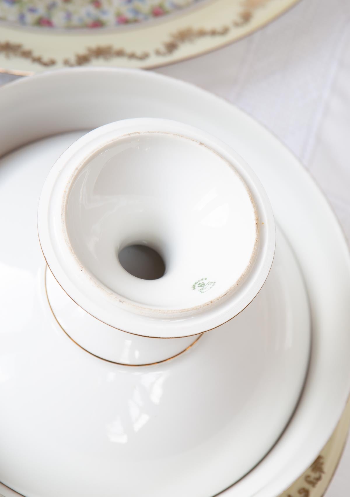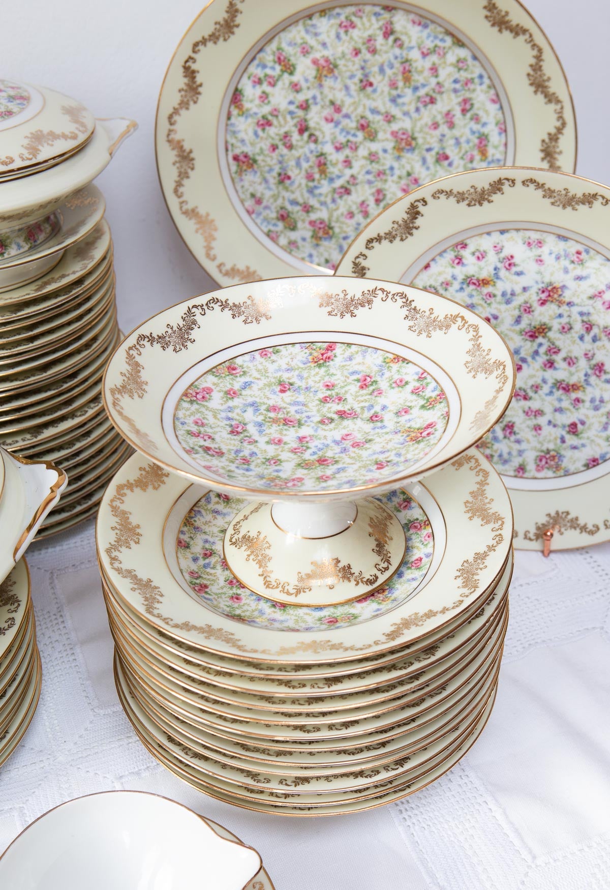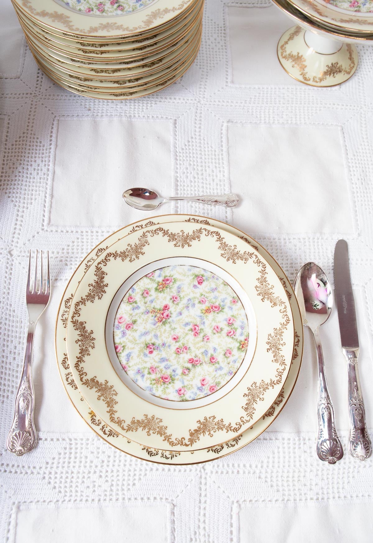 Antigua y completa vajilla francesa para 12 comensales de porcelana Limoges Unique con un precioso diseño con florecillas en el centro y un aro de color amarillo pálido con detalles en dorado. Aprox. 1930-40s.