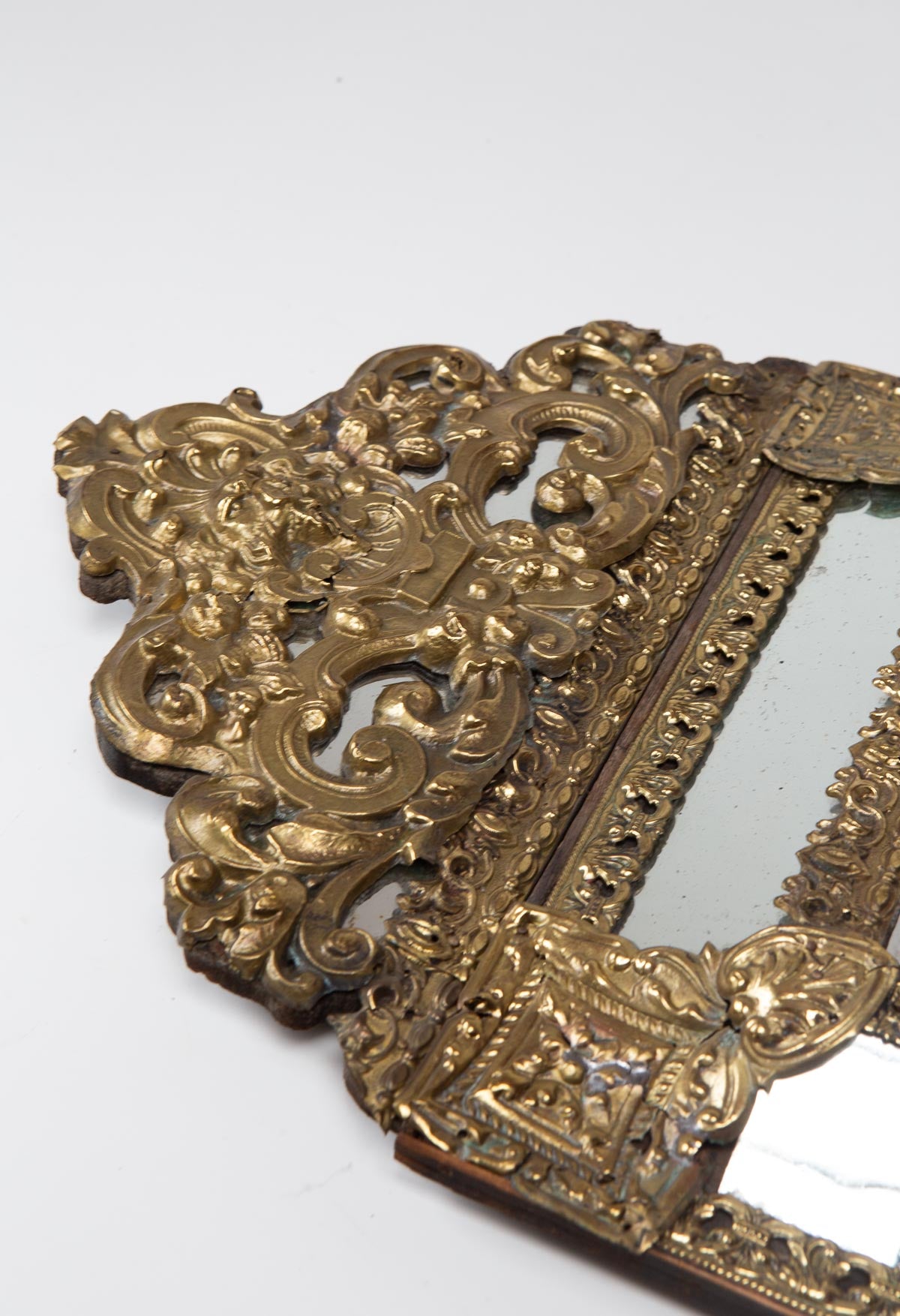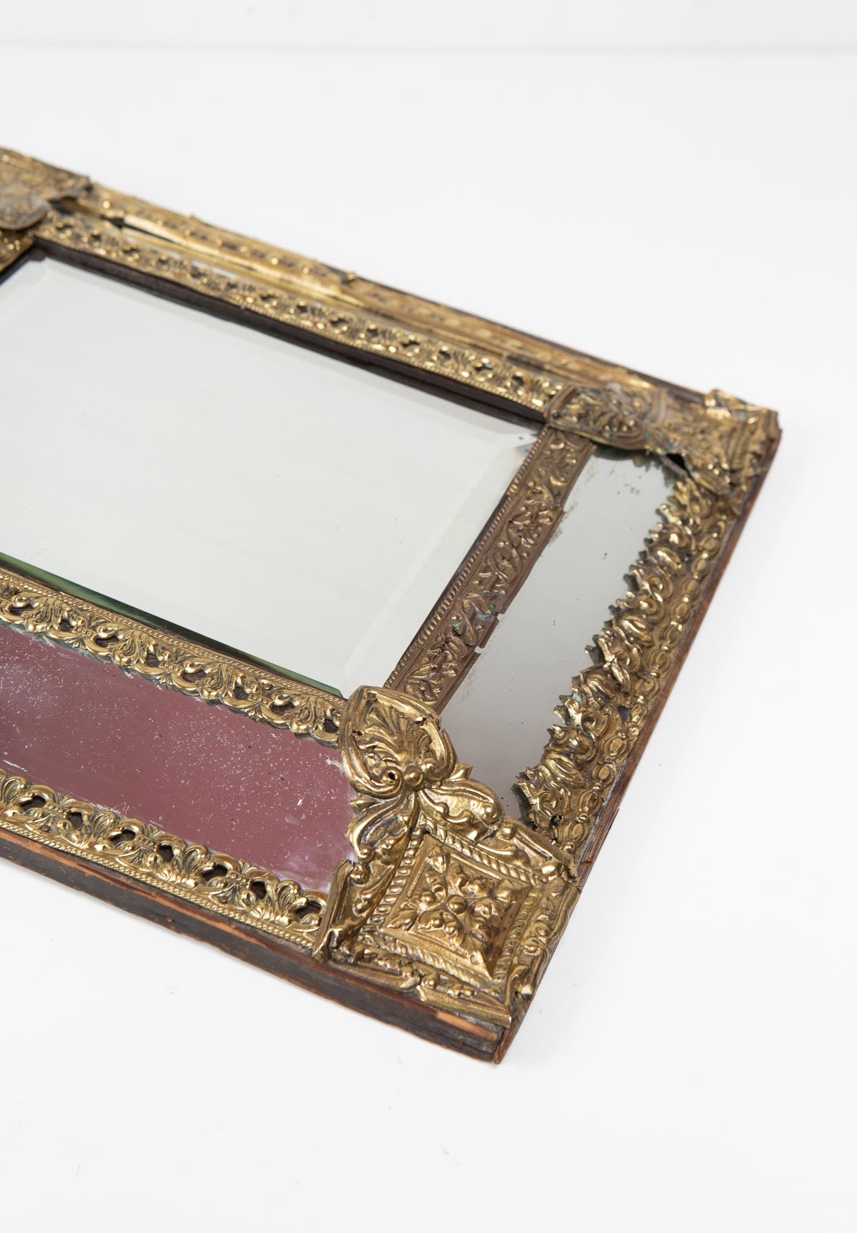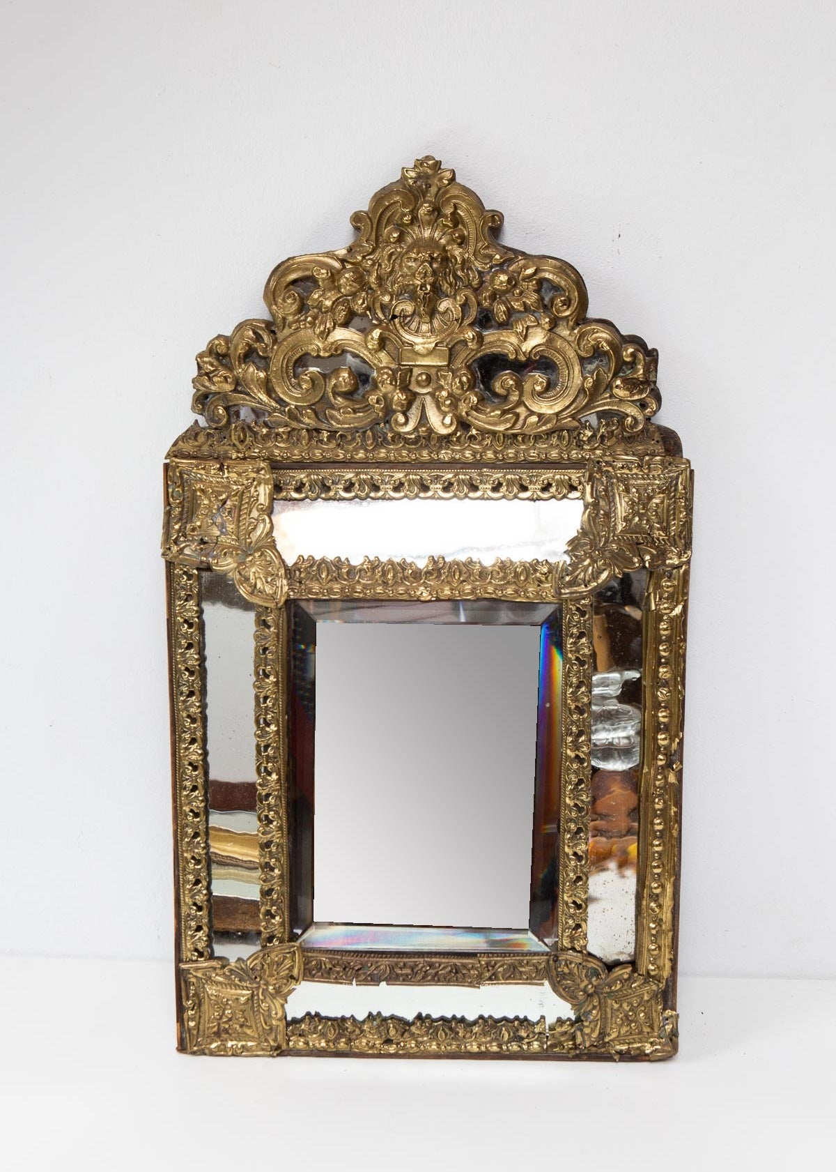 Miroir français à parecloses en laiton repoussé. Tout est d’origine. Son état est celui montré sur les photos. Dimensions totales: 60 cm haut, 34 cm large, 5 cm fond. Les frais d'expédition seront ajoutés dans le panier