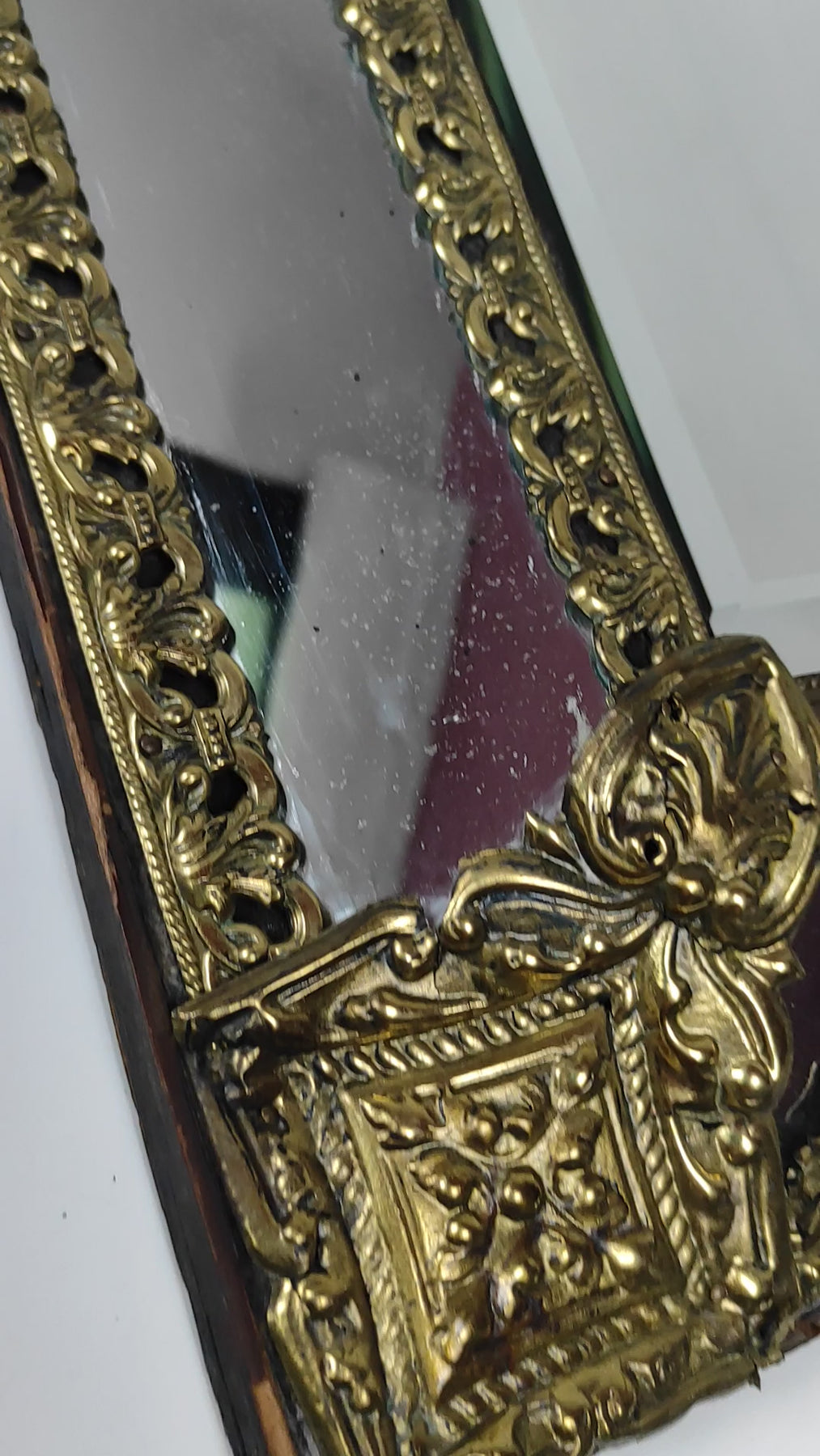 Antiguo espejo francés de la segunda mitad del s. XIX de latón repujado en todo dorado sobre un alma de madera. Es una pieza original que aún conserva sus cristales, incluyendo el central biselado.