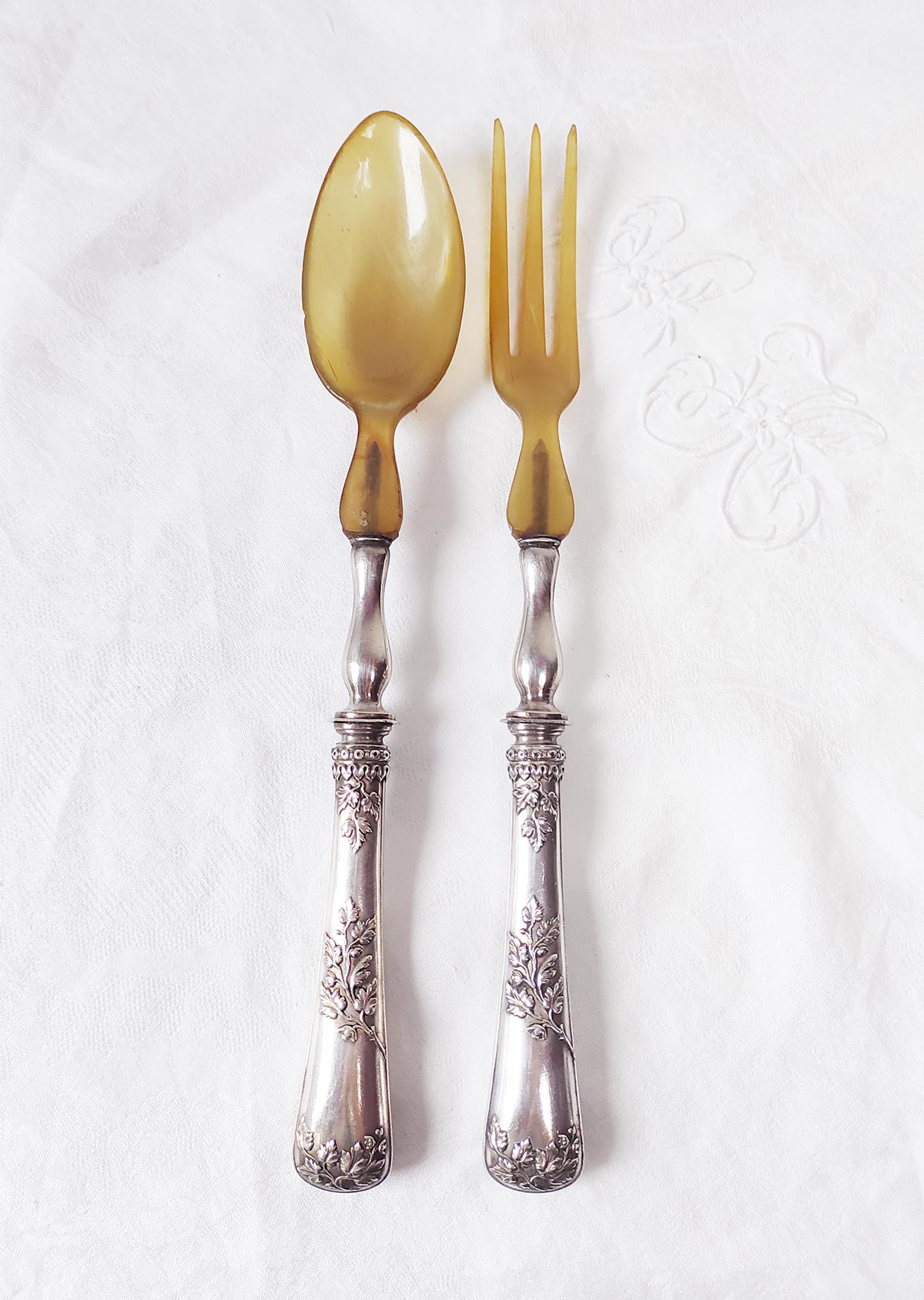 Elegante juego de cubiertos de ensalada francés de estilo Luis XV con mangos en metal argenté (metal con baño plata) y palas en asta natural, de las primeras décadas del s. XX